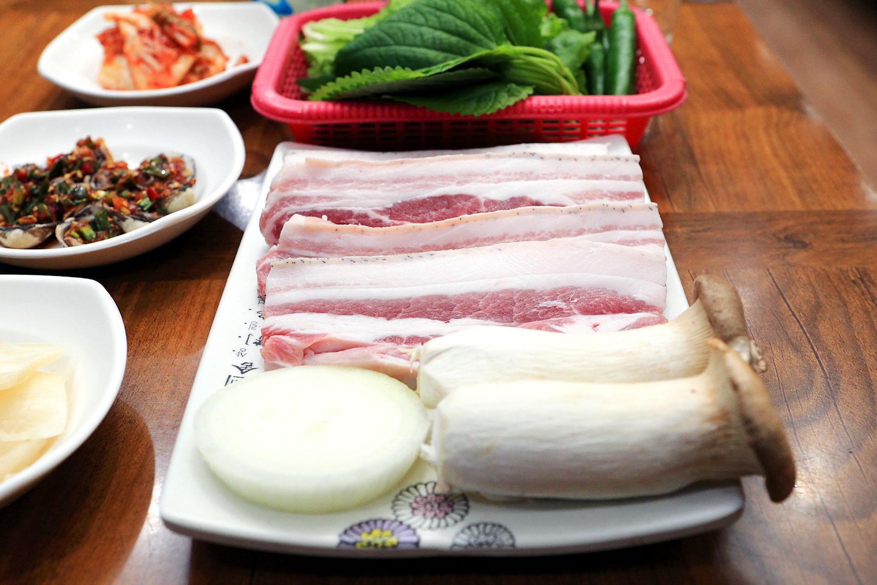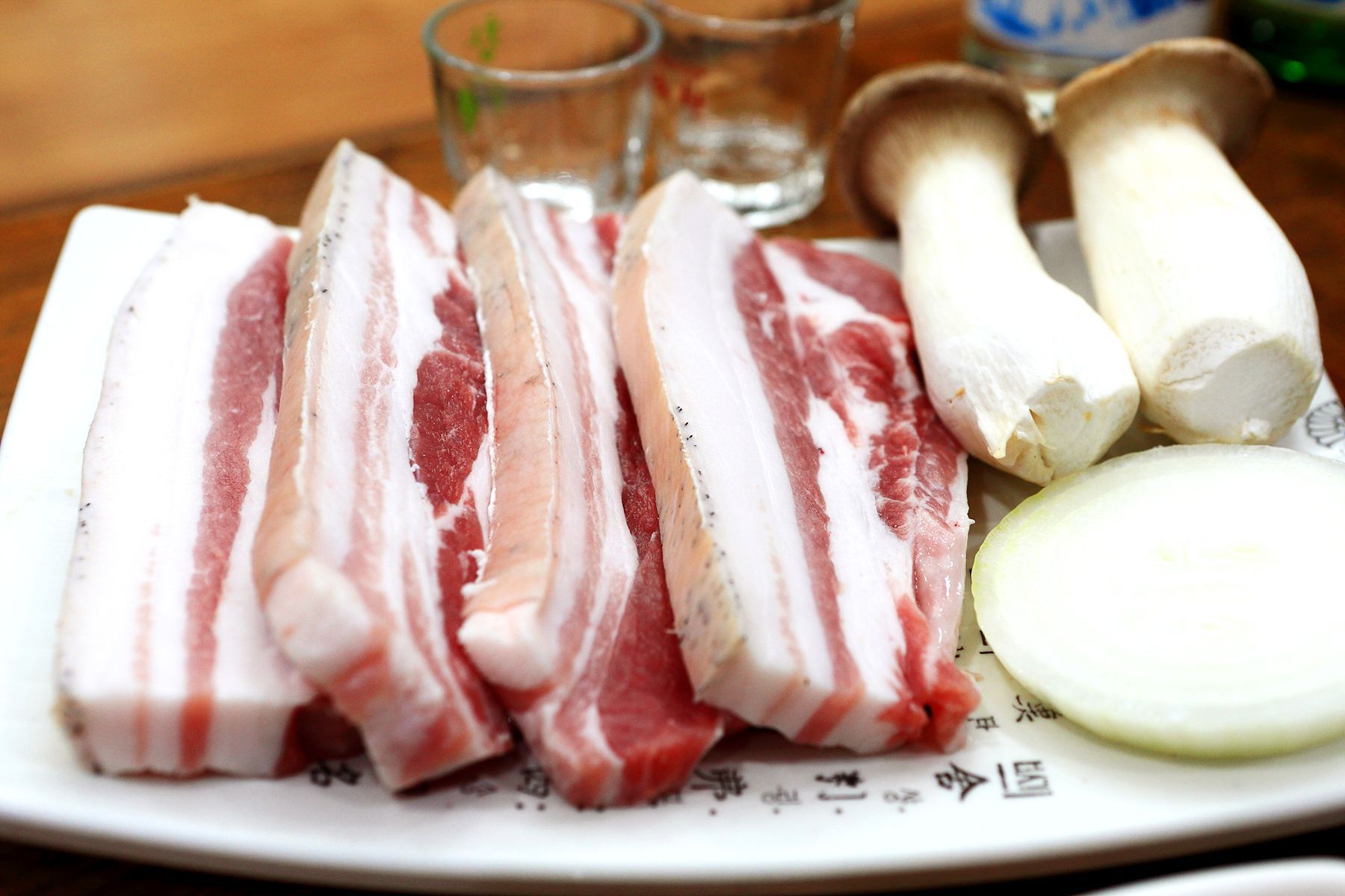 두툼하면서 색도 선명하고 예쁜 오겹살과 함께 곁들여 먹으면 맛 좋은 버섯도 같이 나오며