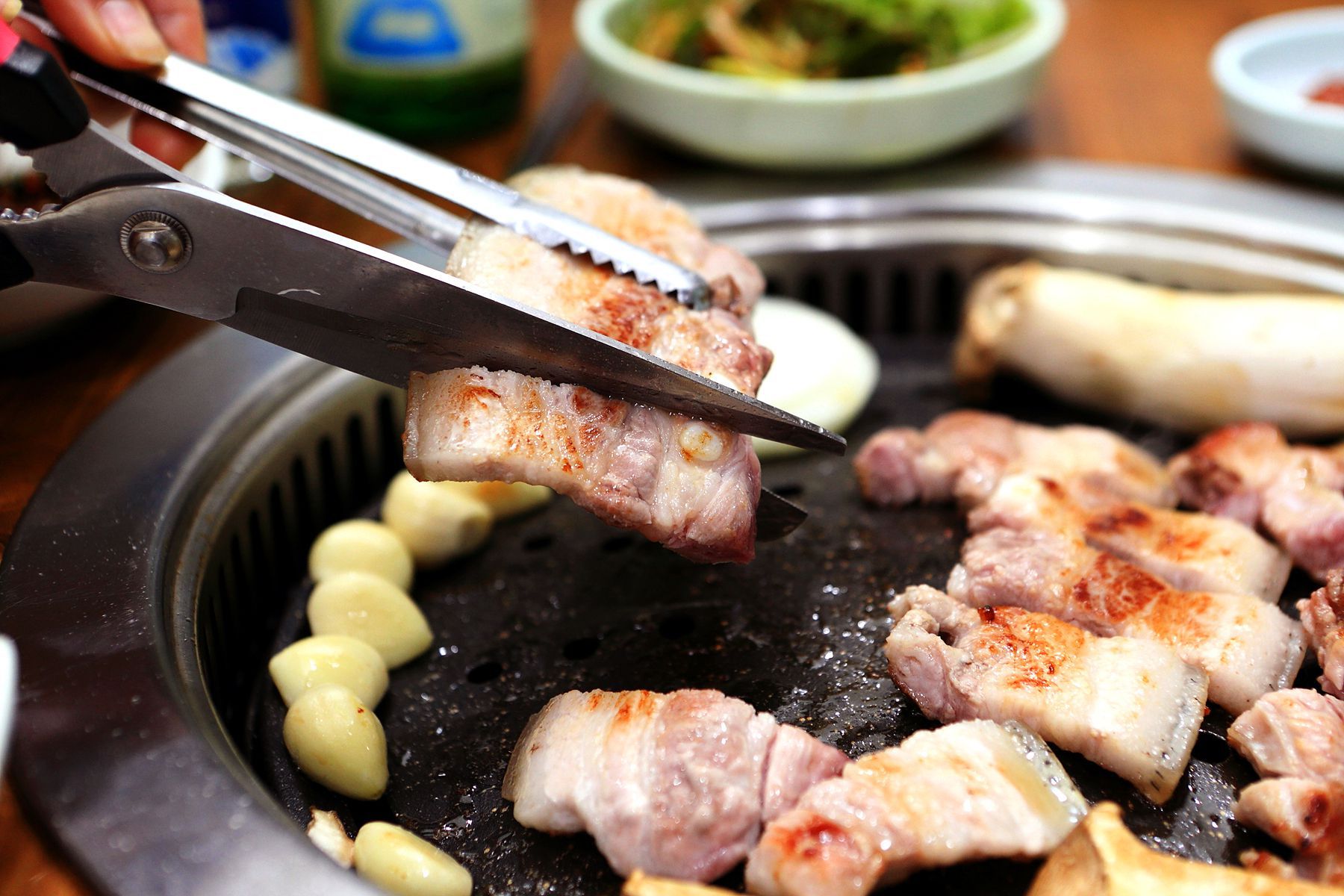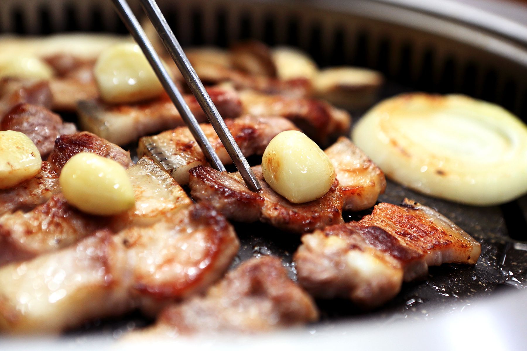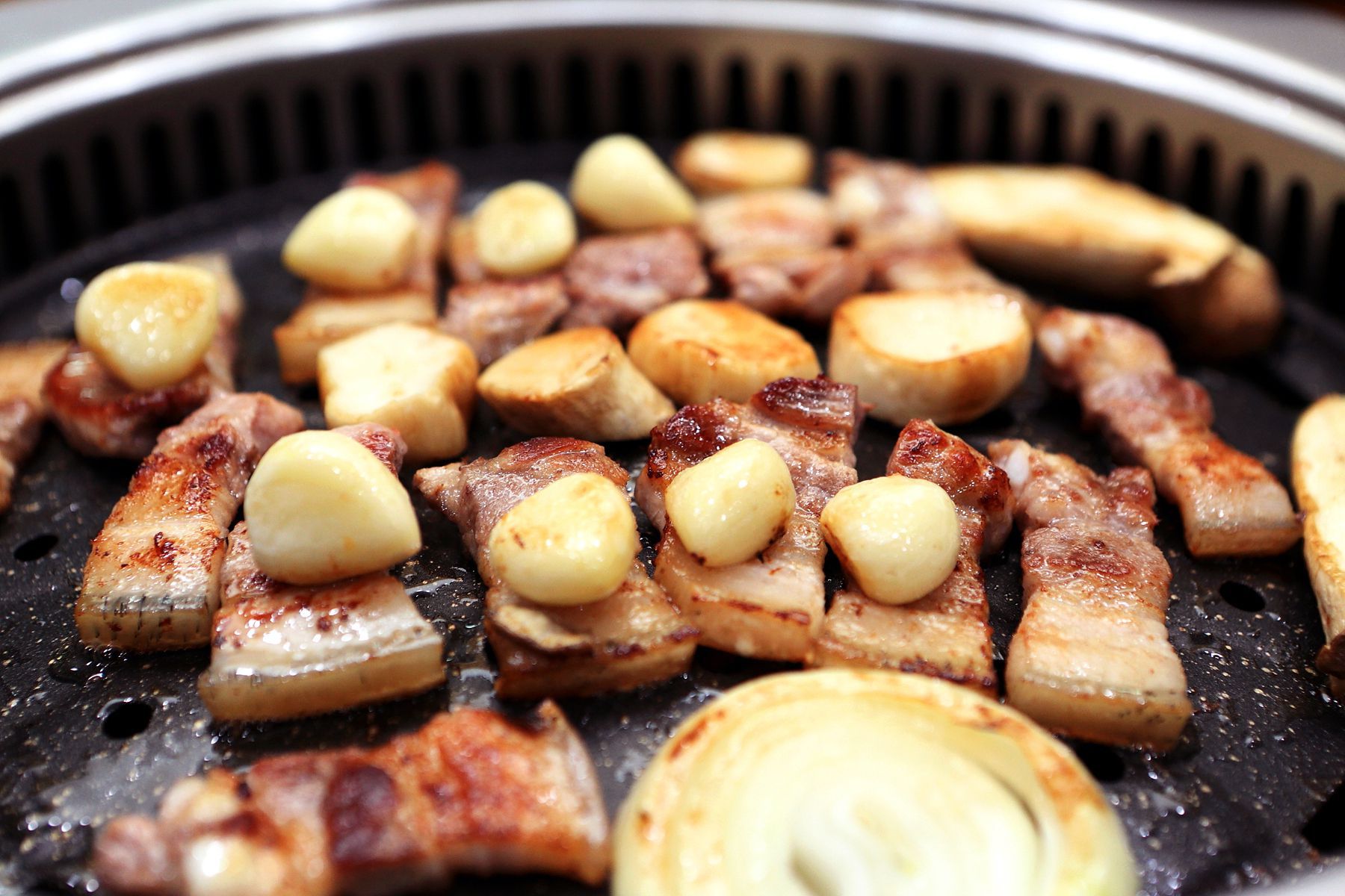 노릇노릇 잘 구워진 오겹살을 먹기 좋게 잘라 구운 통마늘과 함께 즐겨도,
