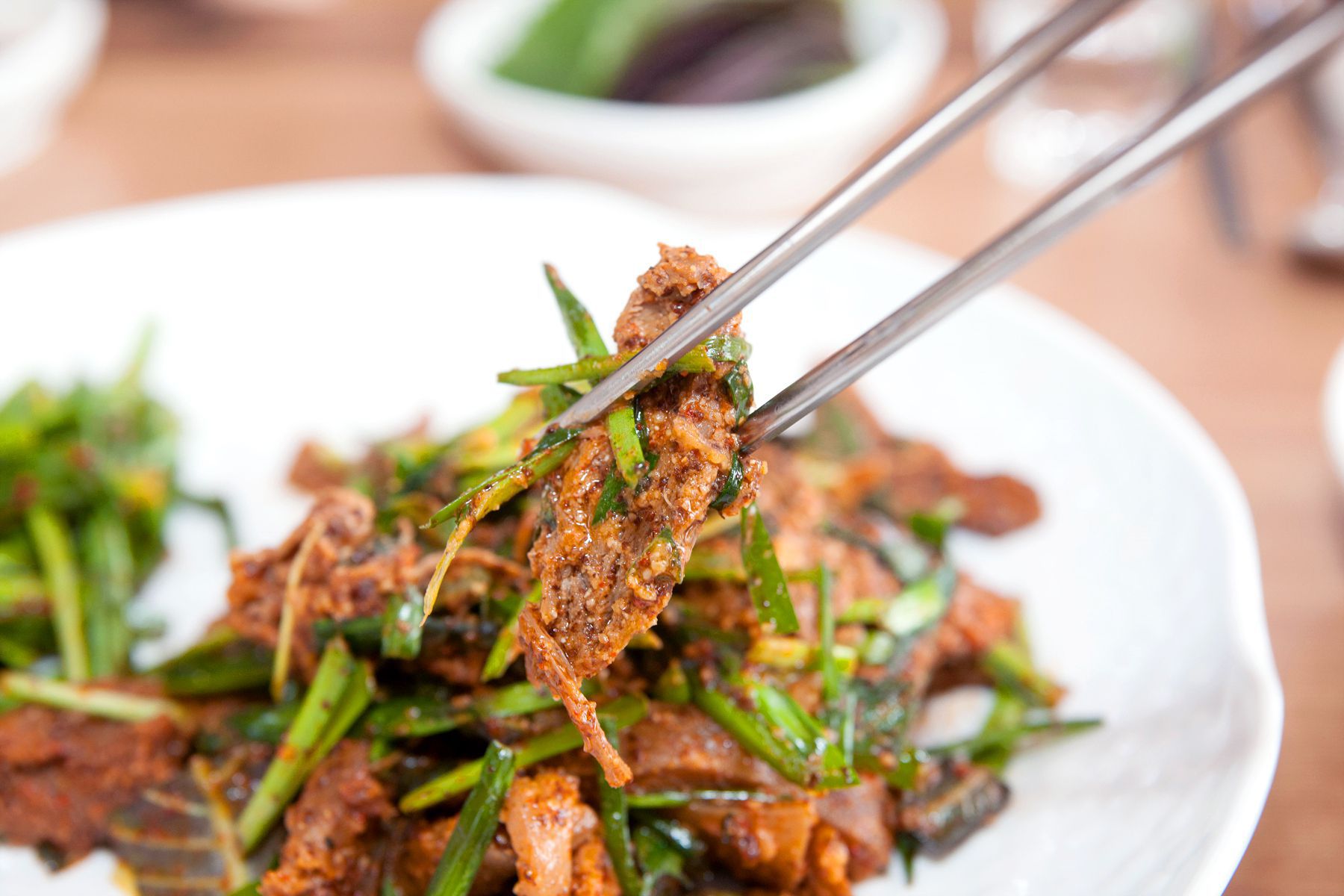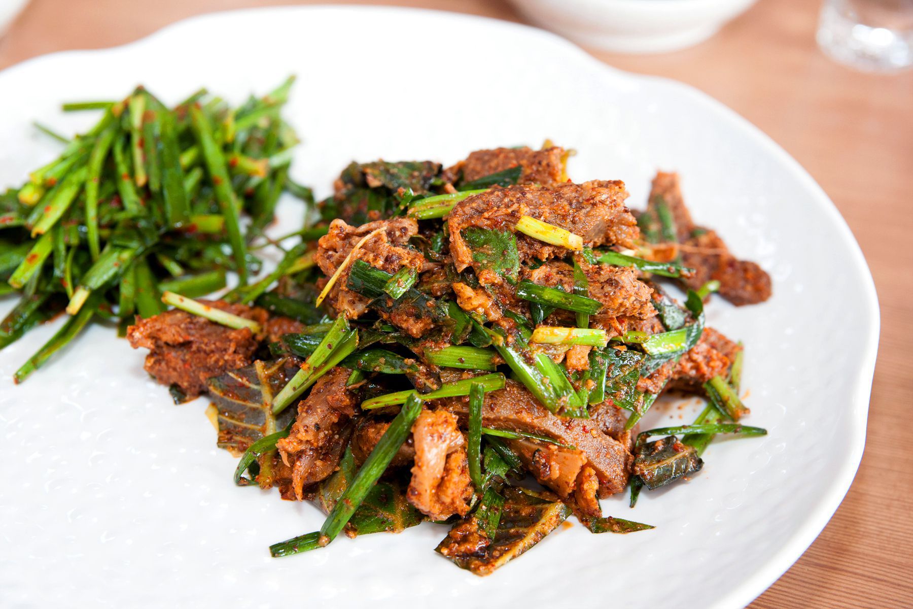 흑염소를 드실 때 빠질 수 없는 부추 무침 없이 수육을 더욱 맛있게 만들어 줍니다.