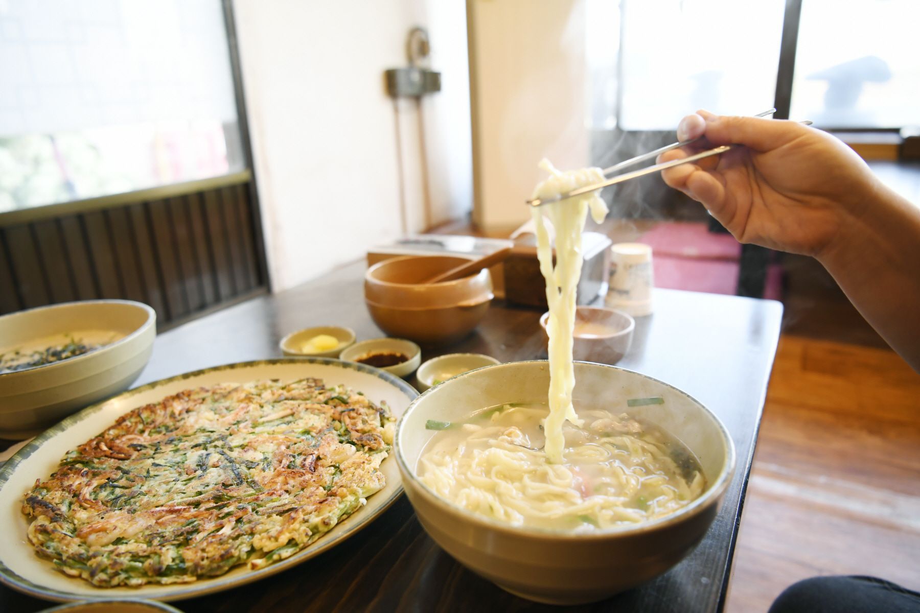 맛있는 파전에 동동주는 찰떡궁합으로 비오는 날에는 파전을 굽느라 바쁜 뜨락전통칼국수입니다.!^^