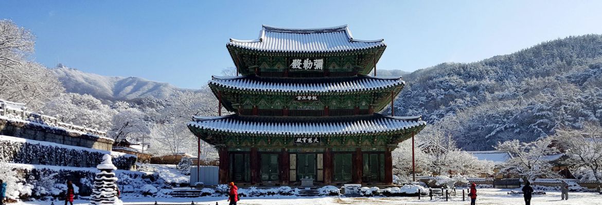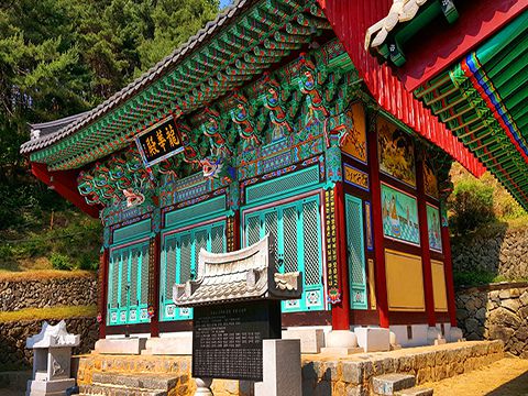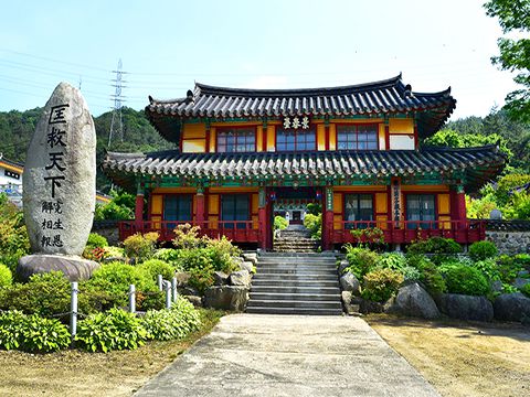 화사한 꽃들로 아름답게 꾸며진 정원 속 사찰