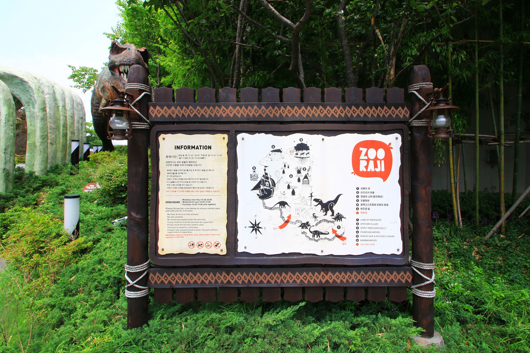 공룡의 땅, 아프리카 마을, 정령의 나무(회전목마), 빗물정원, 블랙고스트호와 비밀의 동굴, 바오밥 숲으로
