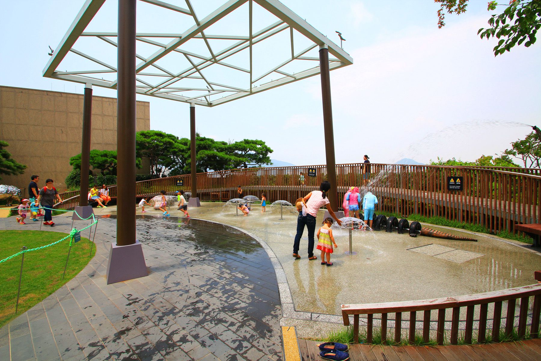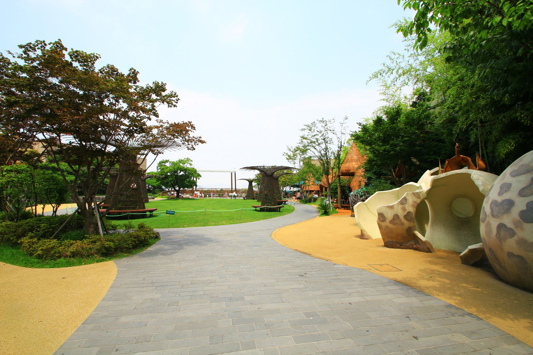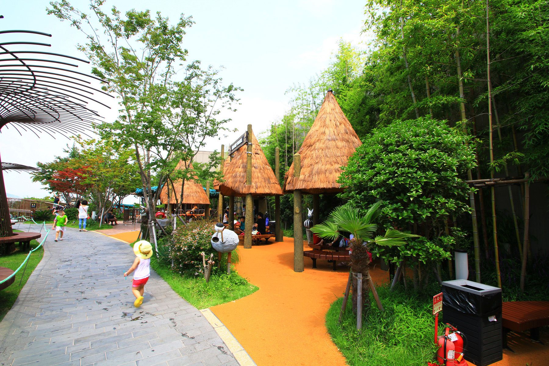 형상화 하고 있는 아프리카 마을, 바닥분수와 안개분수가 있어 여름 더위까지 한 방에 날려주는 빗물정원, 즐거움을