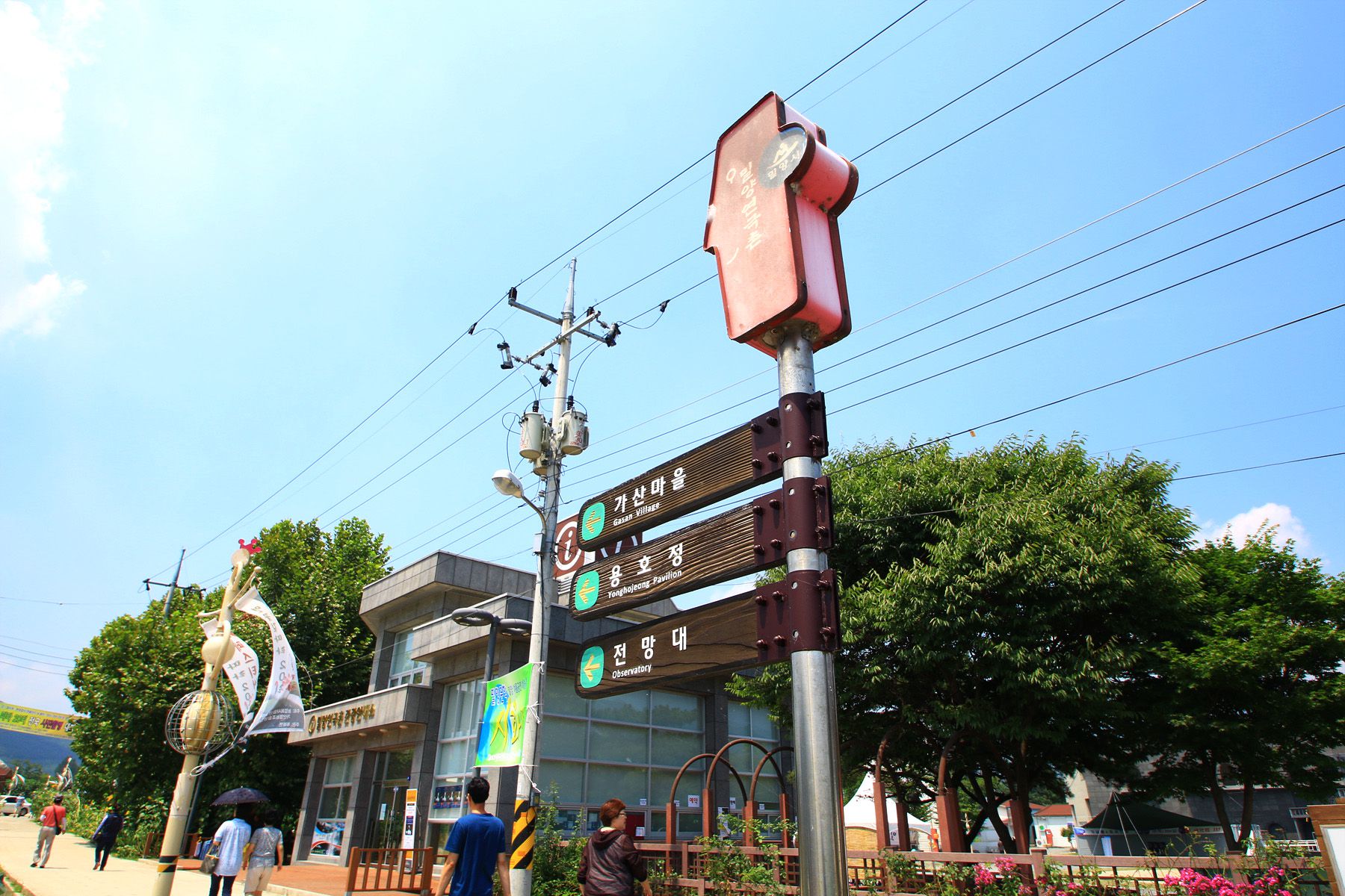 옛날 정자처럼 뾰족한 지붕에 처마가 살짝 들린 모양을 하고 있네요.