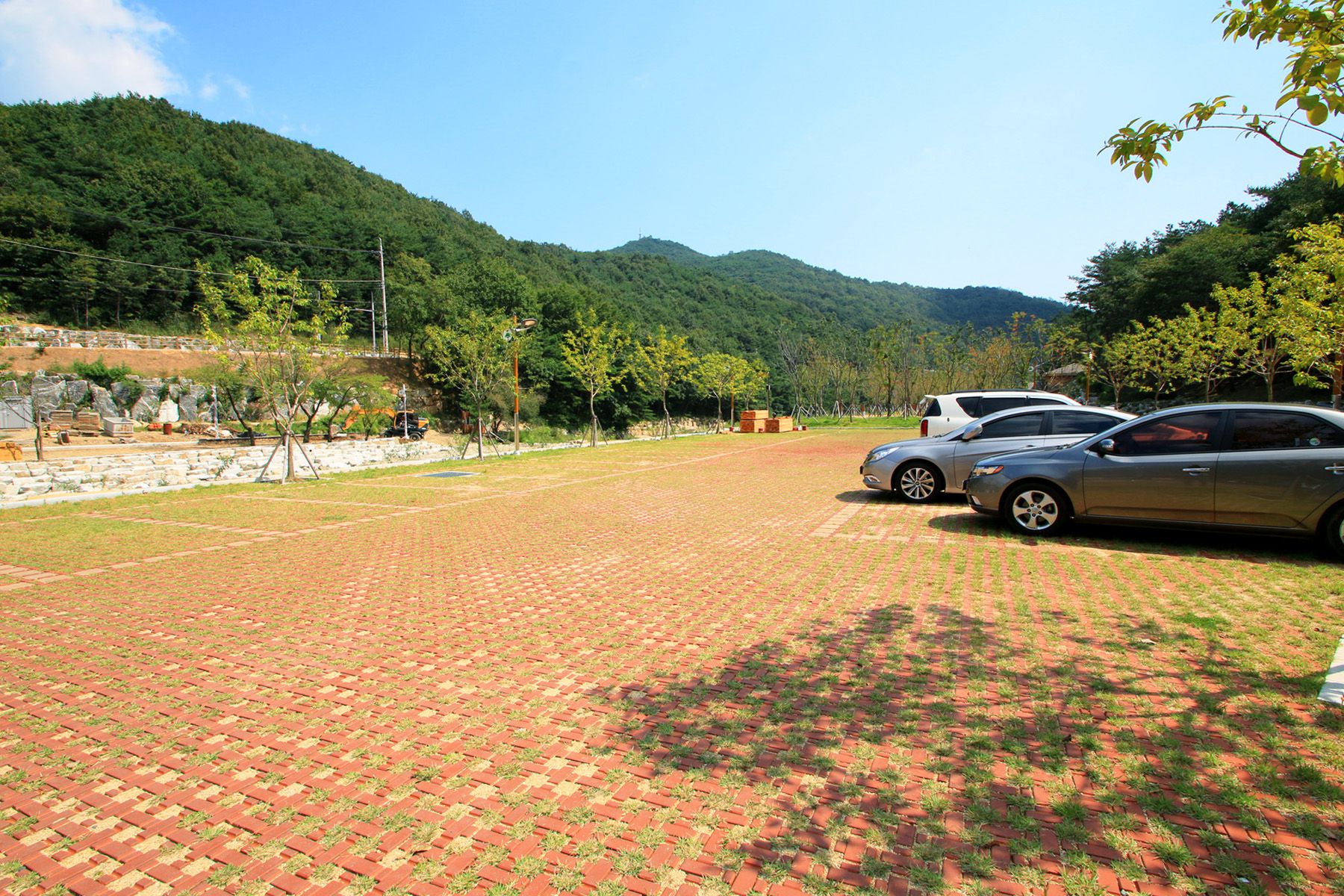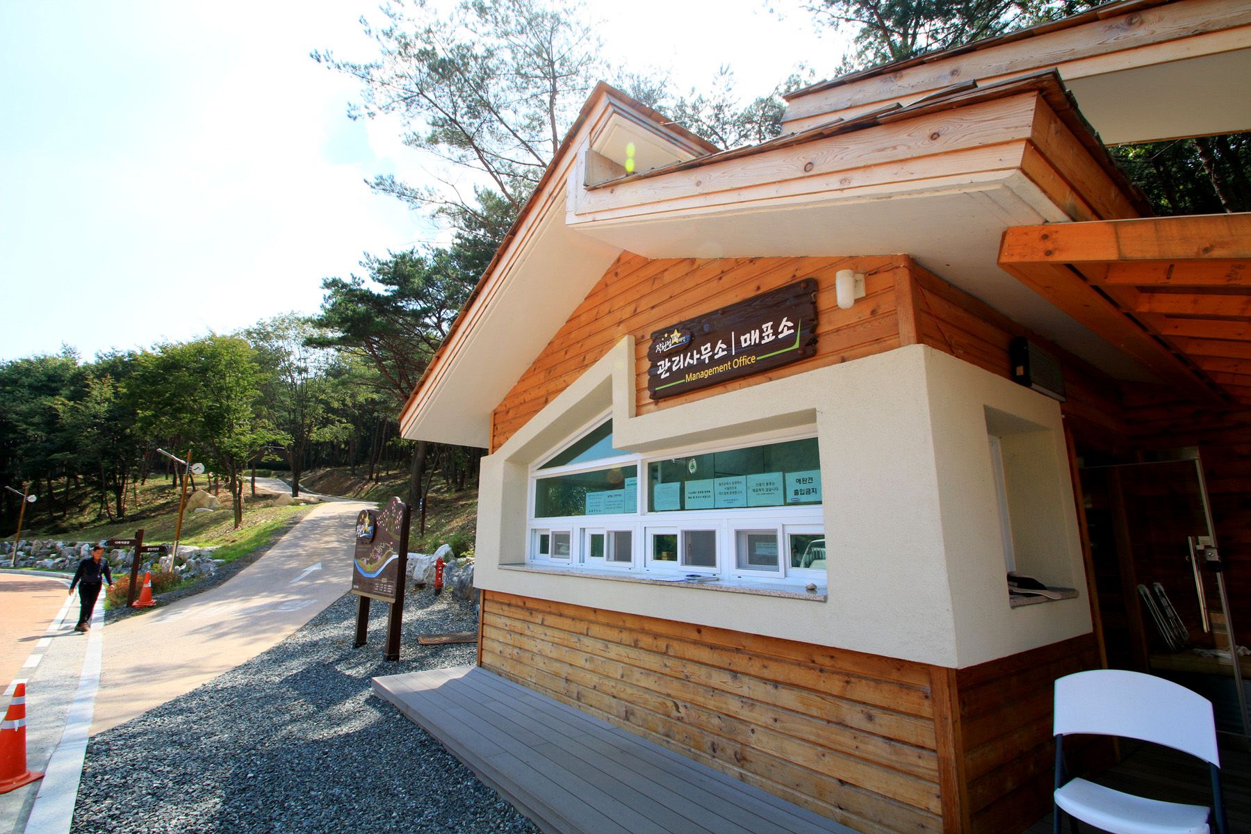 깔끔하게 정비되어 있는 넓은 주차공간과 나무로 잘 지어진 관리사무소부터