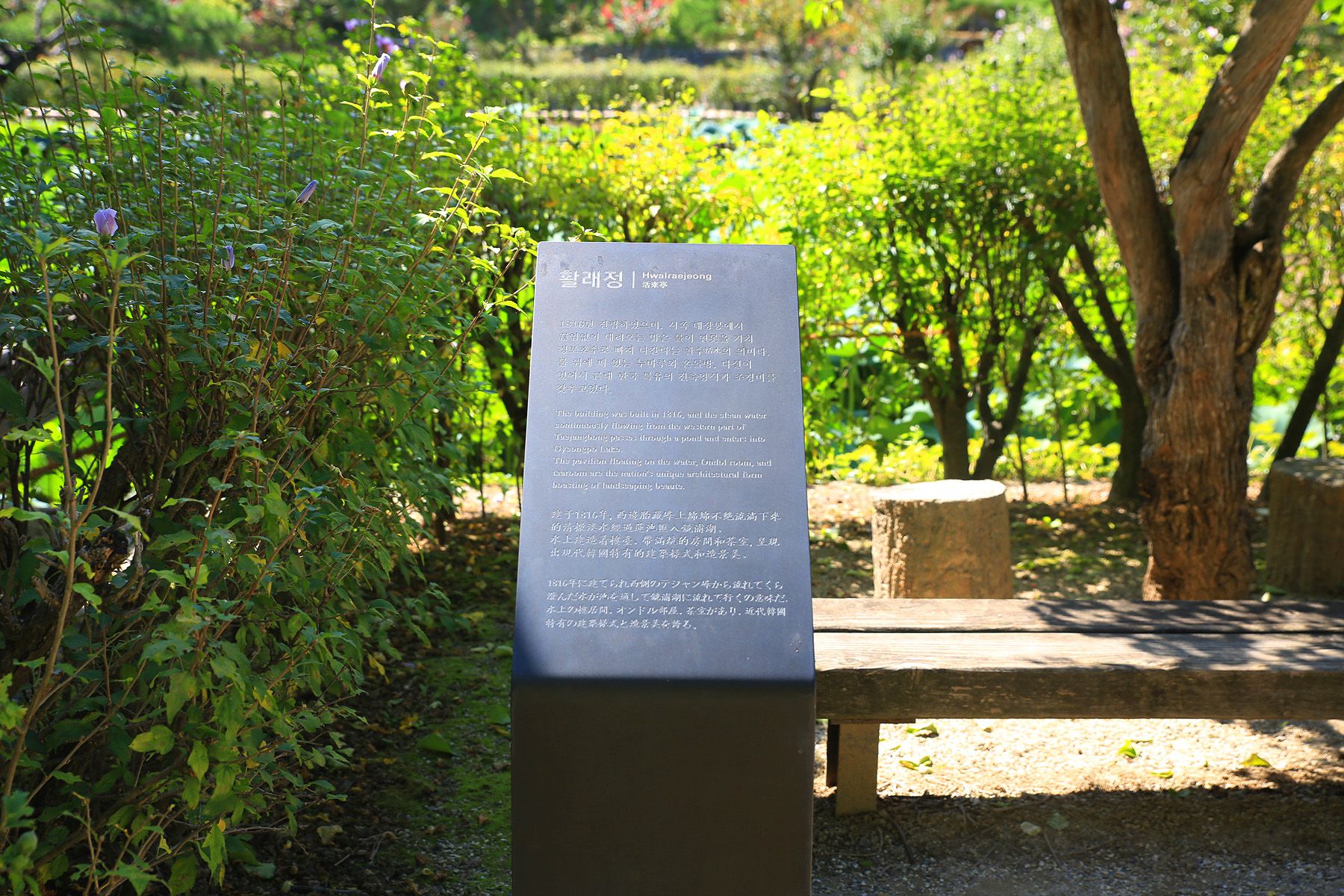 활래정은 연못 속에 네 개의 돌기둥을 세워 건물을 지은 건물로 물 위에 떠 있는 모습을 하고 있습니다.