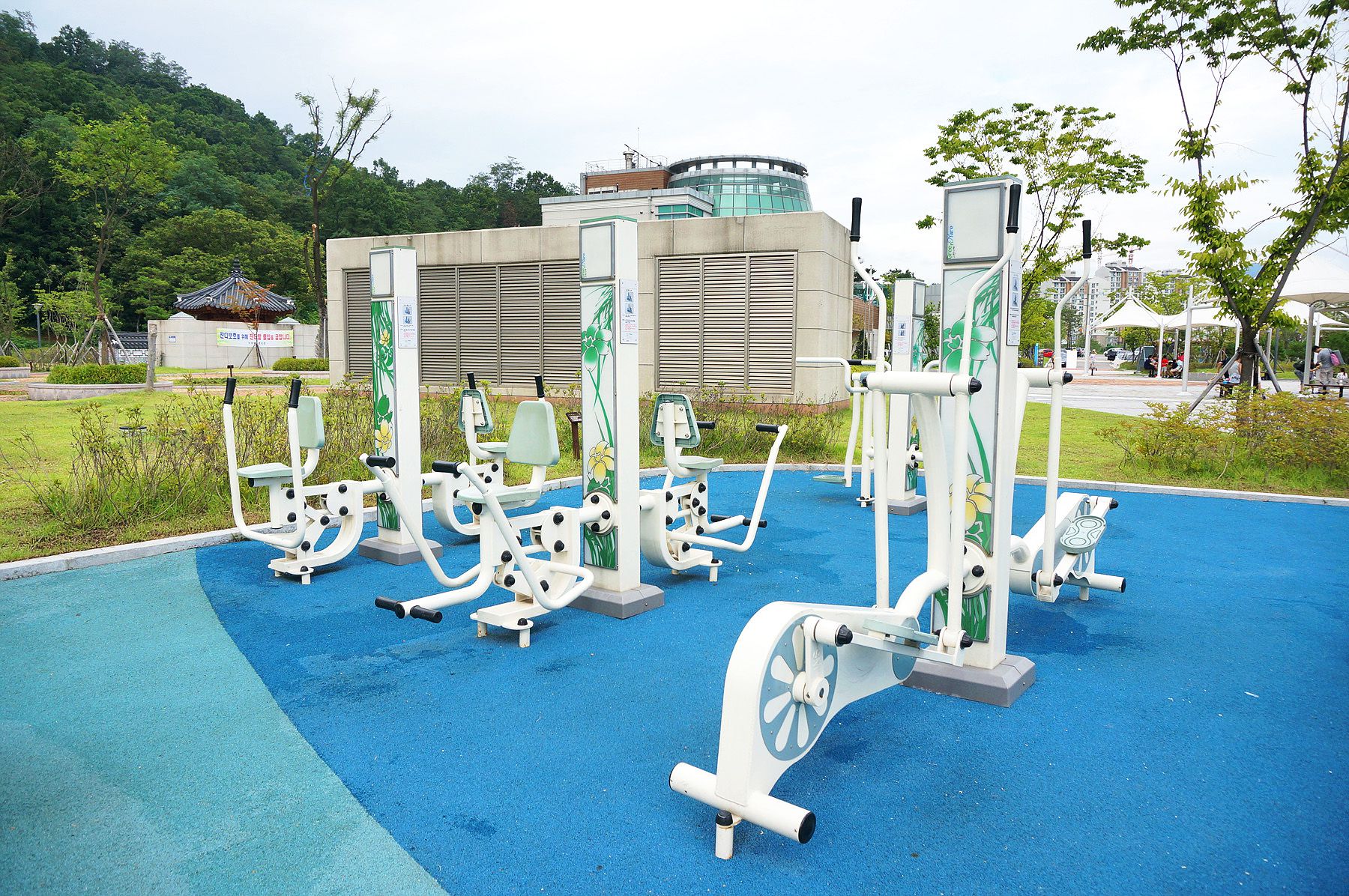 공원 곳곳에 쉴 수 있는 벤치와 다양한 운동기구도 마련되어 있습니다.