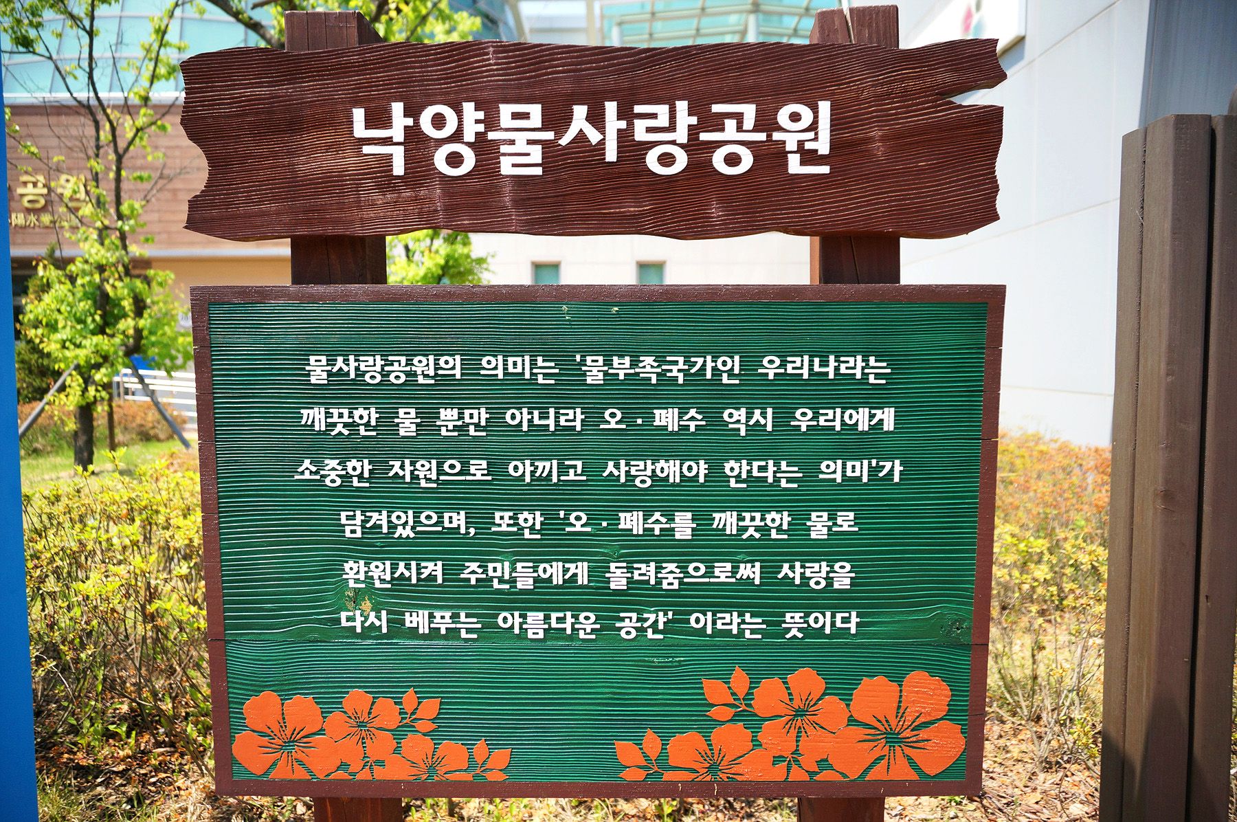 낙양물사랑공원은 물 부족 국가인 우리나라의 소중한 자원을 아끼고 사랑해야 한다는 의미를 담고 있습니다.