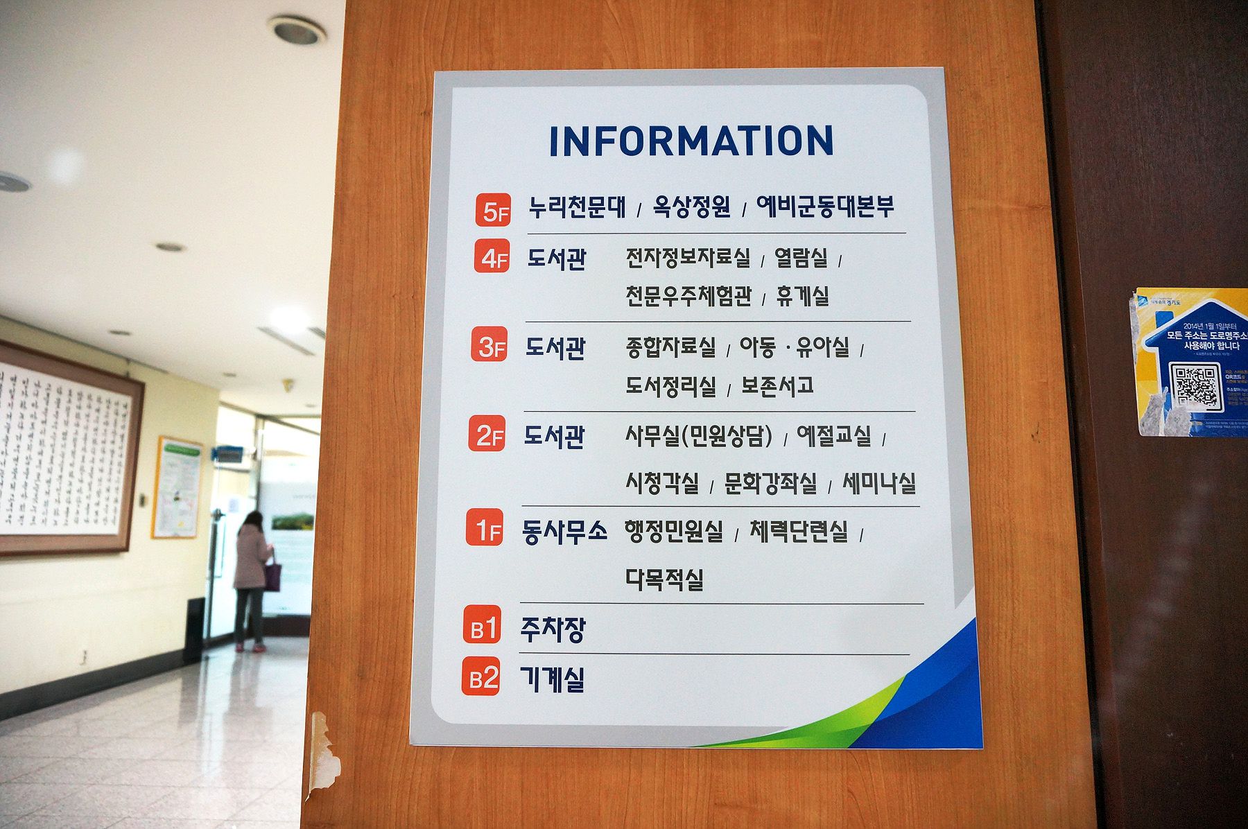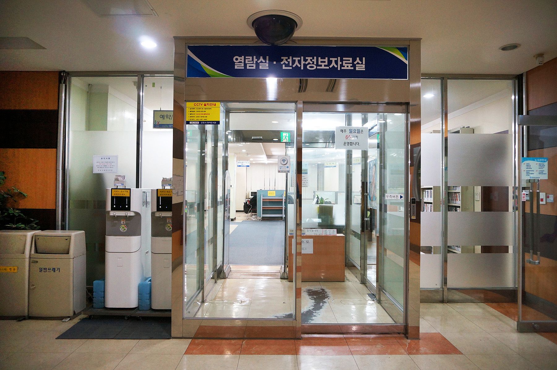도서관 옥상에 위치해 있어 도서관 입구를 통해 5층으로 올라가야 합니다.