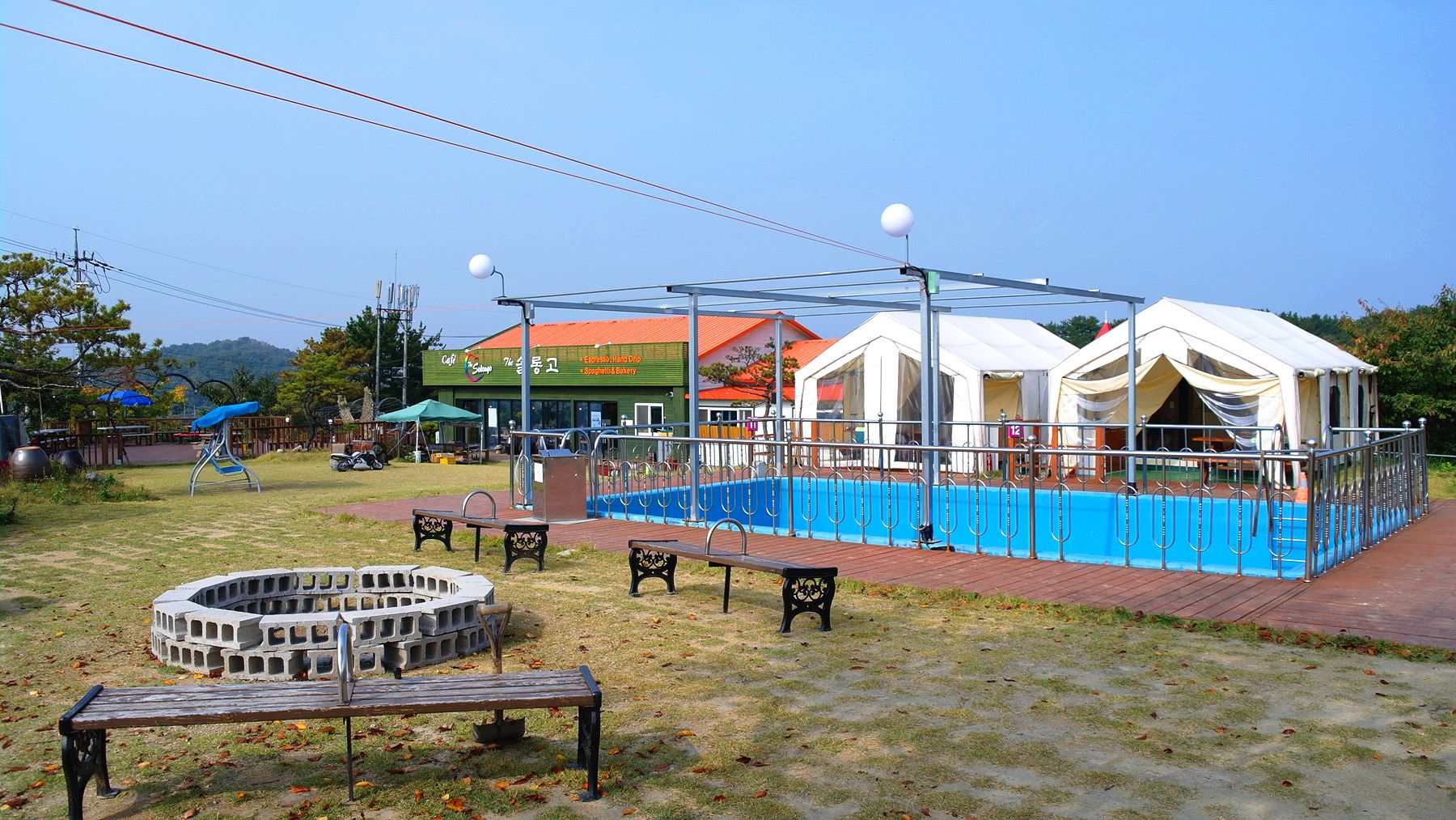 카페와 글램핑장, 수영장, 어린이놀이시설, 숯불고기 등을 즐길 수 있는데요,