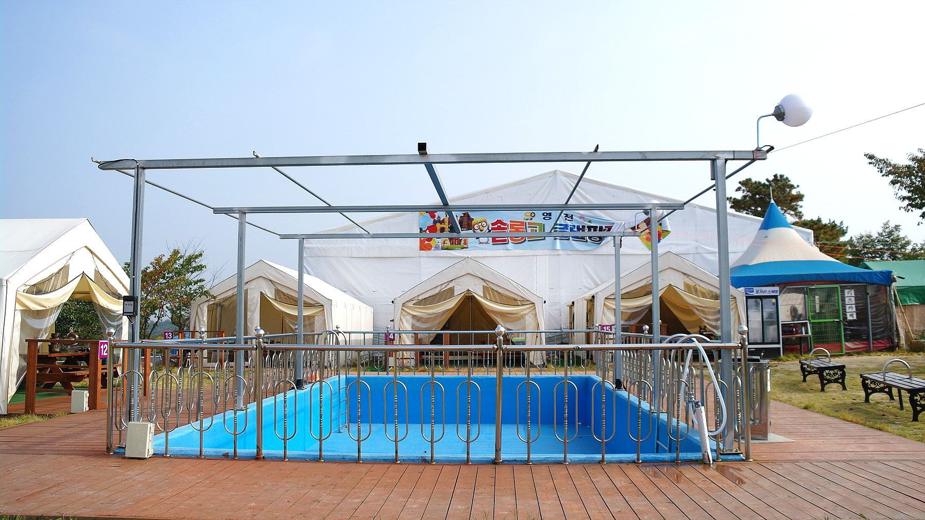 총 15동의 글램핑시설이 있으며 여름이면 물놀이 시설로 수영장도 이용을 할 수가 있습니다.