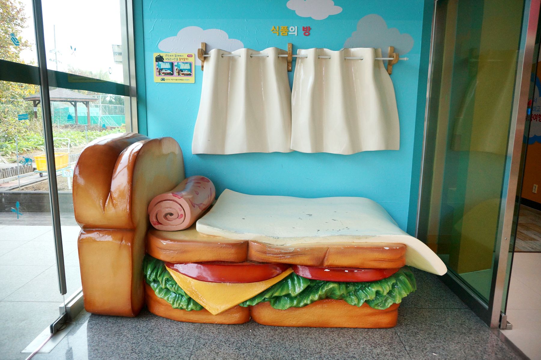 식품으로 만들어진 푸드 룸은 사진을 찍을 수 있는 포토존입니다.