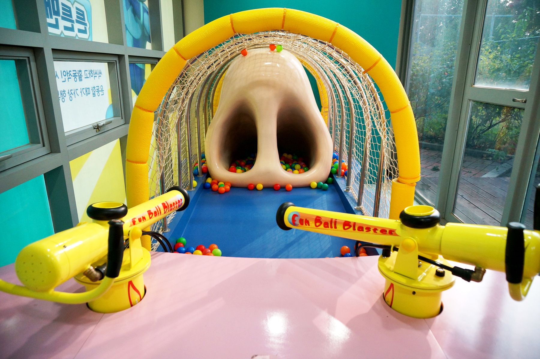 재채기 콧구멍 슈팅형 조형물은 콧구멍에 탁구공을 쏘면 재채기를 하면서