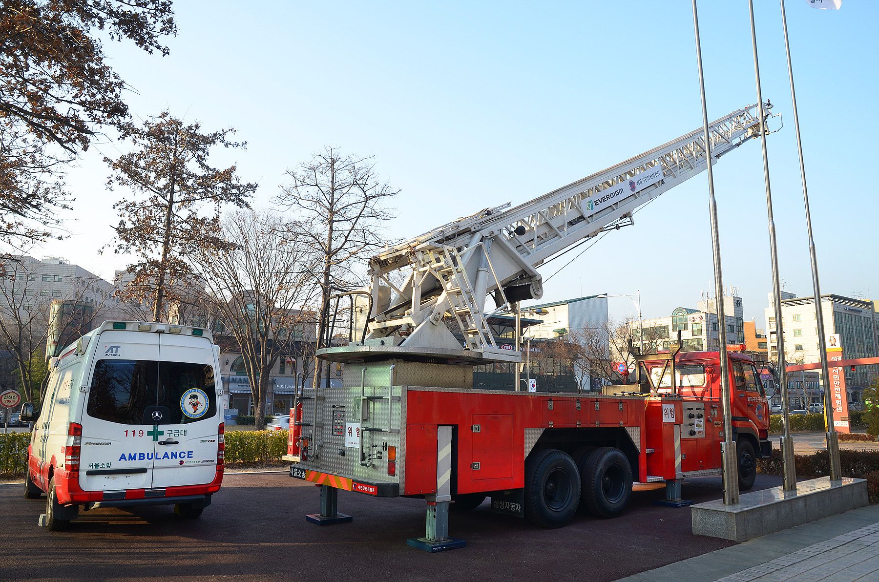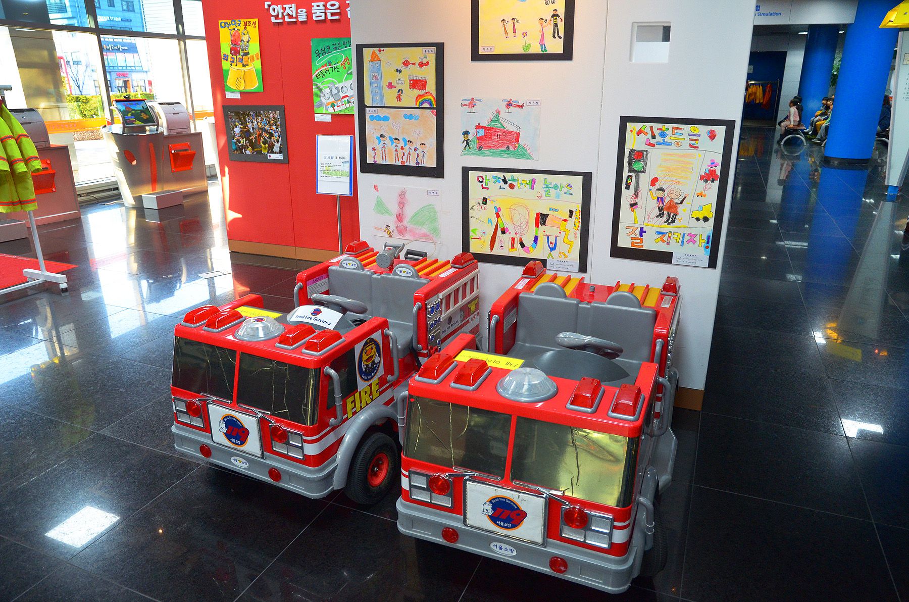 입구에 119응급구조대 차량과 소방차 등이 전시되어 있고,
