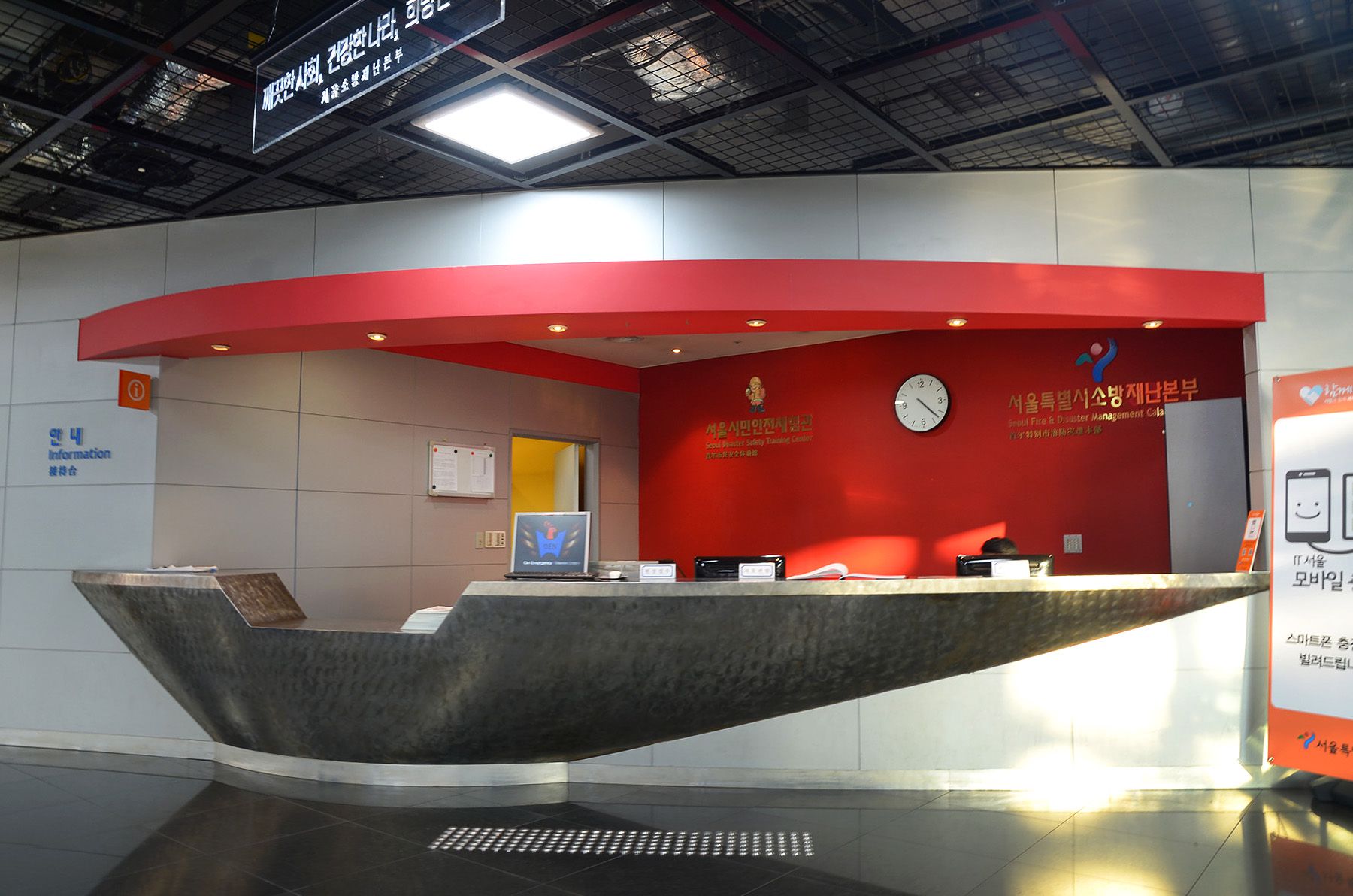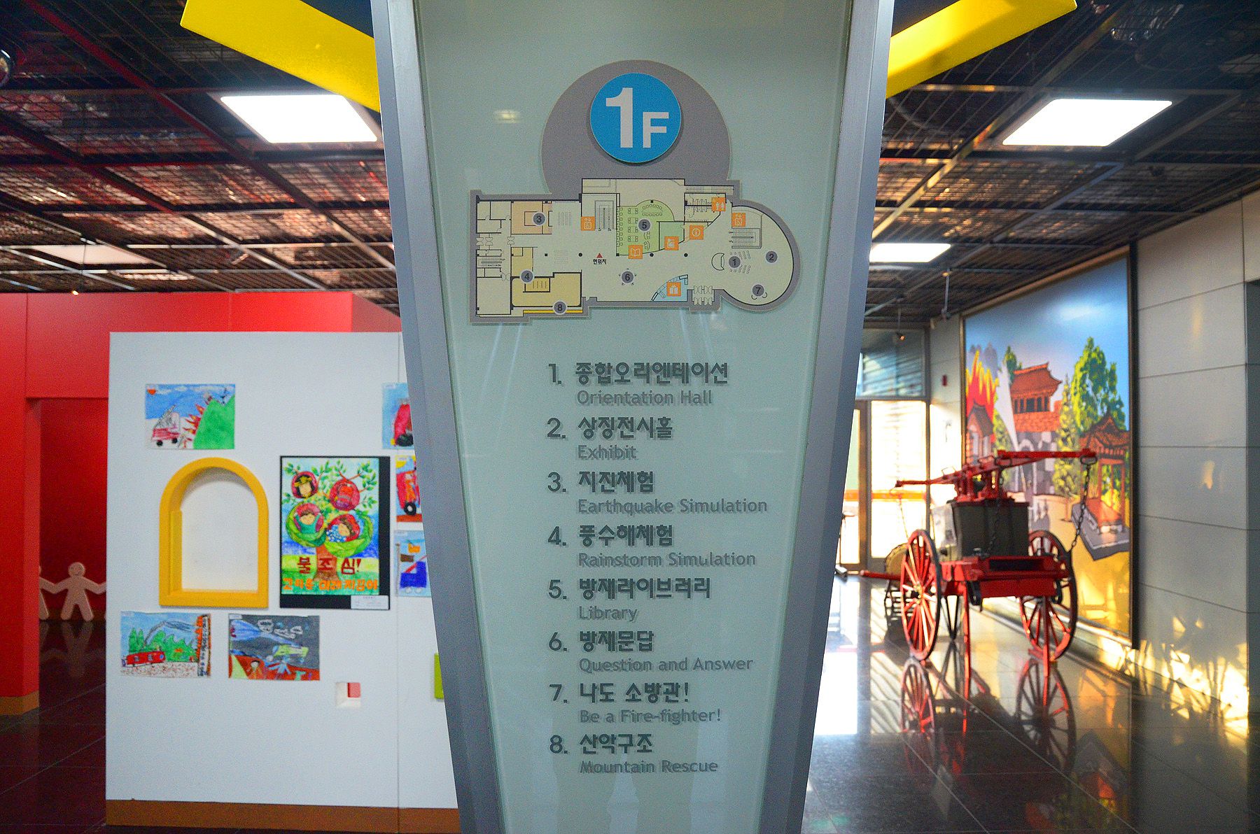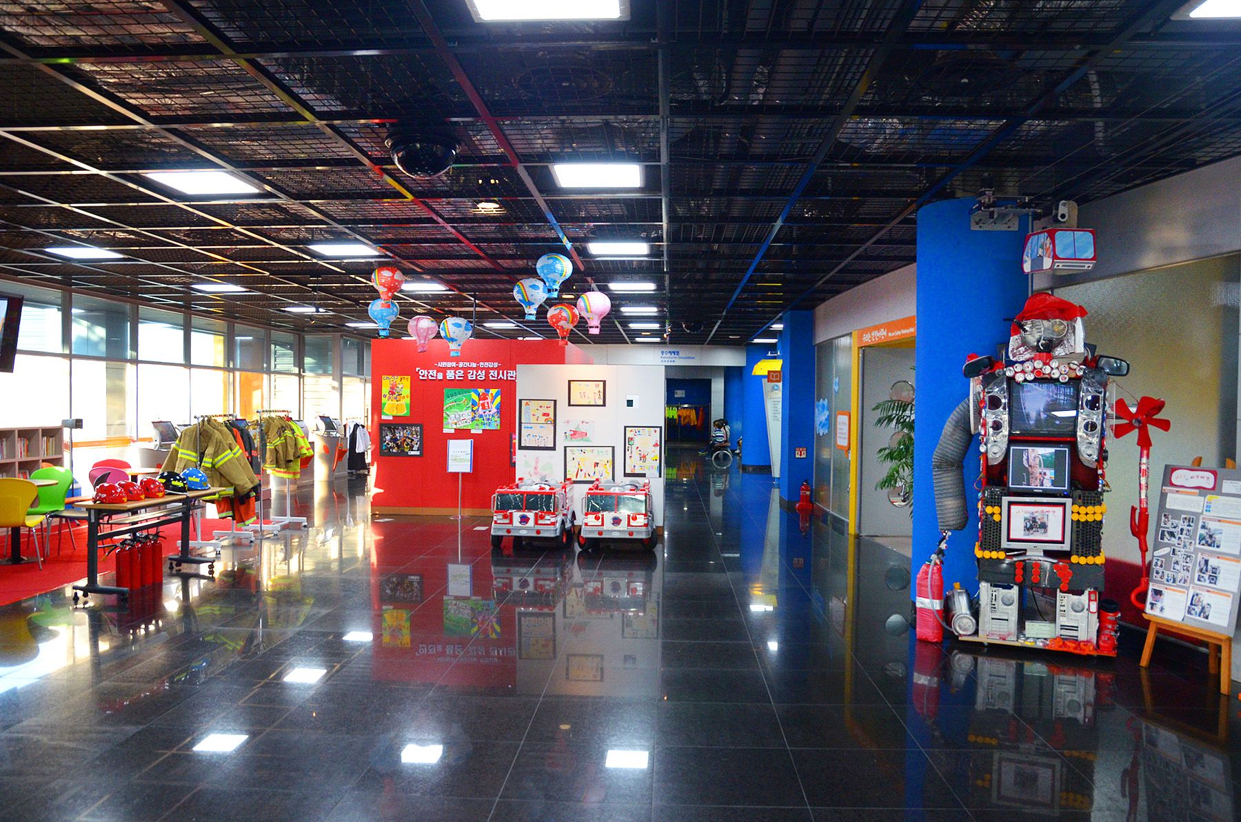 1층에는 안내데스크와 소방홍보용품이 전시되어 있습니다.