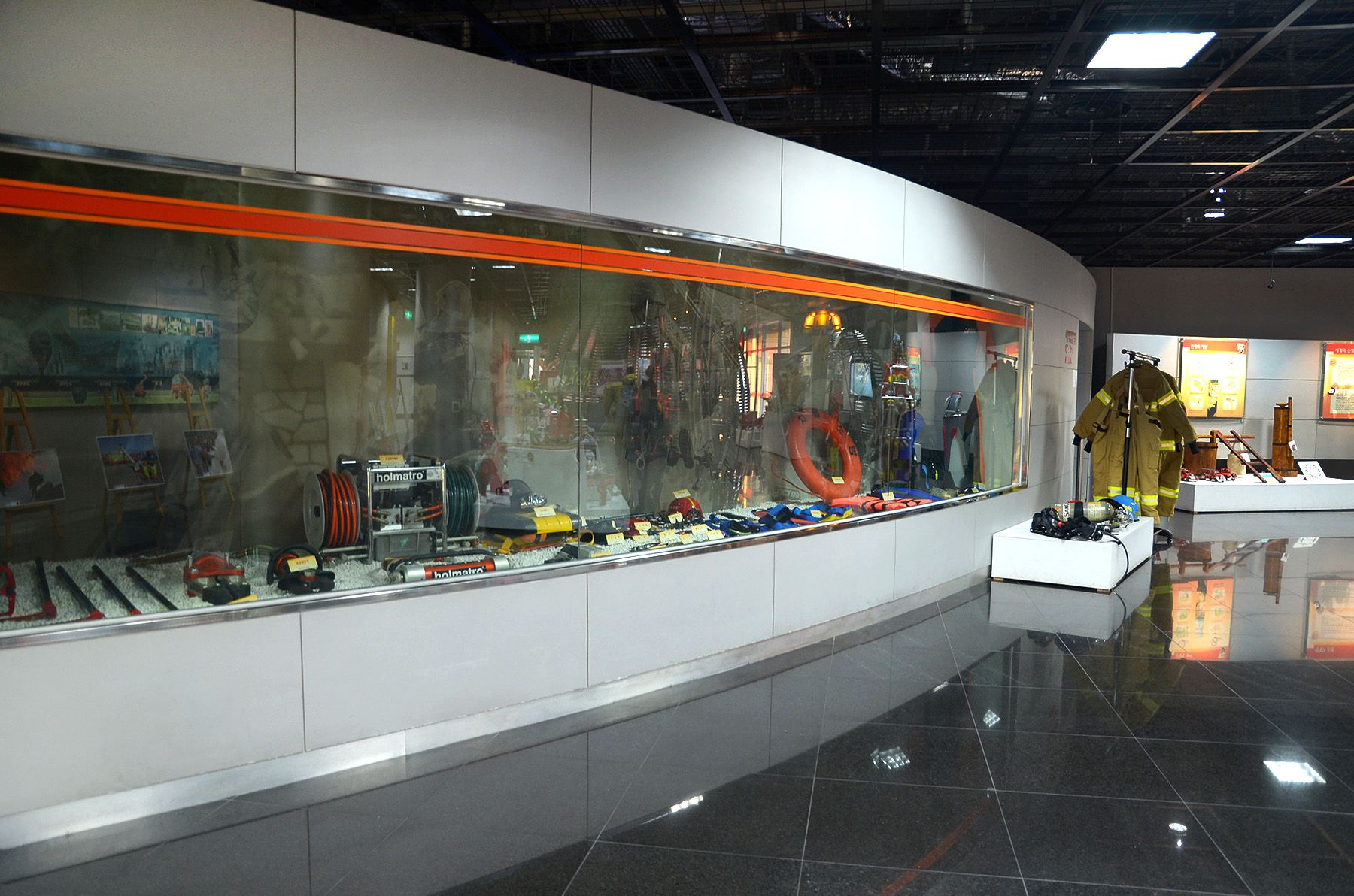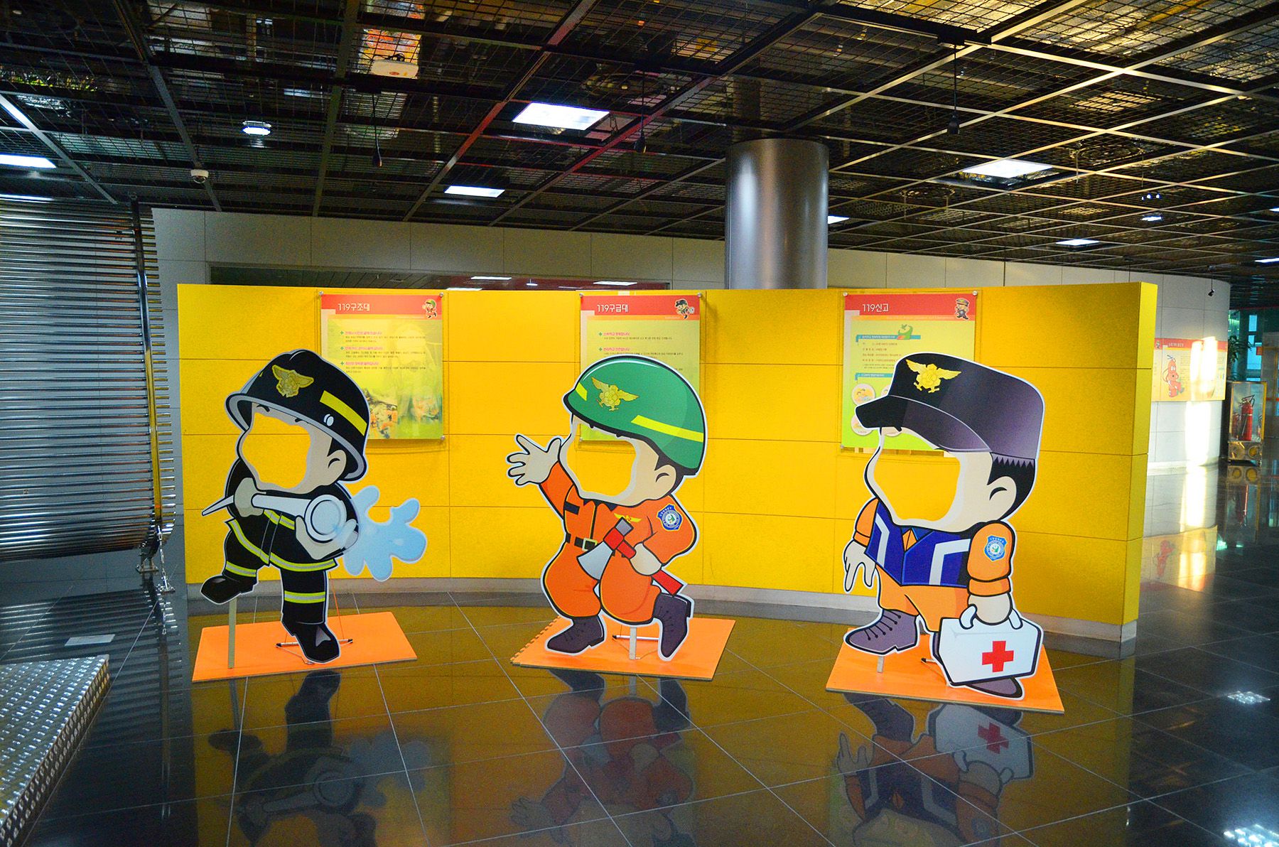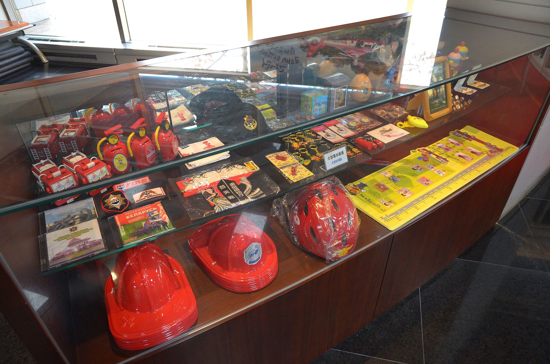1층에는 안내데스크와 소방홍보용품이 전시되어 있습니다.