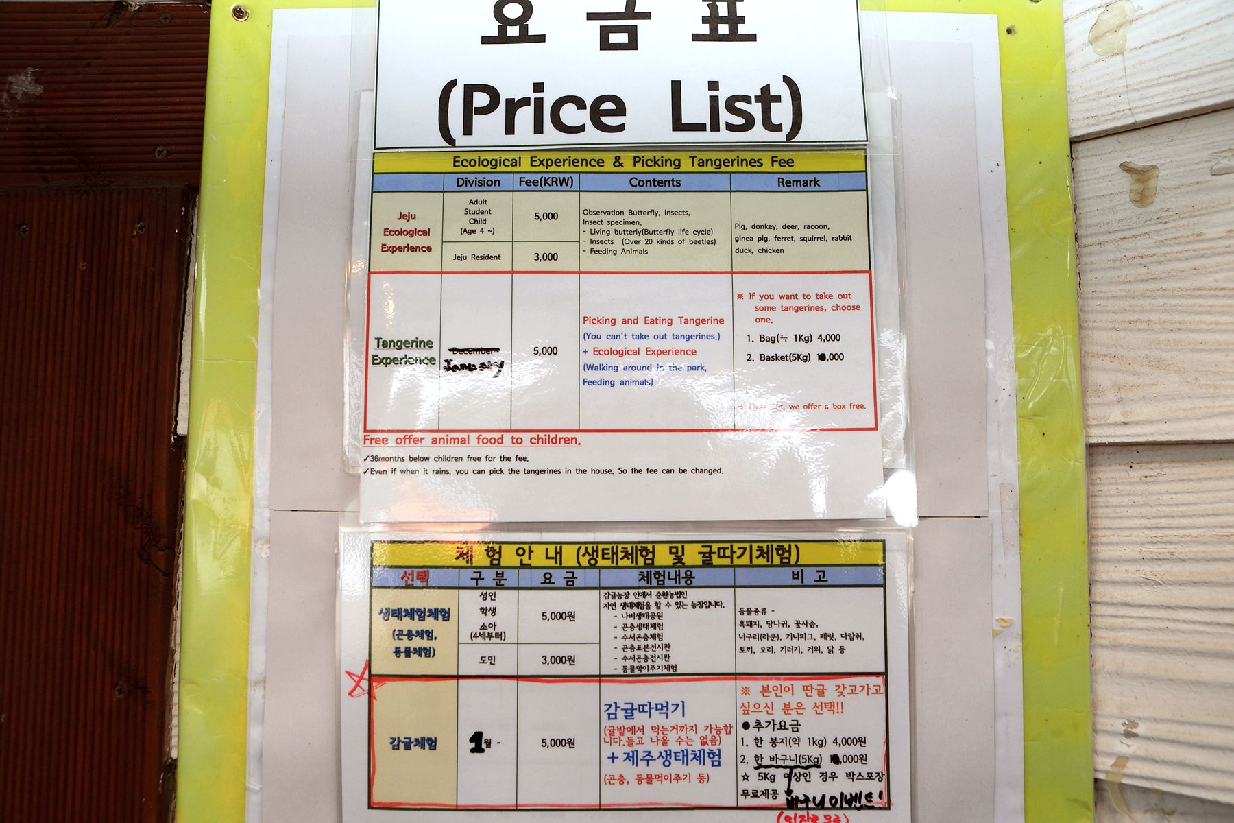 생태체험은 성인과 아이들의 요금이 다르지만 감귤 체험은 동일합니다.