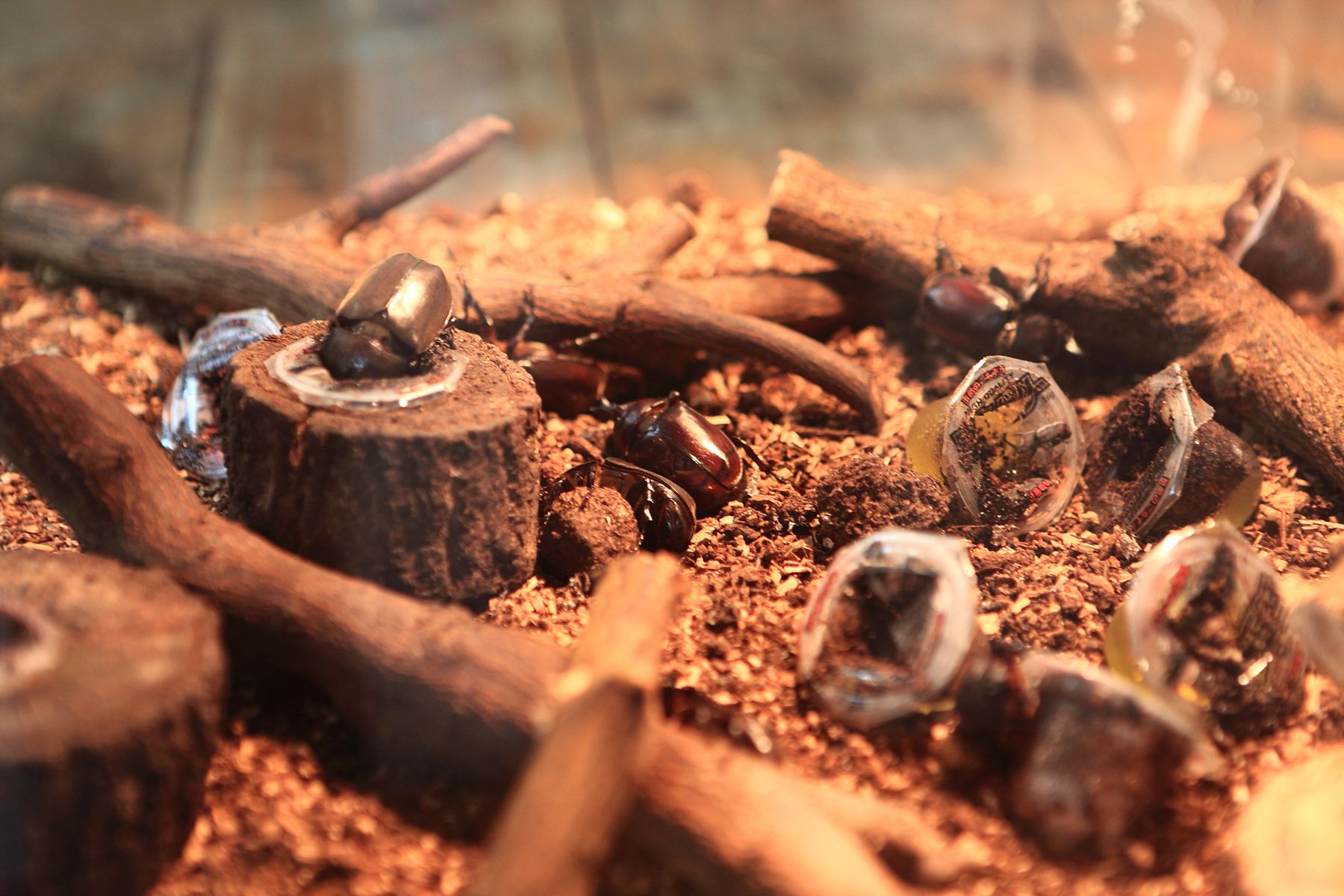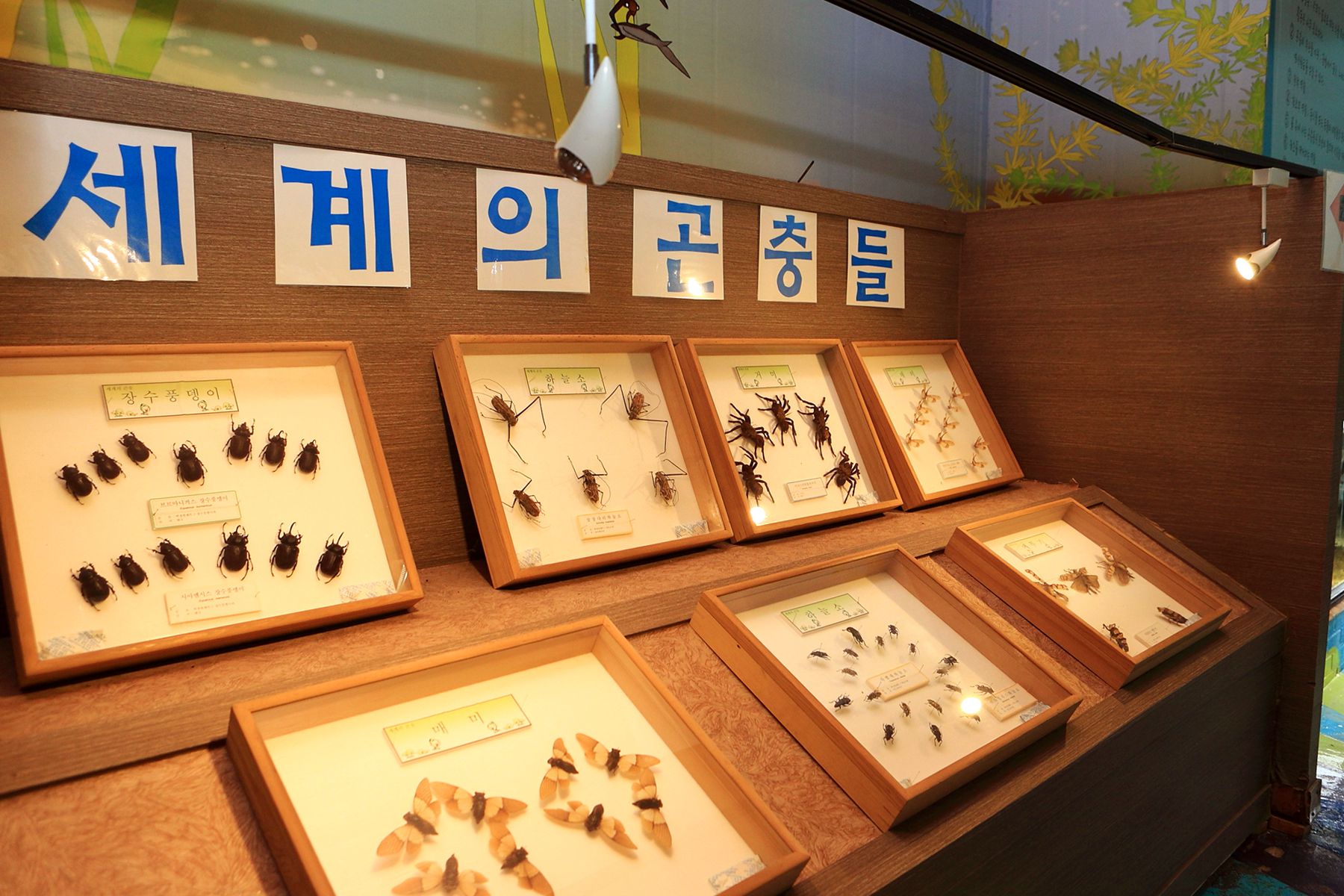 곤충체험장에서는 장수풍뎅이와 사슴벌레가 애벌레에서 성충이 되기까지의 과정을 볼 수 있고