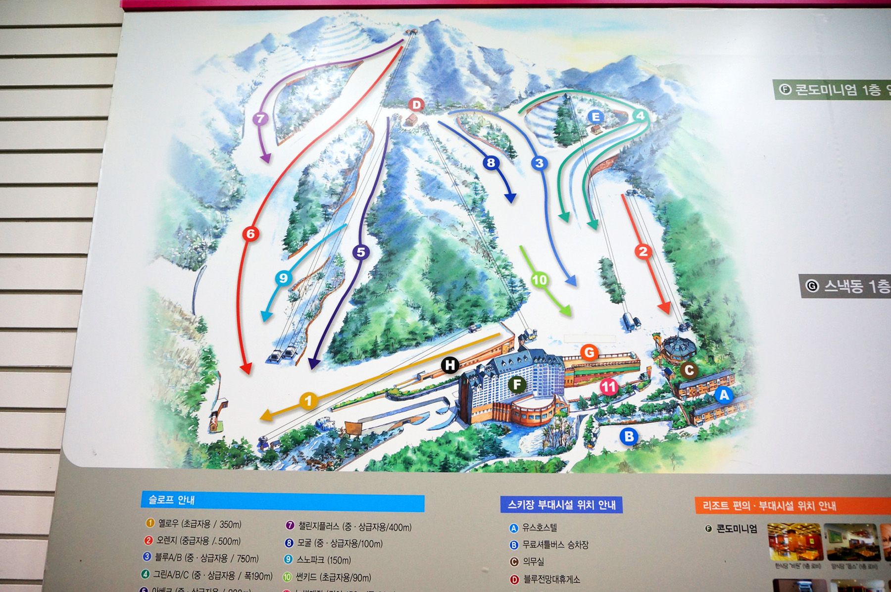 5도~36도까지의 다양한 코스로 준비되어 있는 10면의 슬로프는 초급자부터 최상급자까지 다이나믹하게 스키와 보드를 즐길 수 있게 해줍니다.