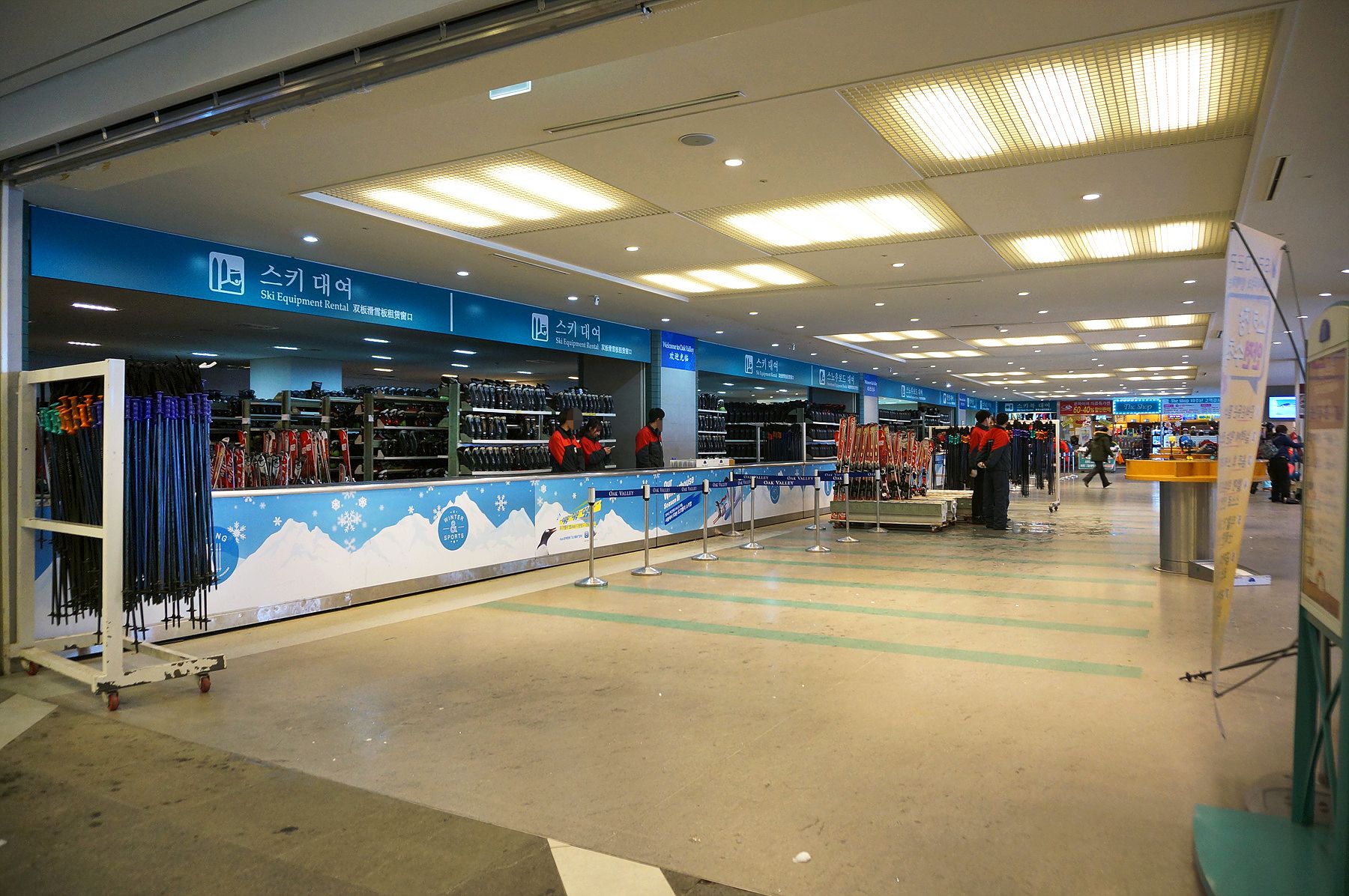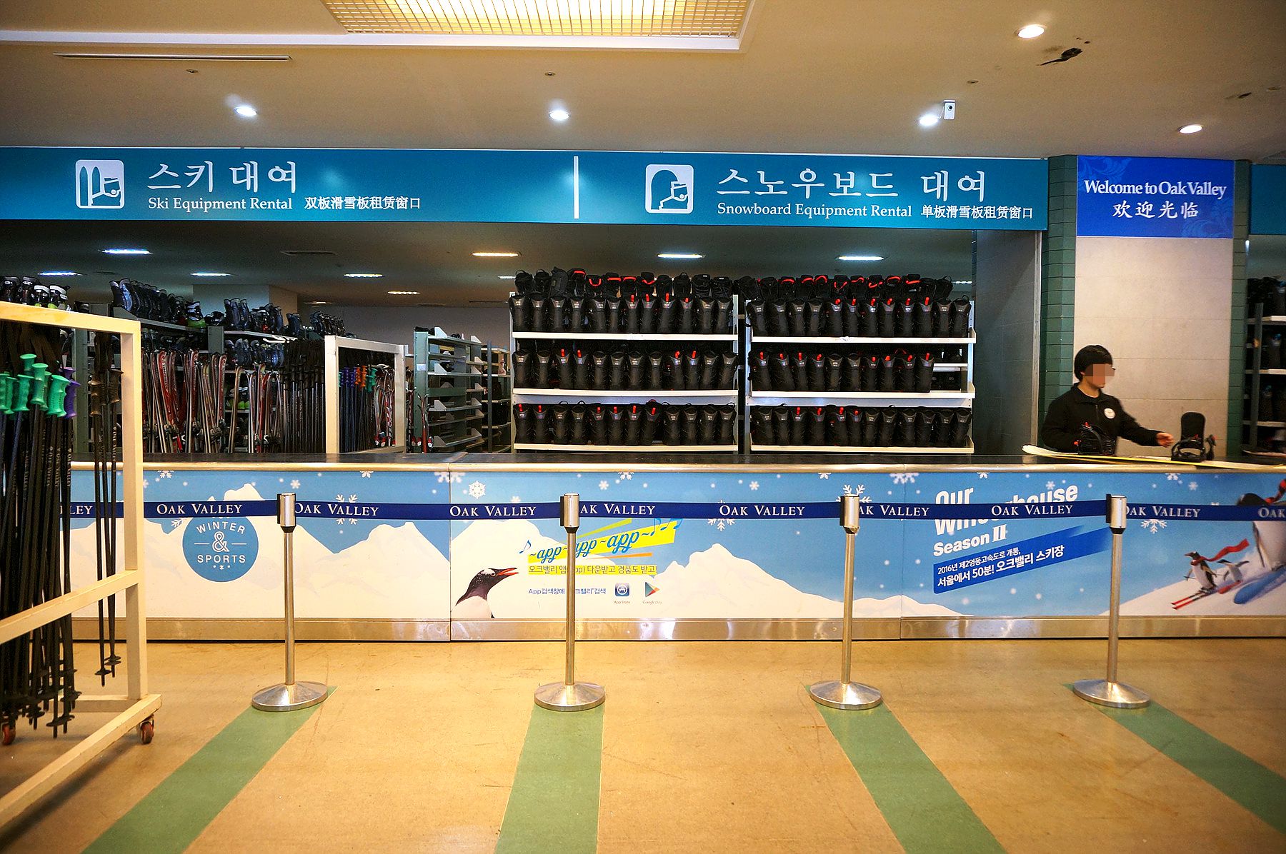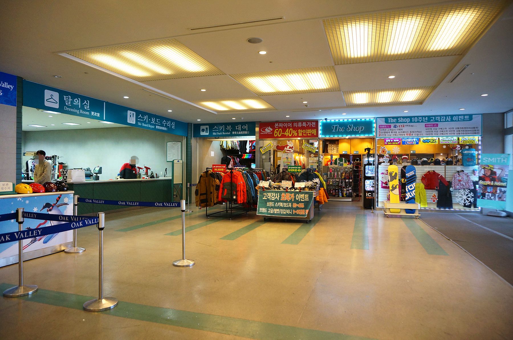 스키 콘도 C동 1층 내부에는 스키/보드 장비 렌탈샵과 스키/보드 수리실, 스키복 대여점, 스키/보드 장비 판매샵 등의 시설이 마련되어 있습니다.
