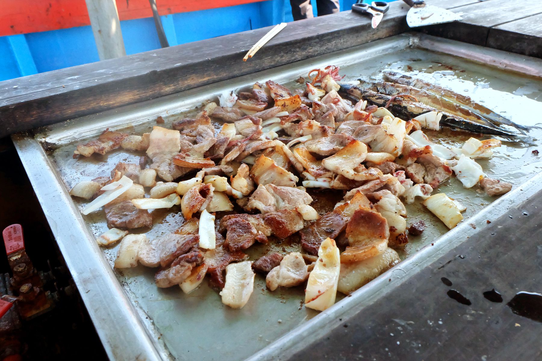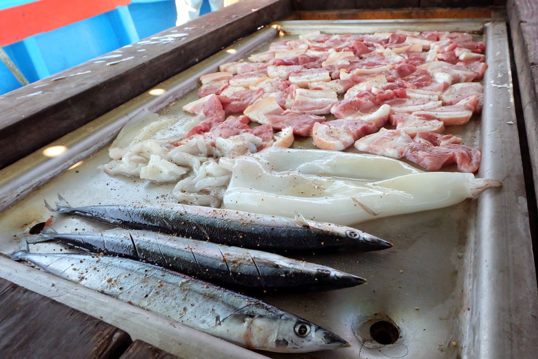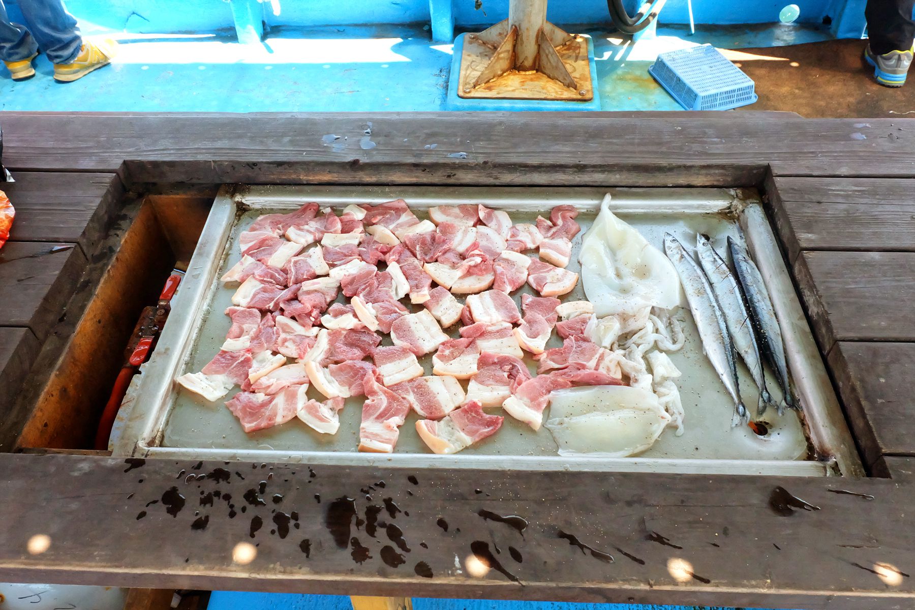 태양배낚시에는 최고의 선상 바베큐시설이 설치되어 있어서 생선구이, 오징어구이, 돼지바비큐 등을 즐길 수 있습니다.