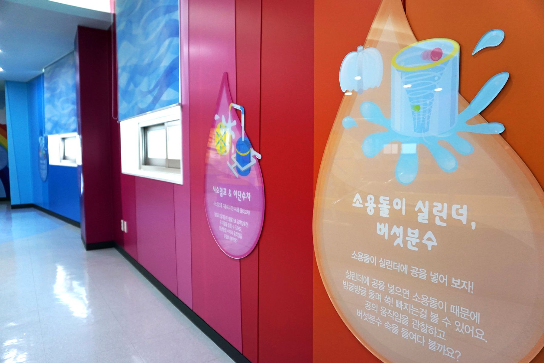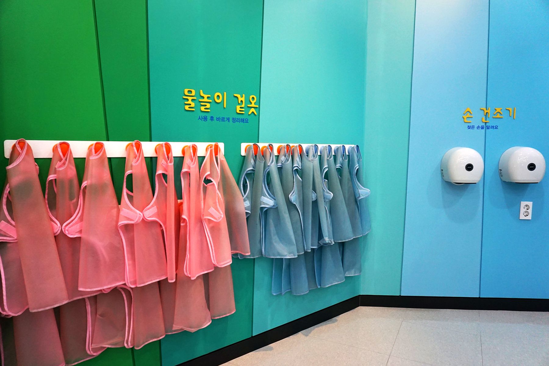 물놀이 하는 과정에서 옷이 젖지 않도록 물놀이 겉옷과 체험 후 젖은 손을 말리수 있도록 손 건조기까지 준비해 놓은 세심함을 엿볼 수 있습니다.