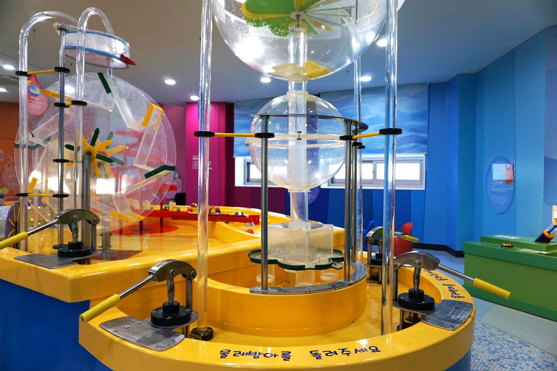 1층 체험관에는 움직여보고 만져보는 동적 체험공간으로 과학놀이터, 집짓기체험실, 고문화체험실, 동화동산이 마련되어 있고