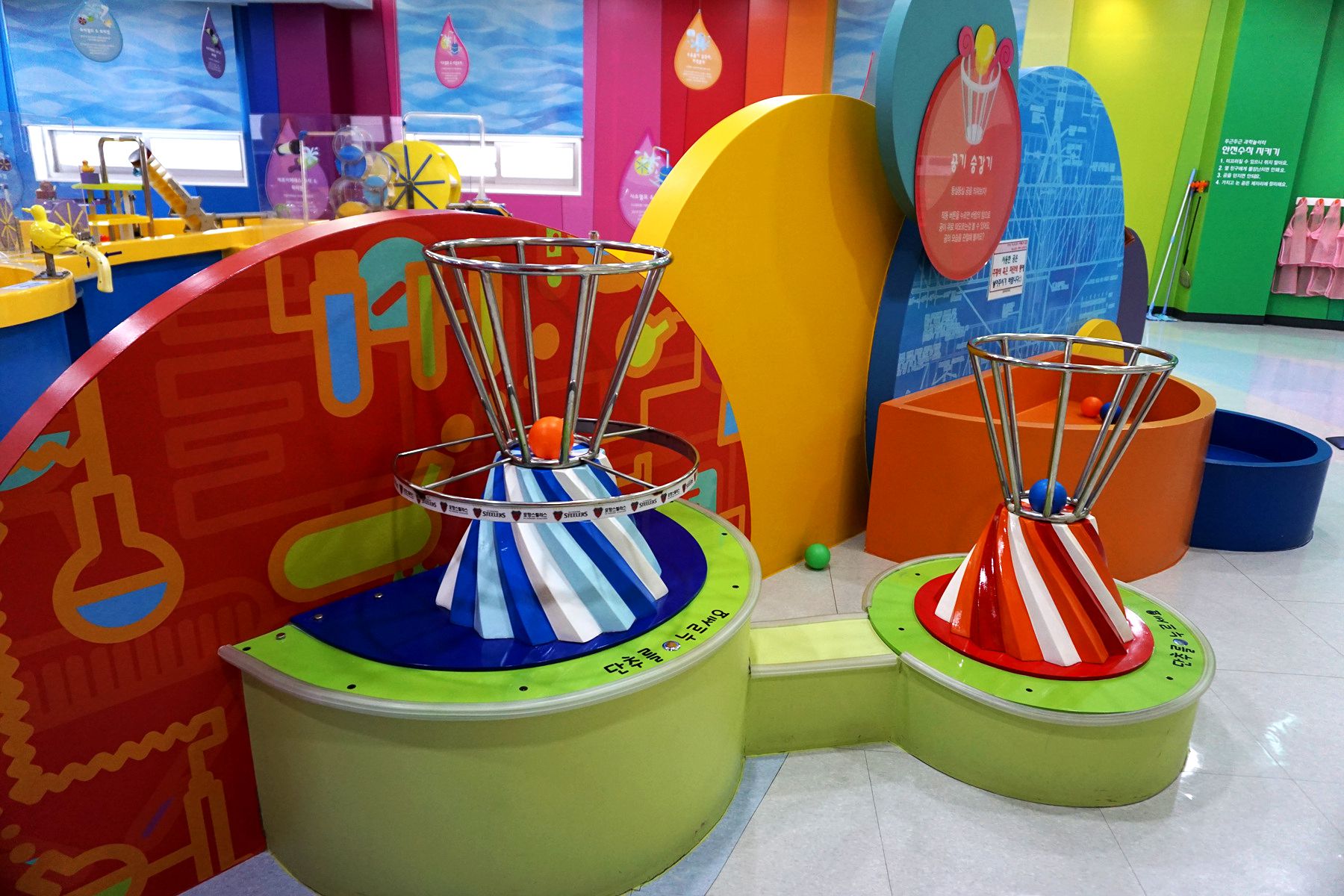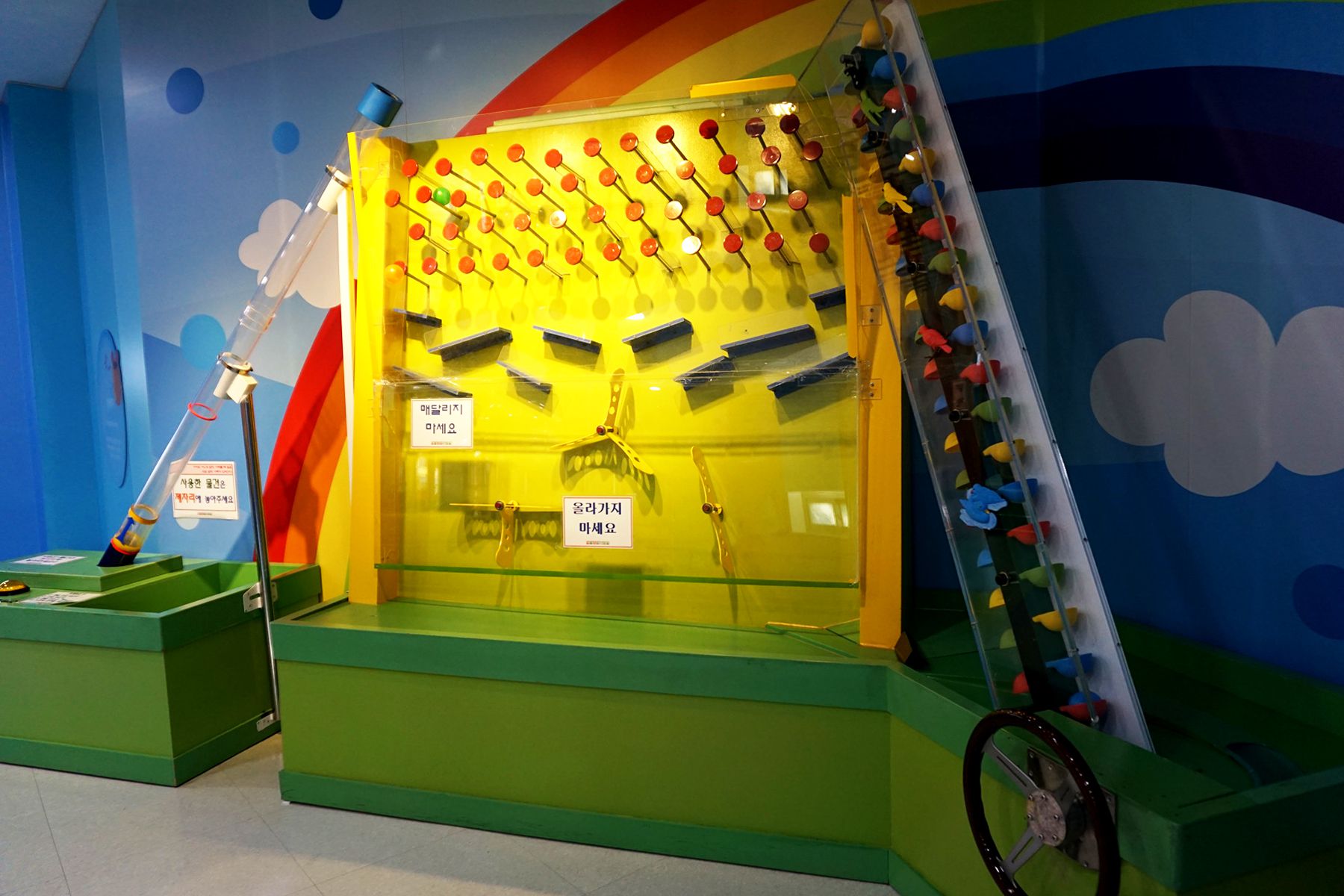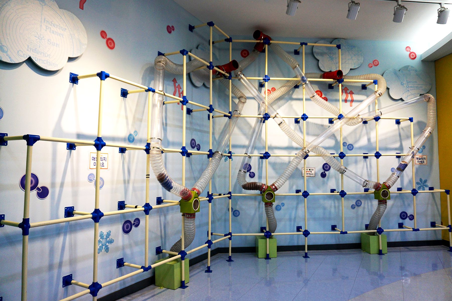 입구에 공을 넣은 후 공이 어디로 가는지 파악하고 바람의 움직임을 공을 통해 배워 보는 공기 파이프입니다.