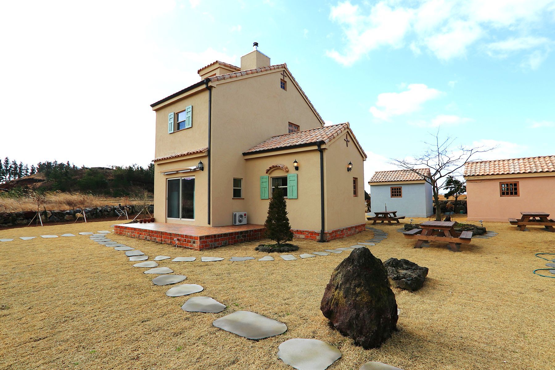제주의 푸른하늘이 펜션 바로 하늘위에 펼쳐져 있어 더욱 아름다운 펜션의 풍경입니다.
