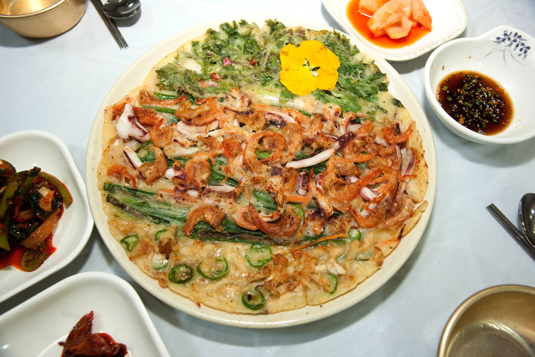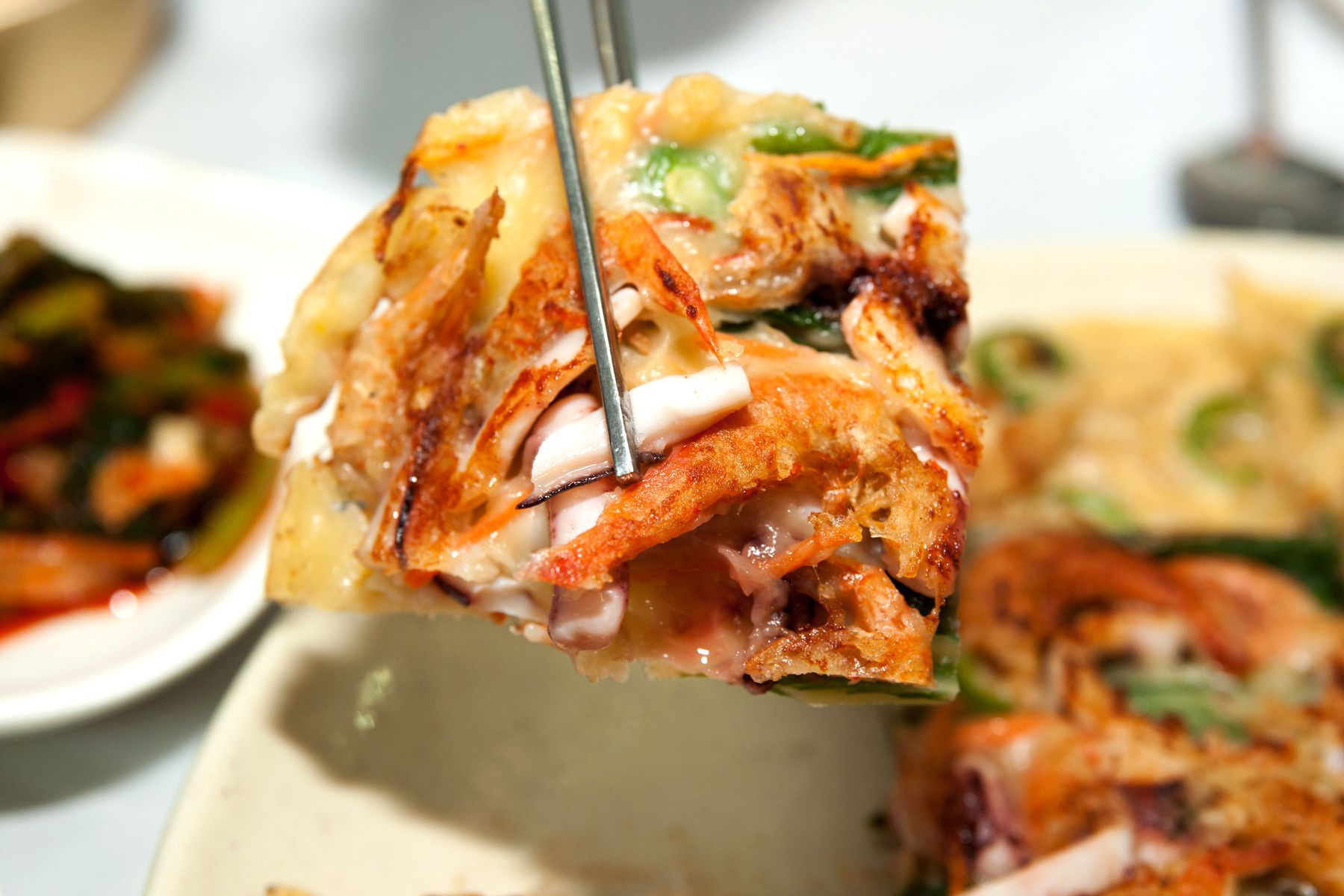여러가지 해물과 야채가 어우러져 바삭하게 구워진 파전을