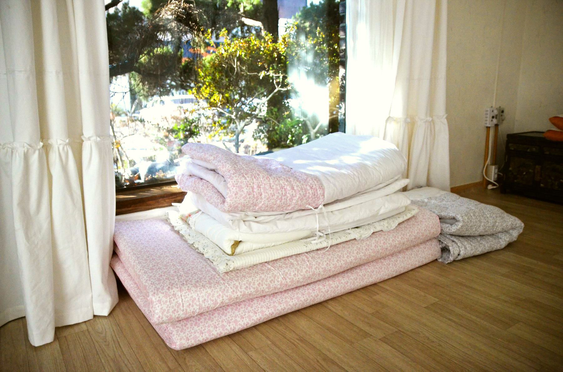 화이트 침대가 안락하고 포근하며 창 밖에 마당 풍경이 이쁜 이곳의 유일한 침대방 203호 '꽃복숭아방'