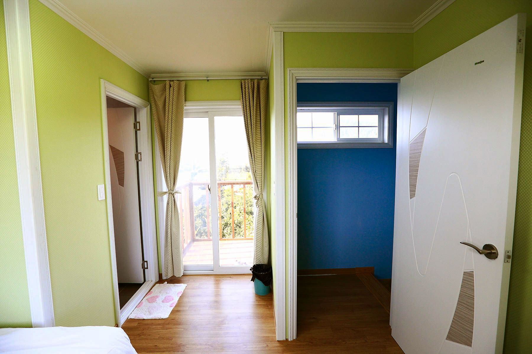 1층과는 독립적으로 화장실이 있고, 마을과 오름이 한 눈에 들어오는 작은 테라스도 있어
