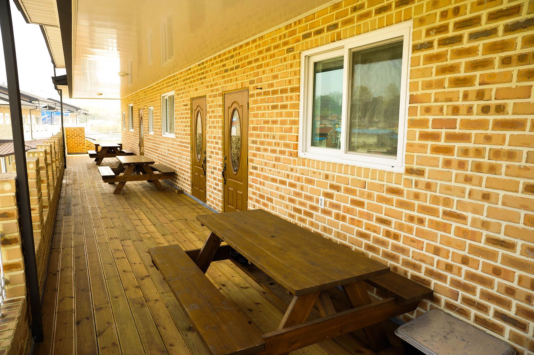 각 객실마다 밖에서 고기를 구워먹거나 차를 마실 수 있는 식탁의자가 준비되어 있습니다.