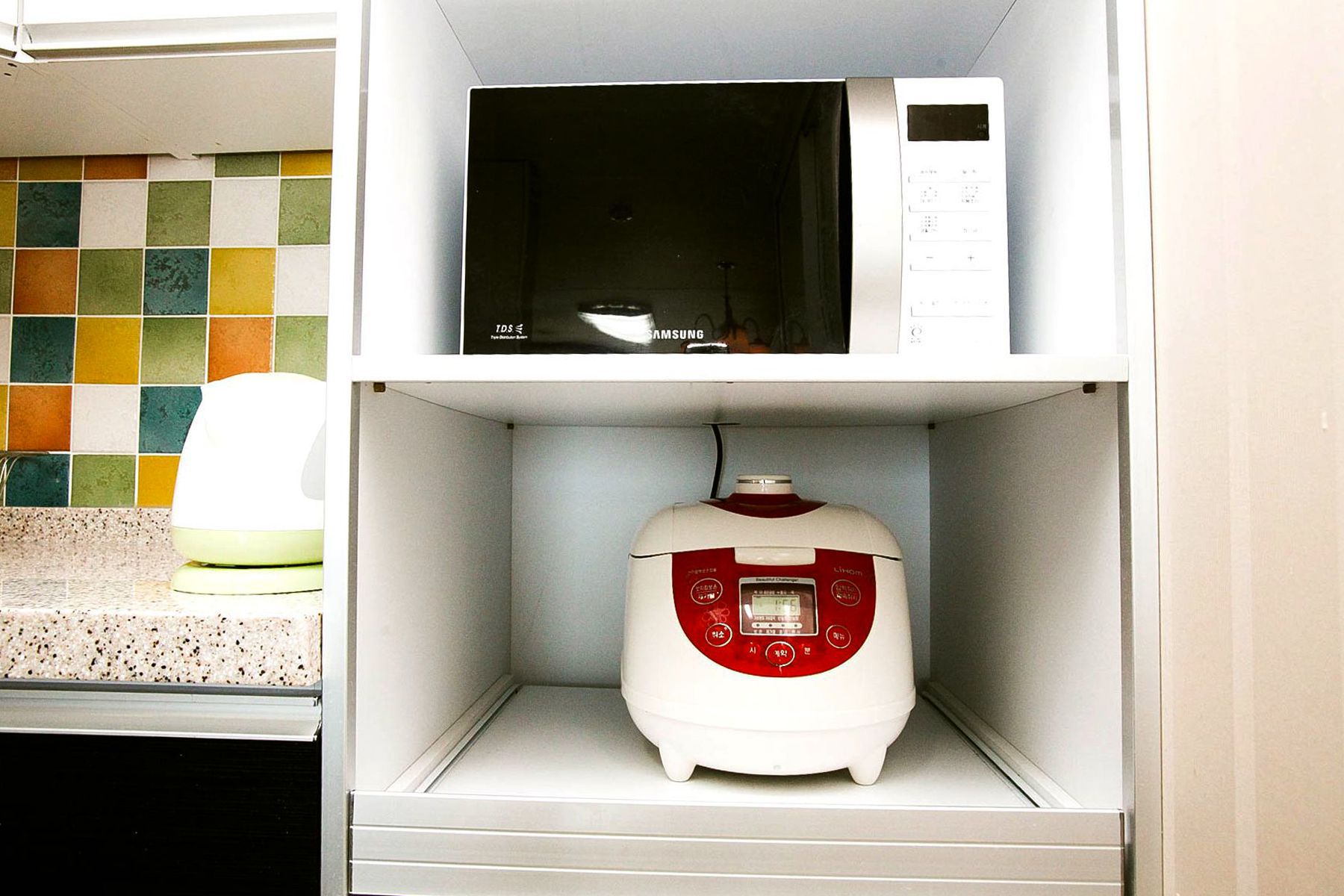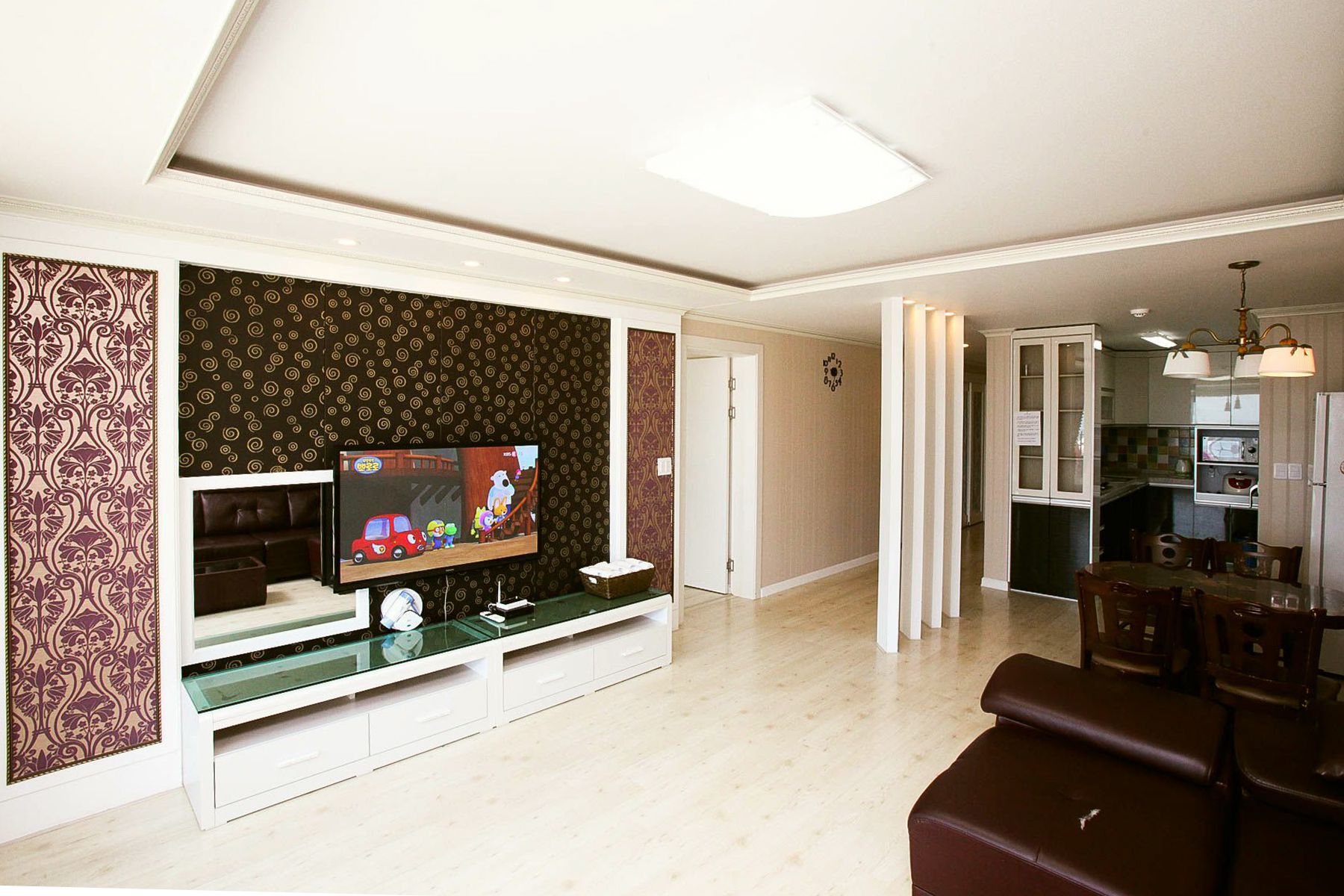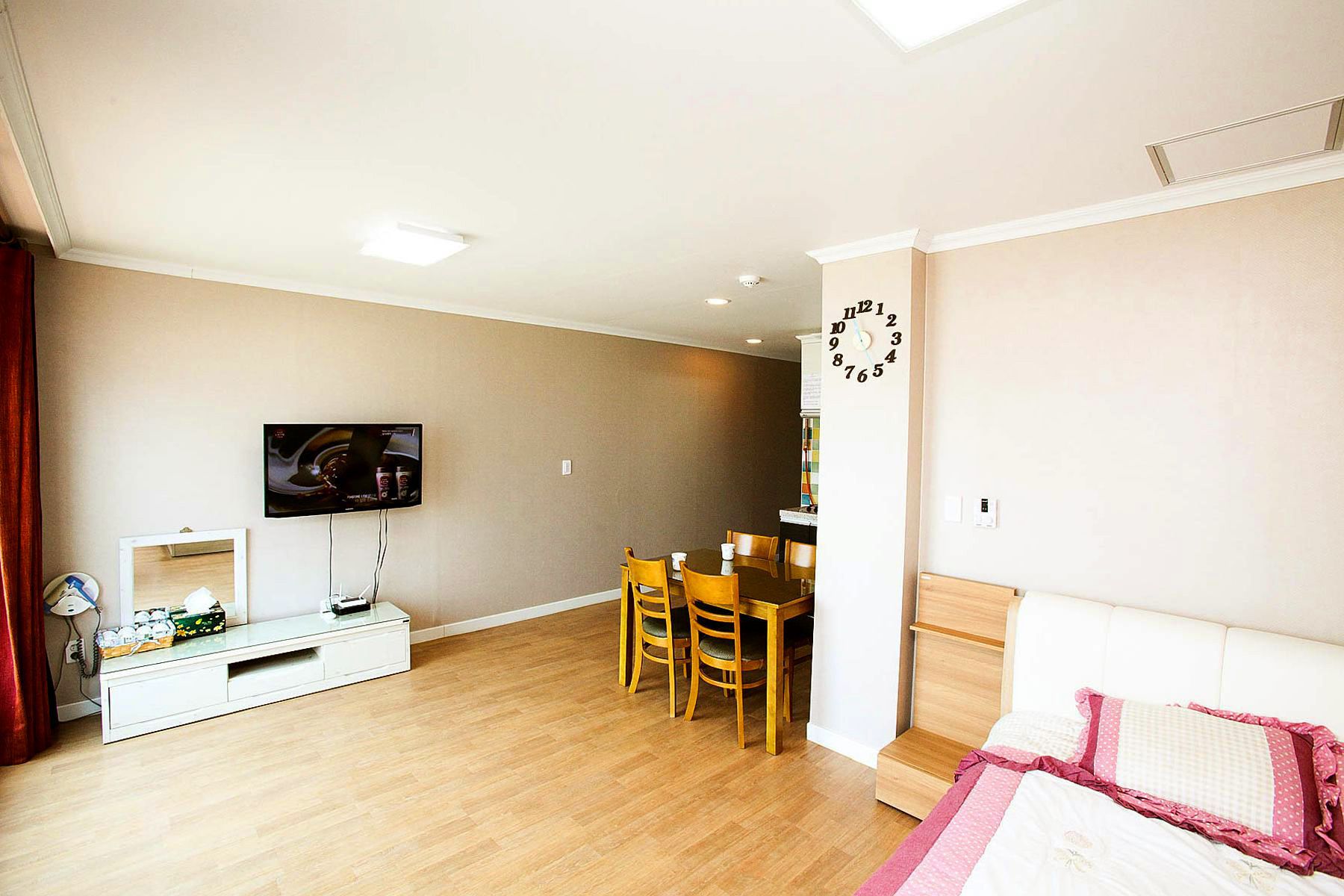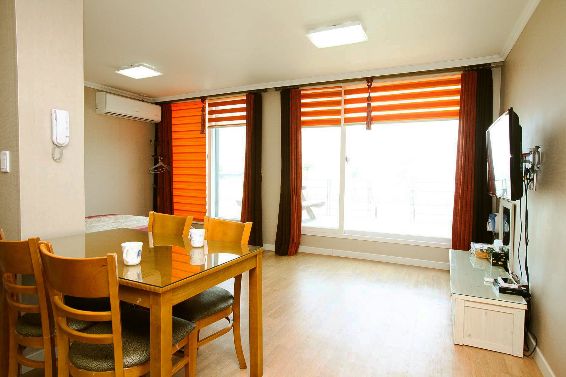 모든 객실에는 벽걸이 tv, 쇼파,에어컨,냉장고,씽크대,식탁,드라이기,전기밥솥,무선주전자,가스레인지,취사도구일체 와