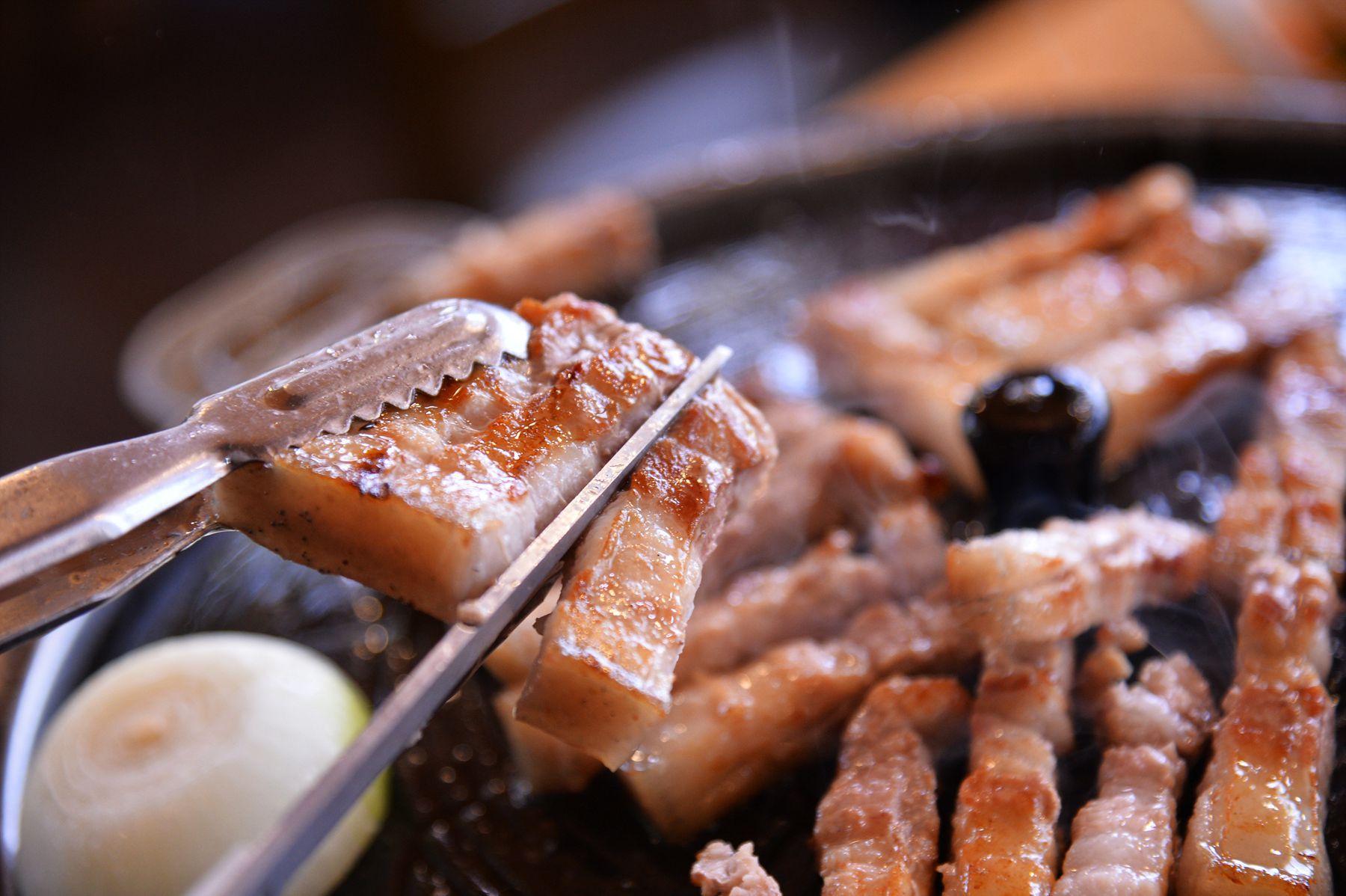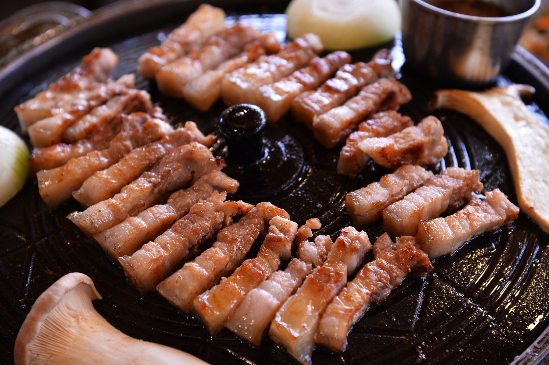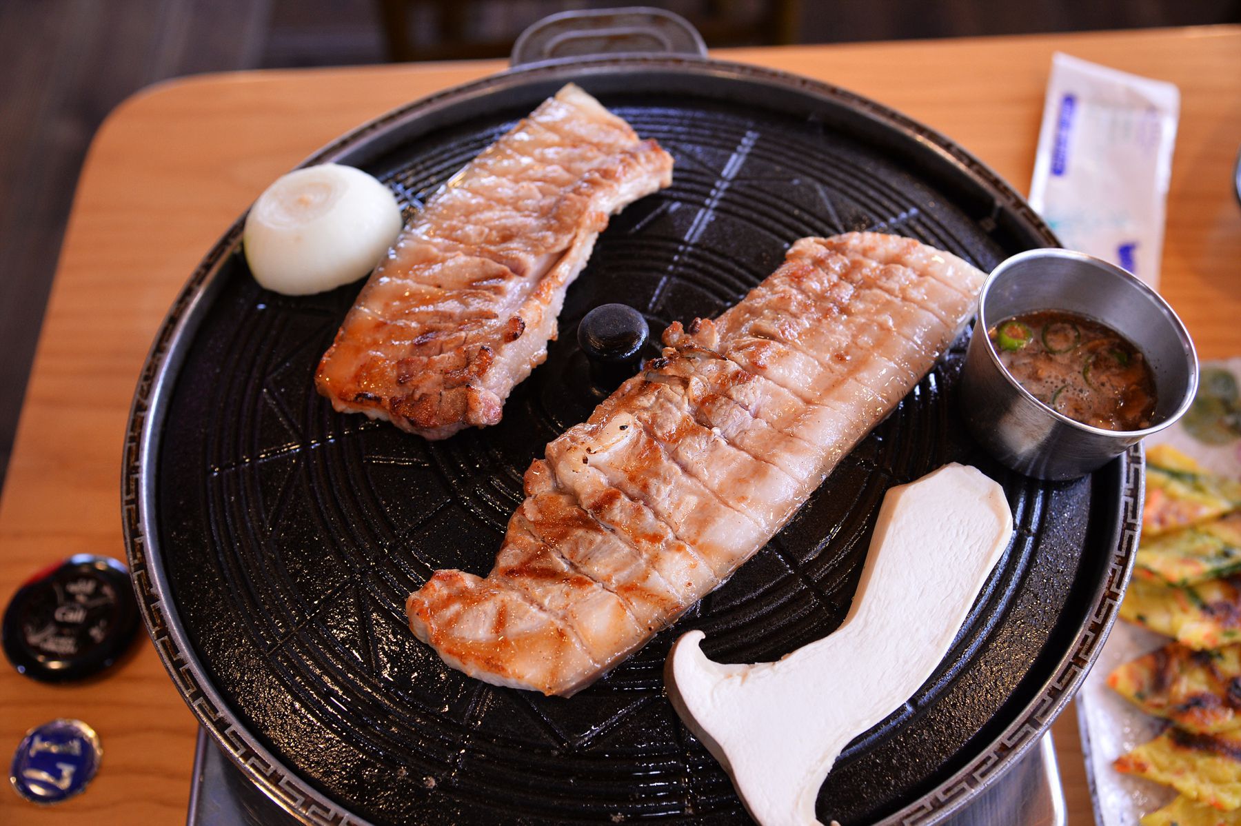 고온에서 초벌구이해서 나온 흑돼지오겹살은 솥뚜껑 위에서 기름을 빼며 잘 구워드시면 됩니다.