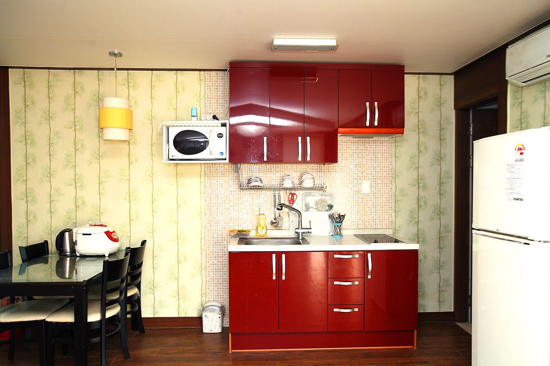 싱크대,냉장고,인덕션,전기밥솥,전자렌지,커피포트 등 과 취사도구 일체가 준비되어 있습니다.