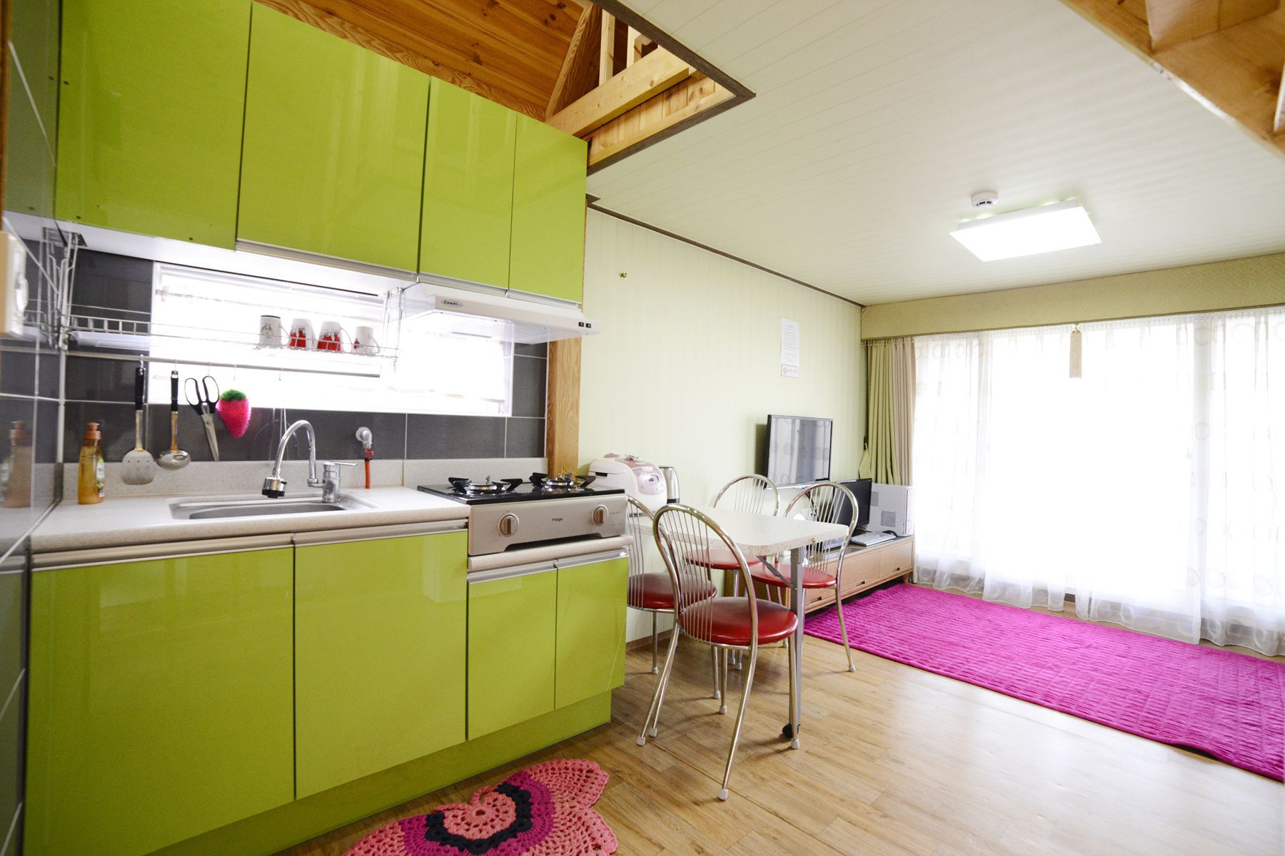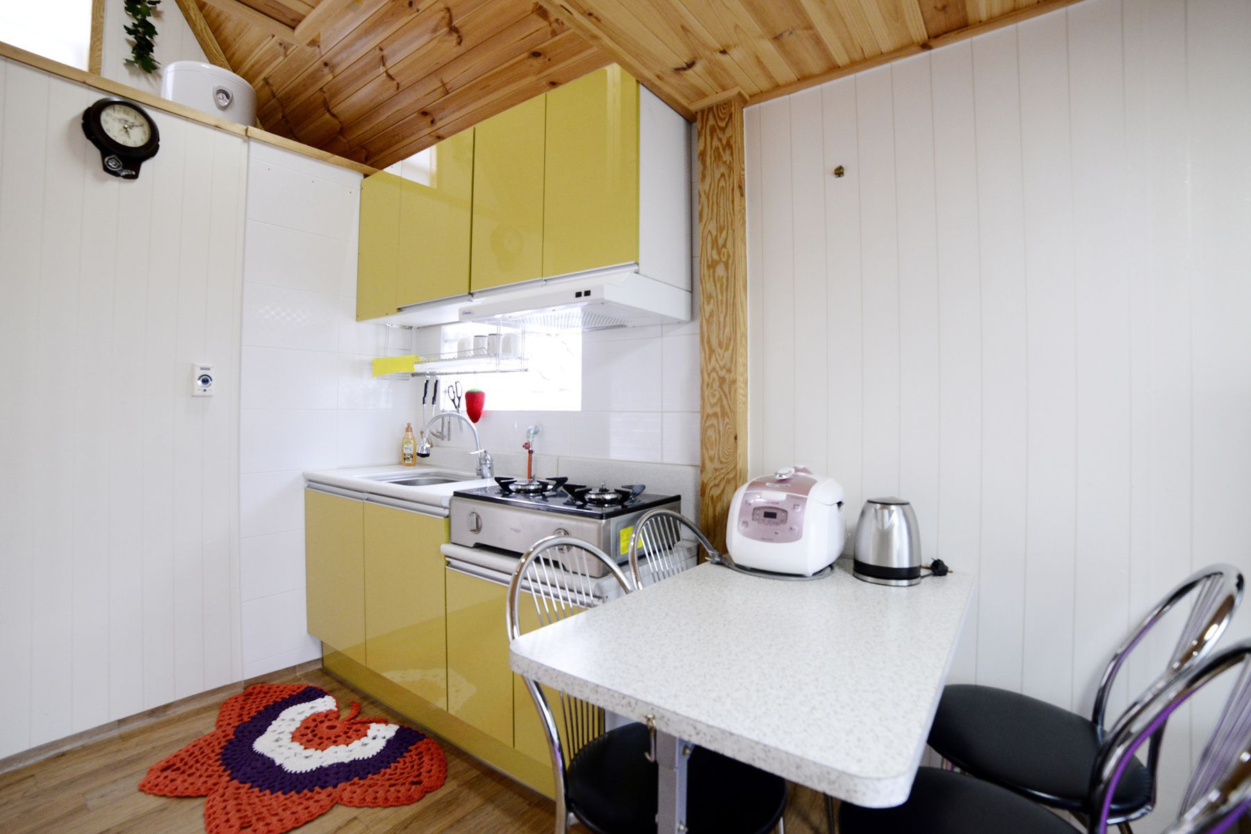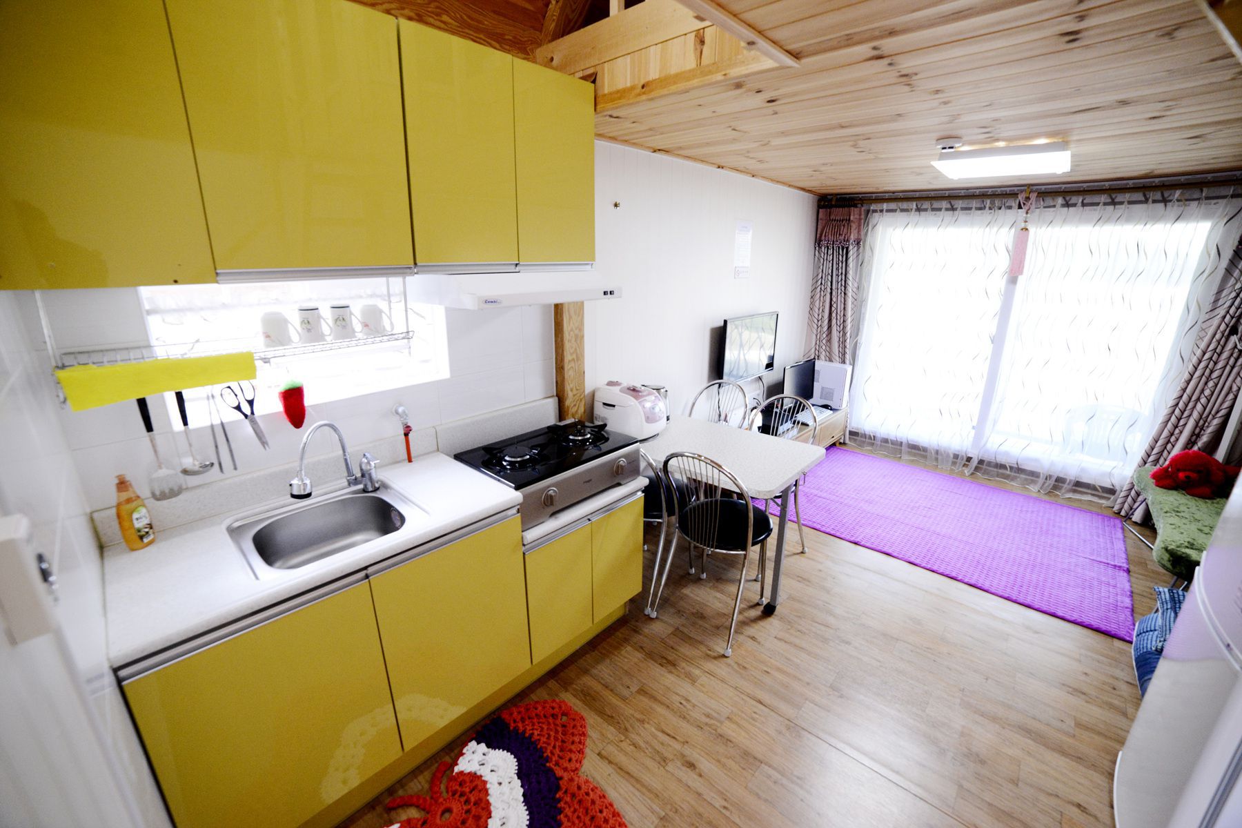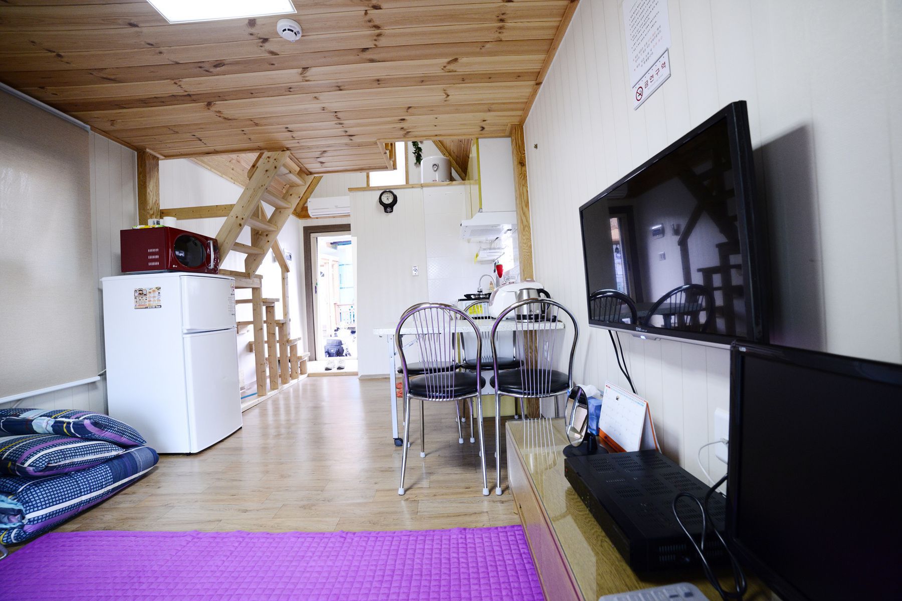 아랫층에 거실, 주방, 화장실이 있고 윗칭에 침대룸이 있는 아담한 객실이랍니다.