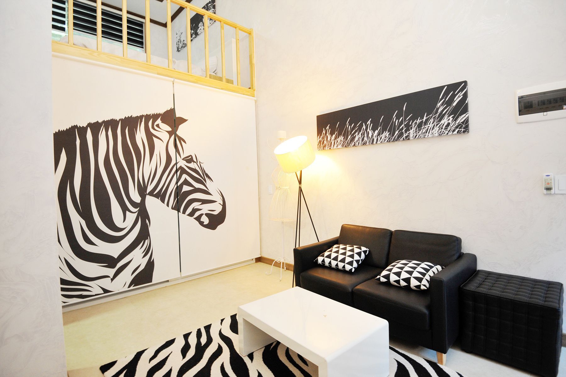 돌고래자리객실을 얼룩말무늬의 포인트가 인상적이며 궁수자리객실은 시원한 색감의 벽지가 돋보이는 객실입니다.