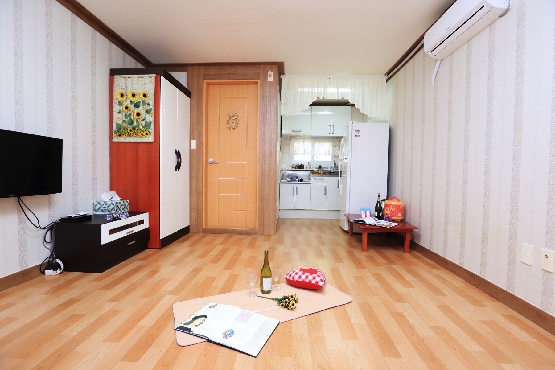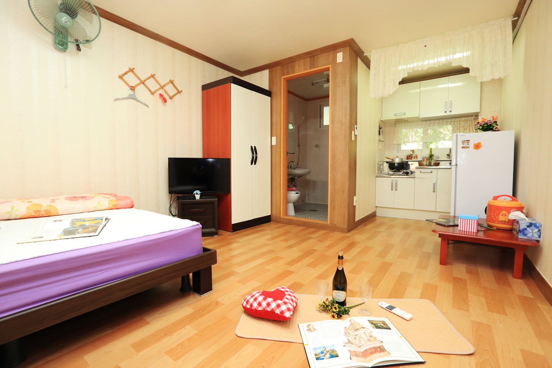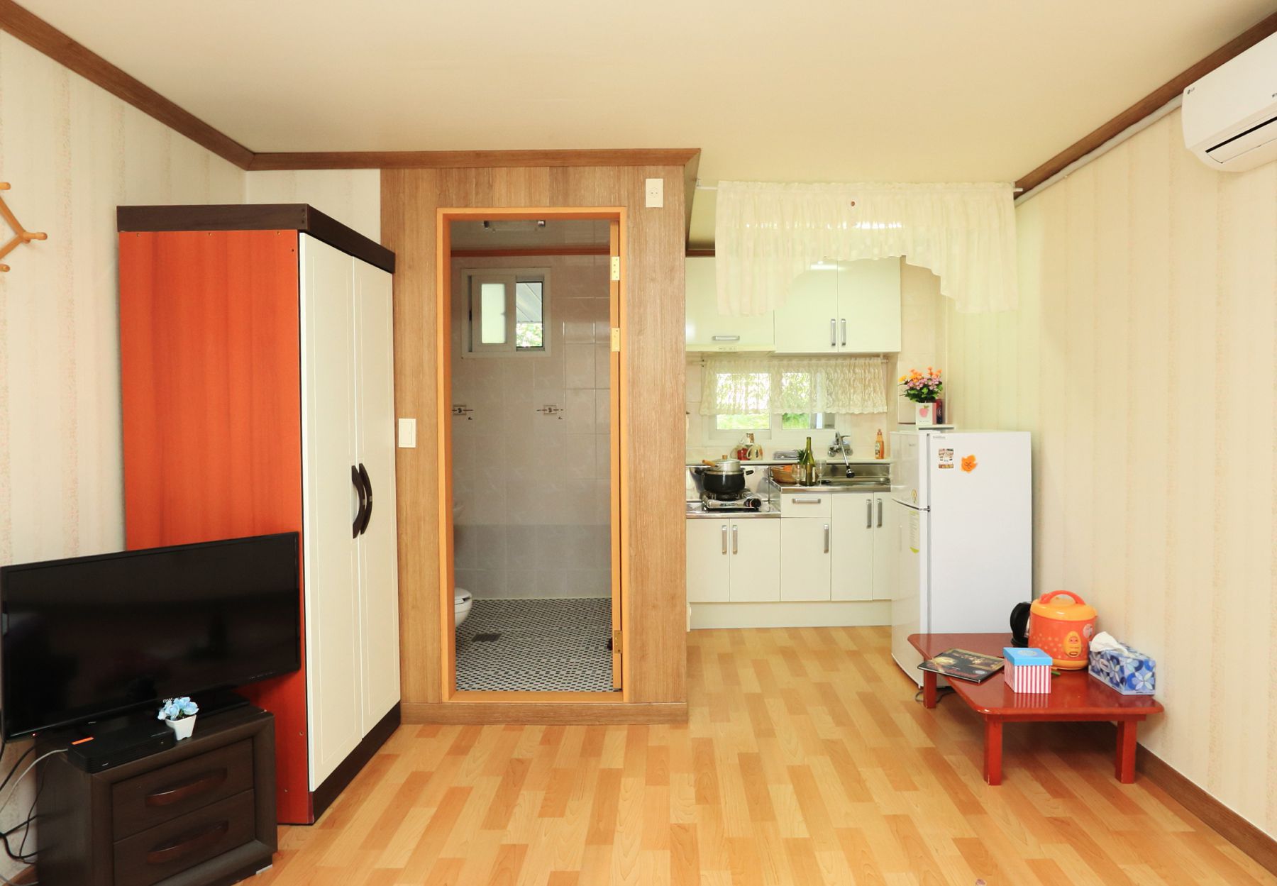 TV,에어컨,전기밥솥,전자렌지,냉장고,식기류,수건,세면도구등 아담한 객실이지만