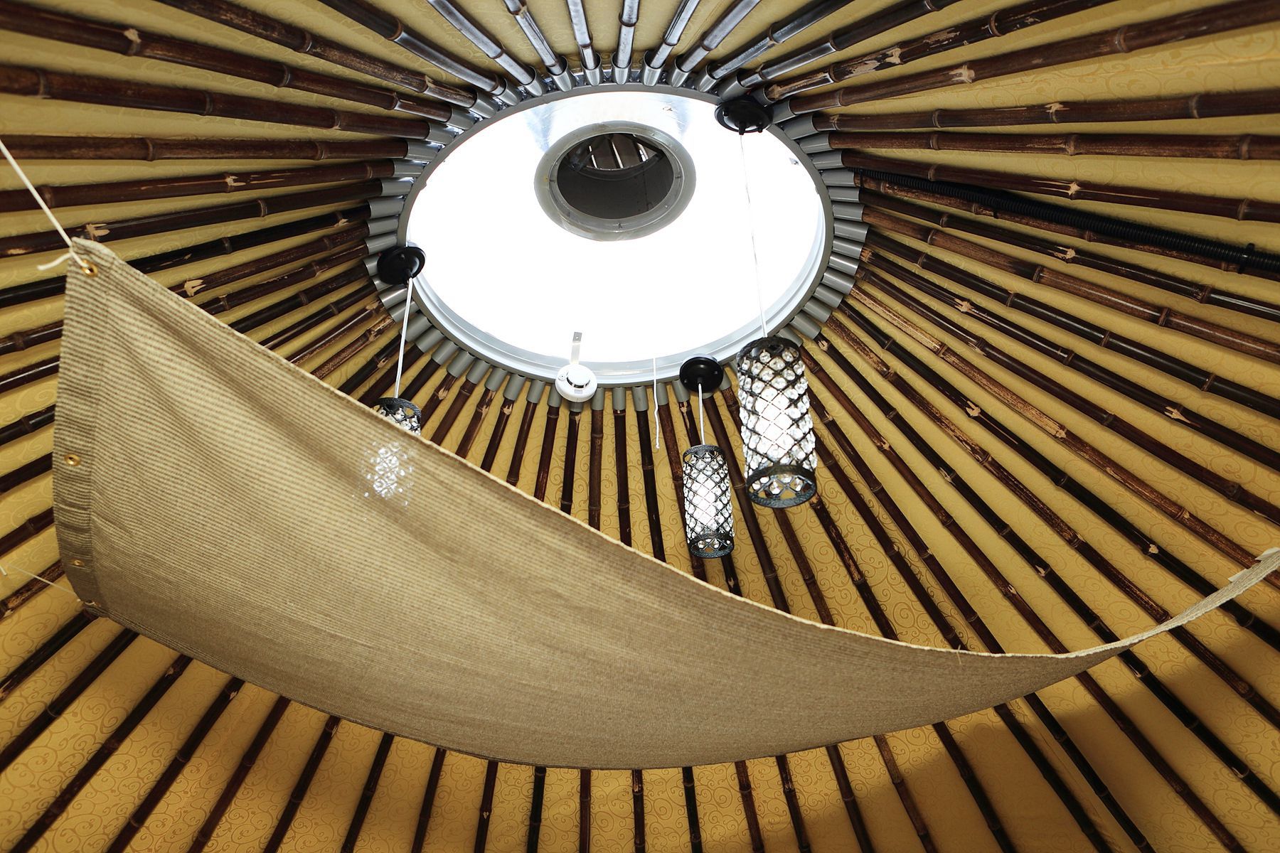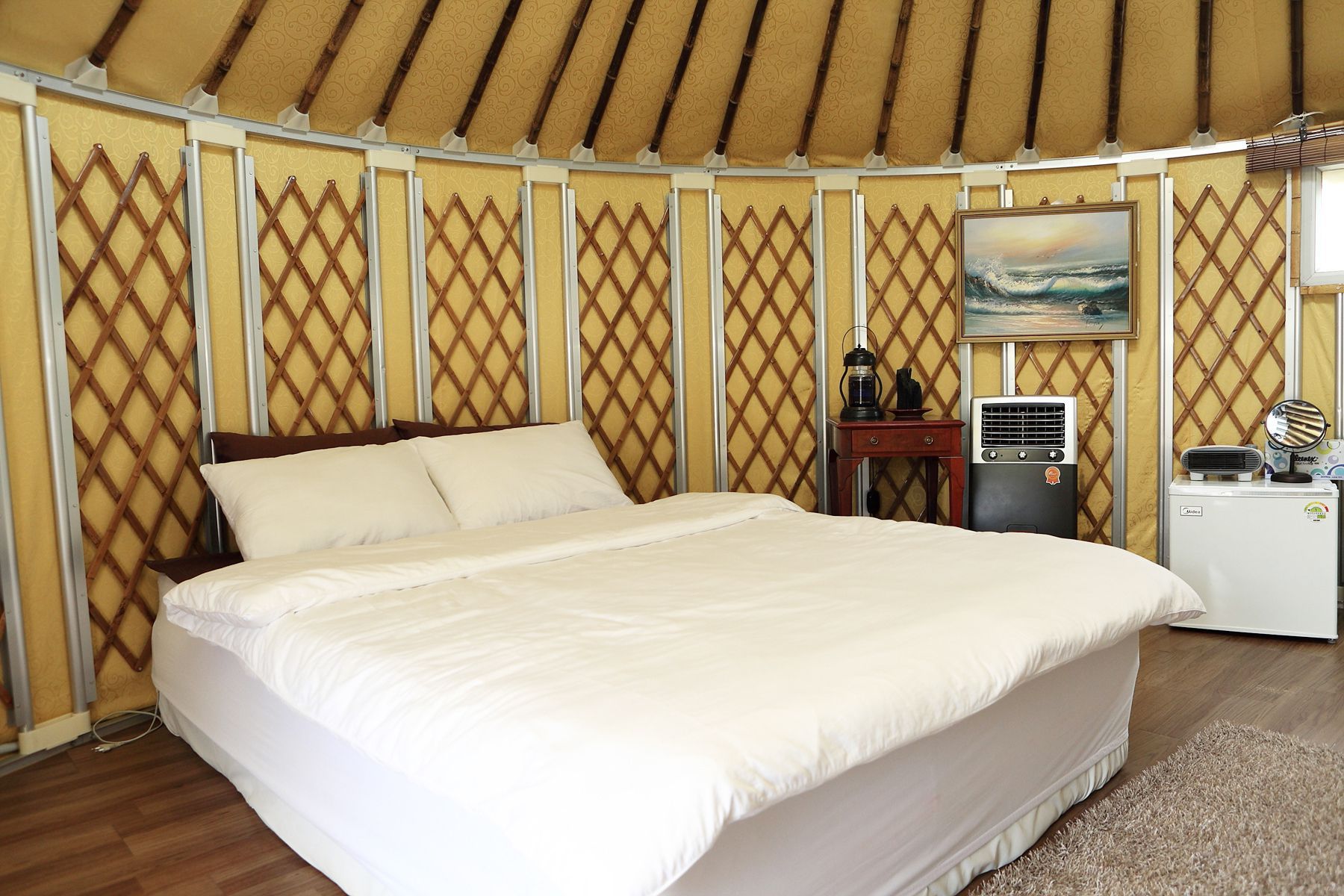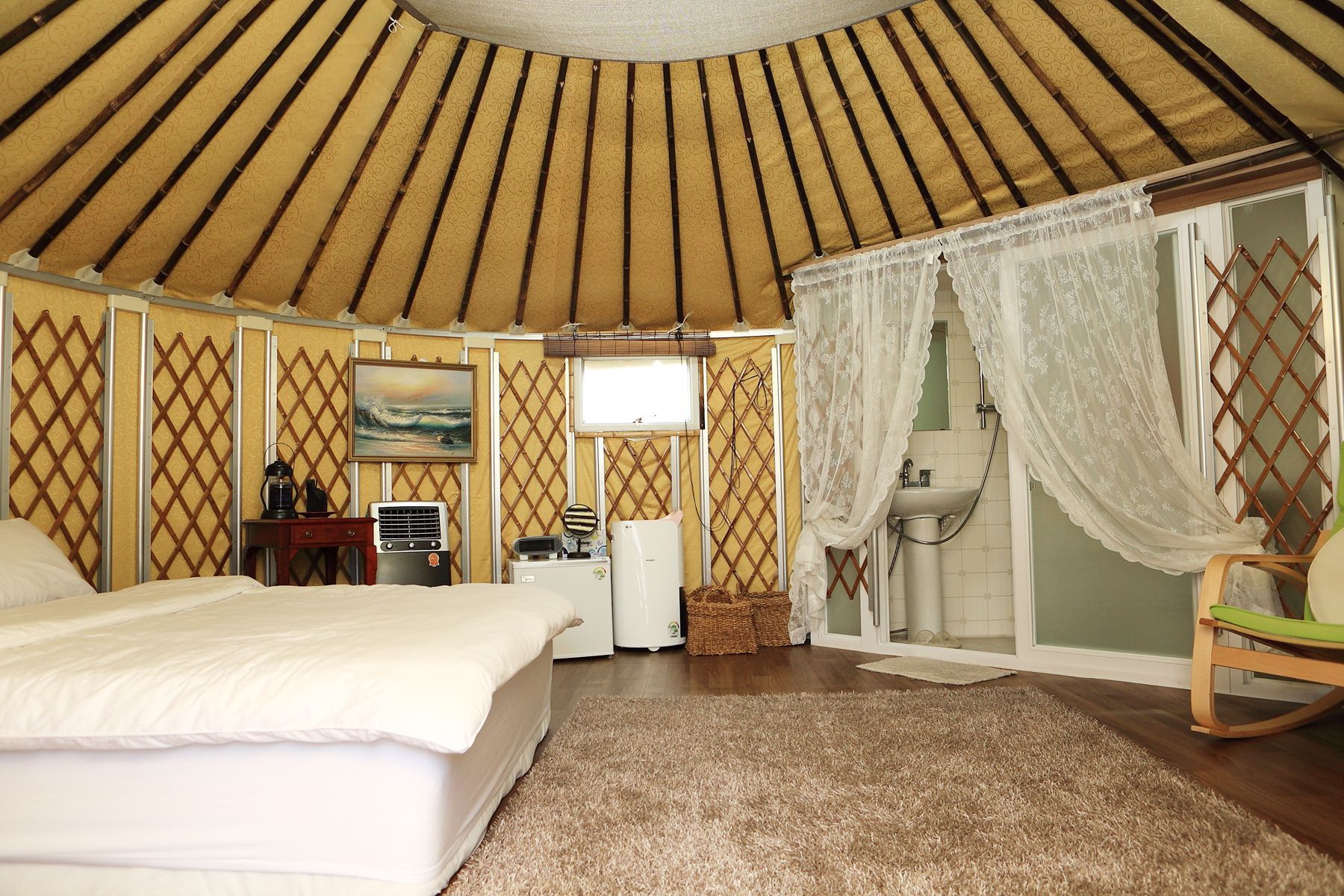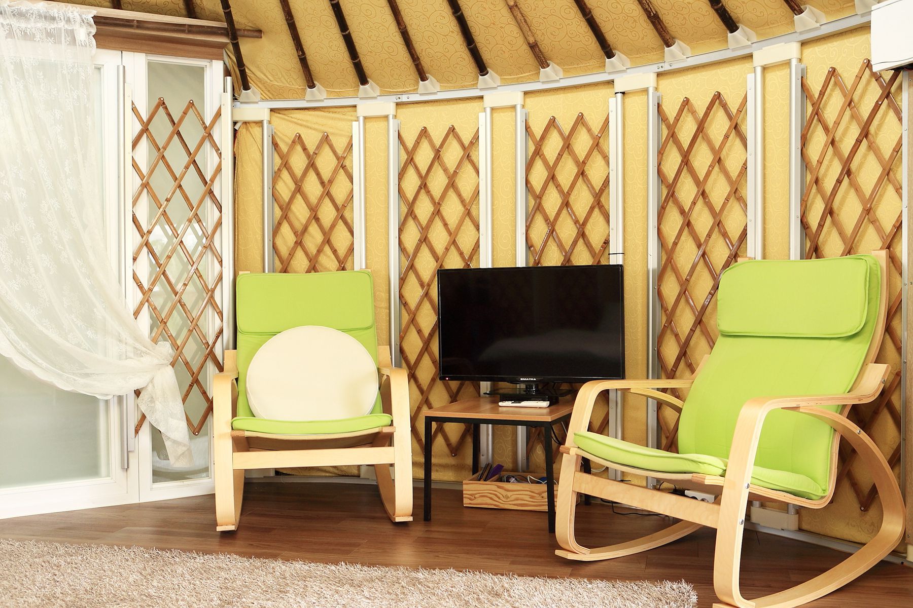 6평 이상의 넓은 게르 내부에는 침대, 냉장고, TV, 흔들의자, 해먹, 벤치 등이 마련되어 있어
