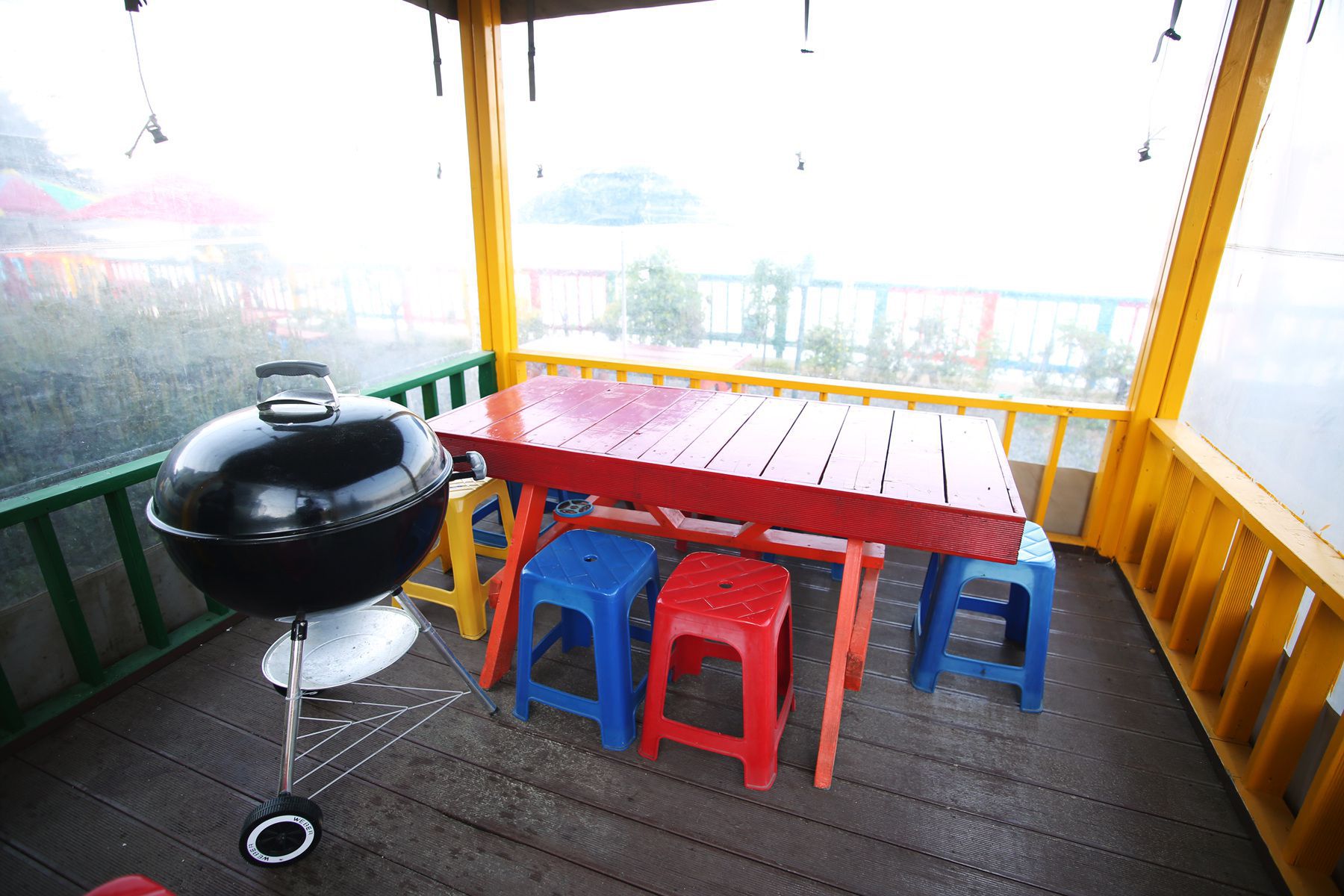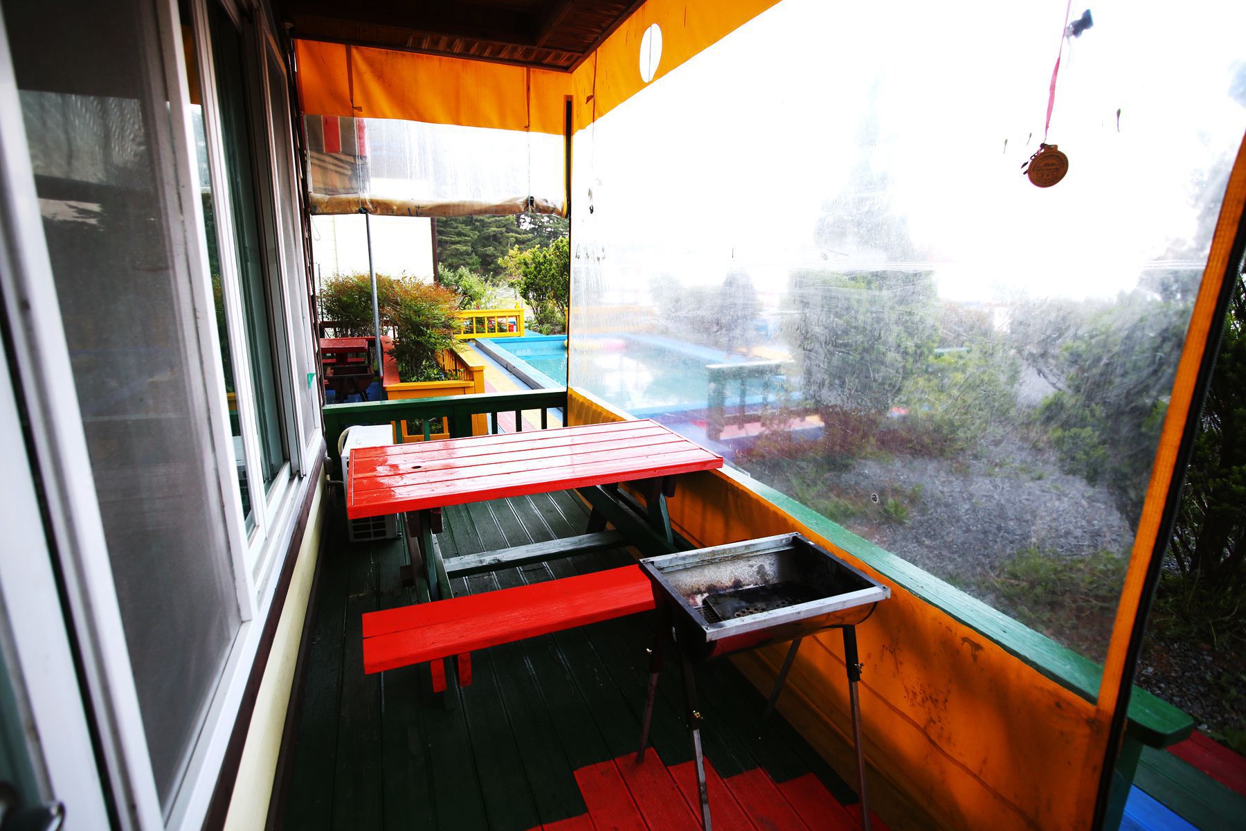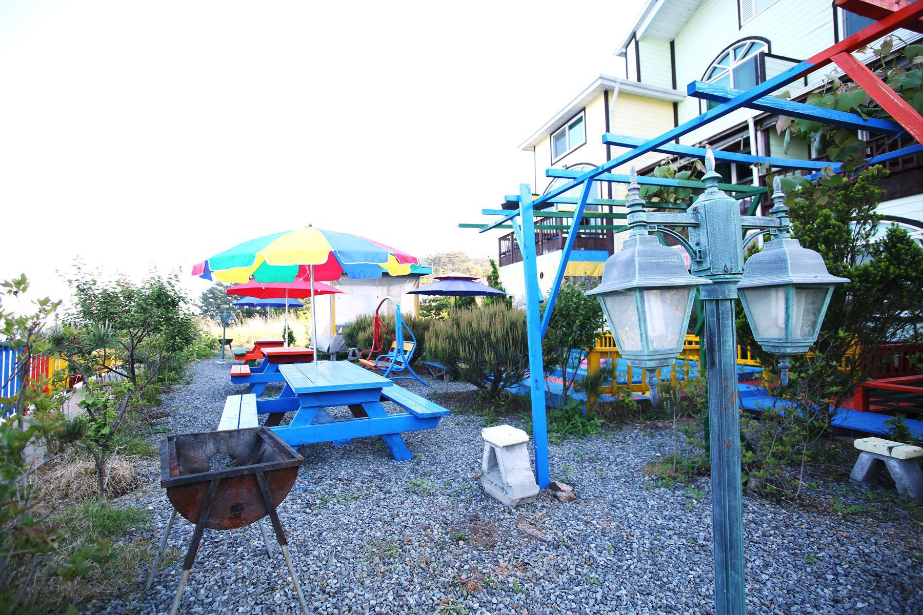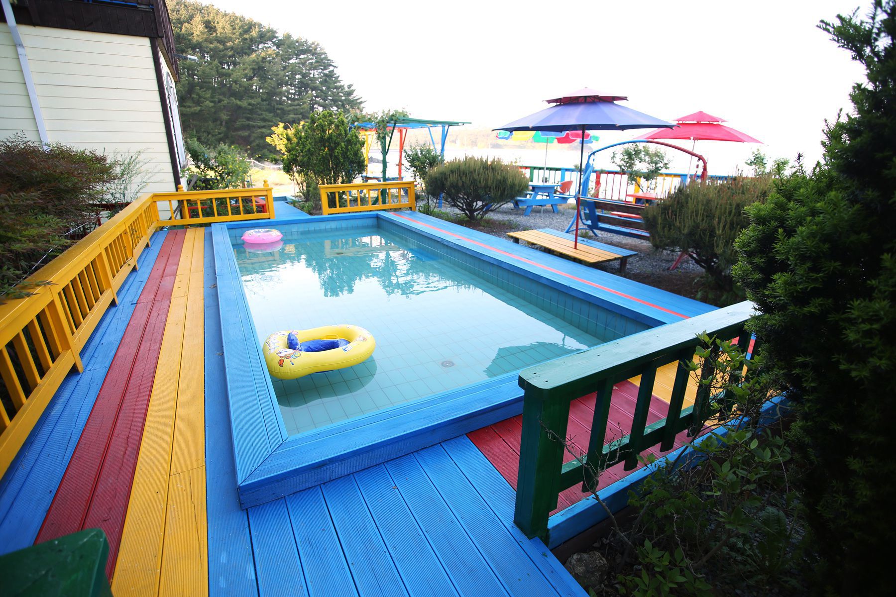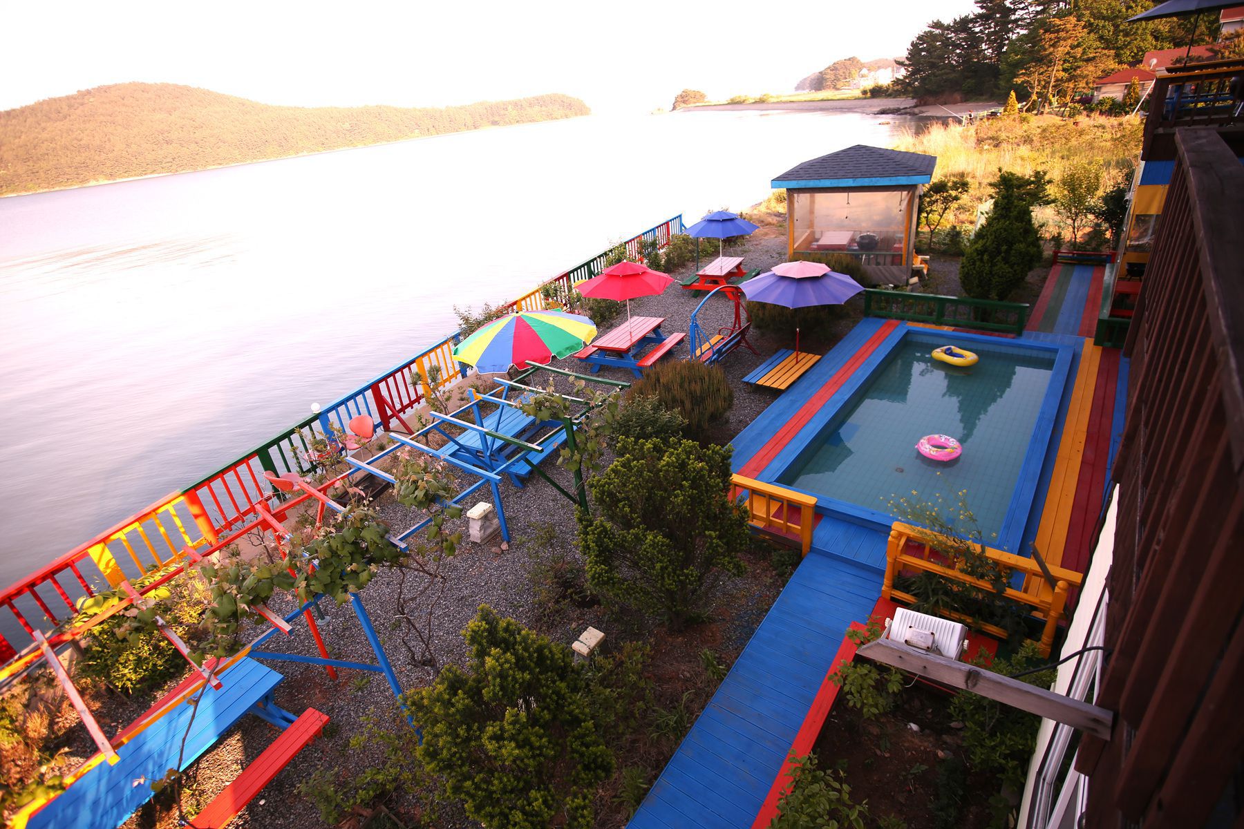펜션 앞에 보이는 푸른바다와 갯벌체험,알록달록하고 예쁜 야외수영장,바베큐 그릴등