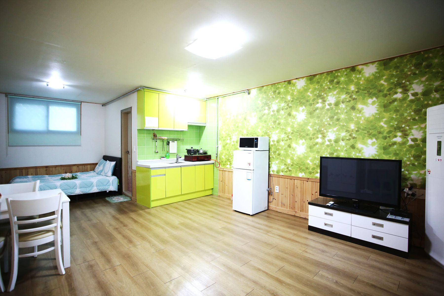 침대+화장실+주방+바베큐시설이있는 개별테라스로 구성되어있으며 그린객실은 같은구성에 거실이 포함됩니다.