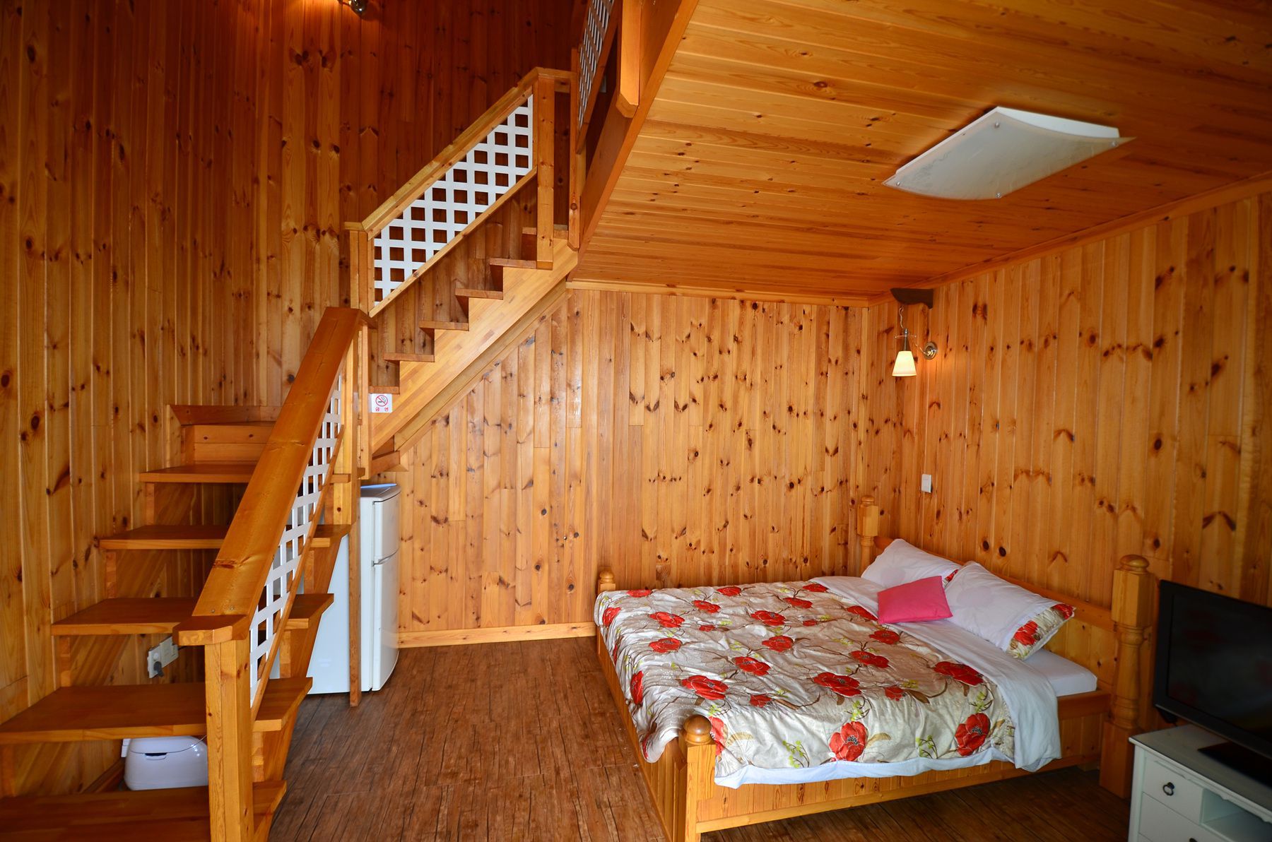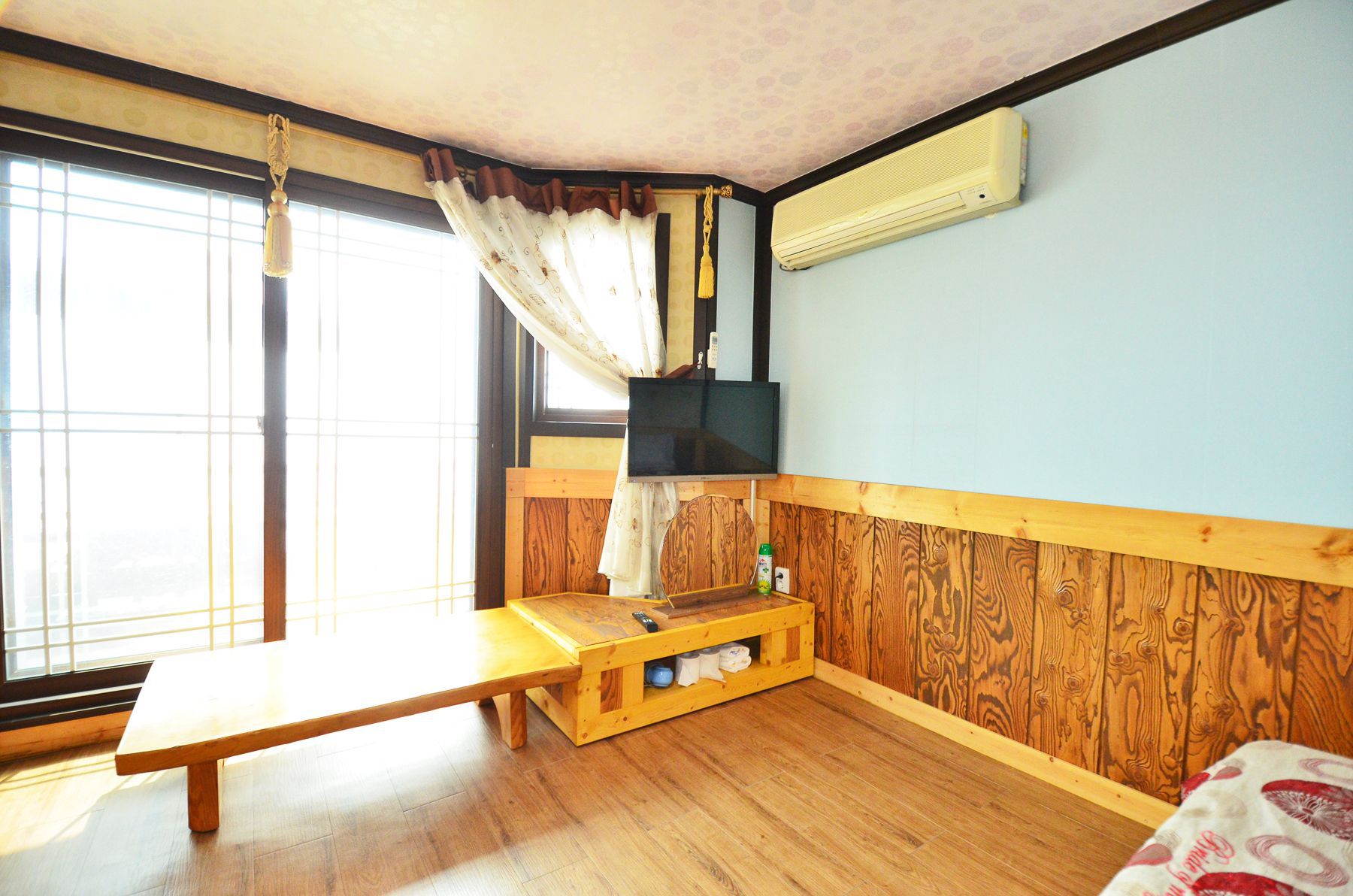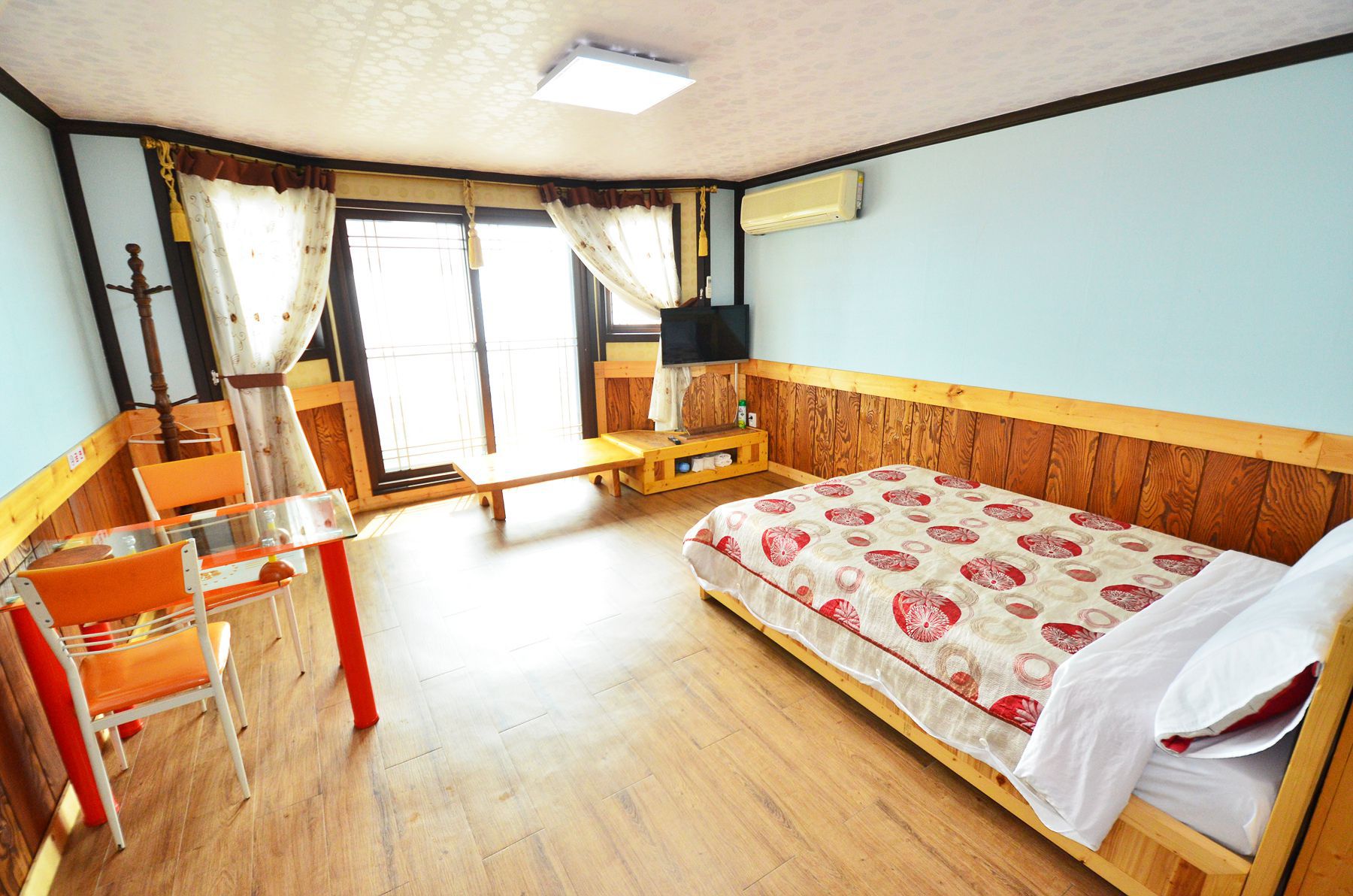 4인기준 객실이며 침대, TV, 에어컨, 드라이기,식탁, 싱크대, 냉장고,