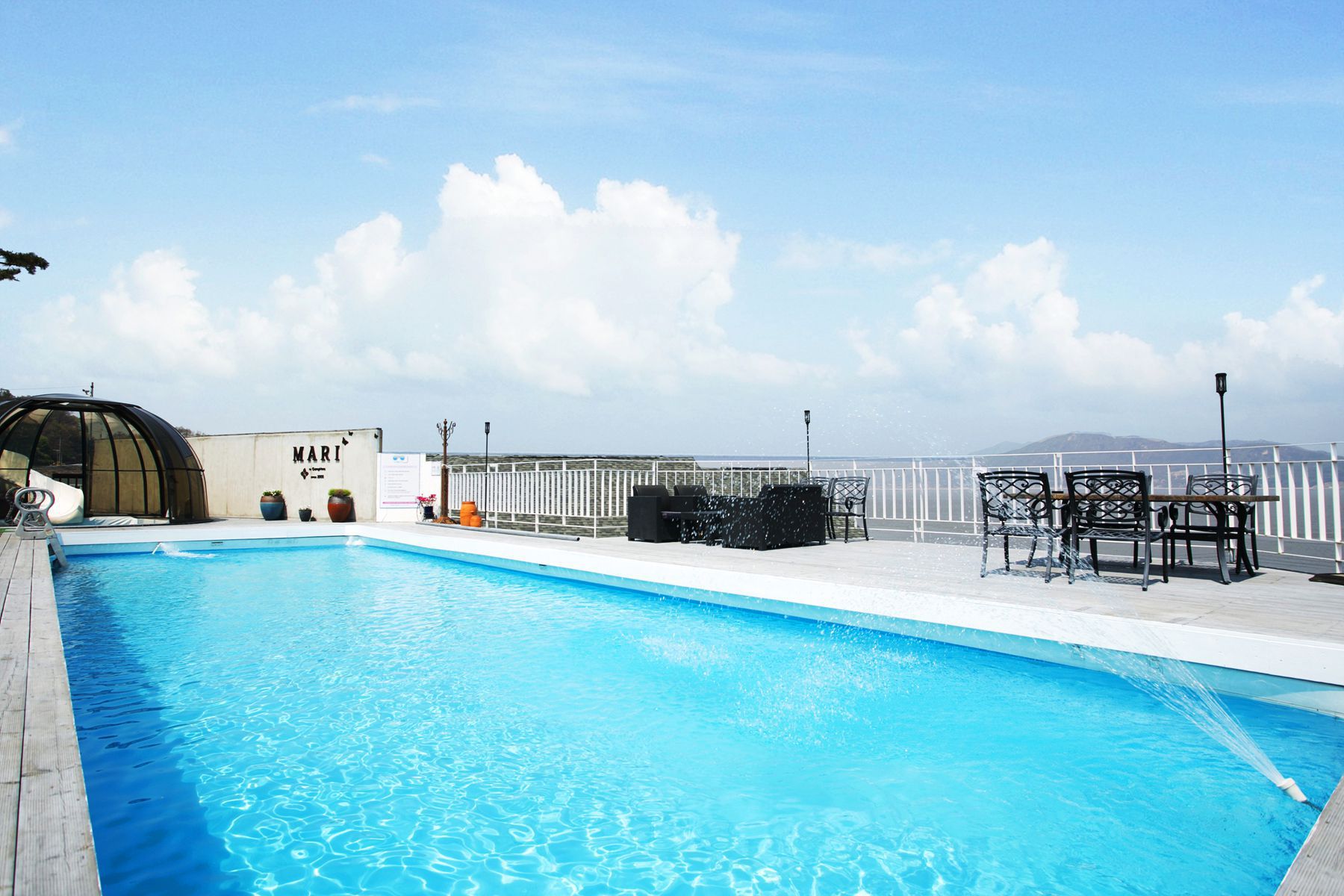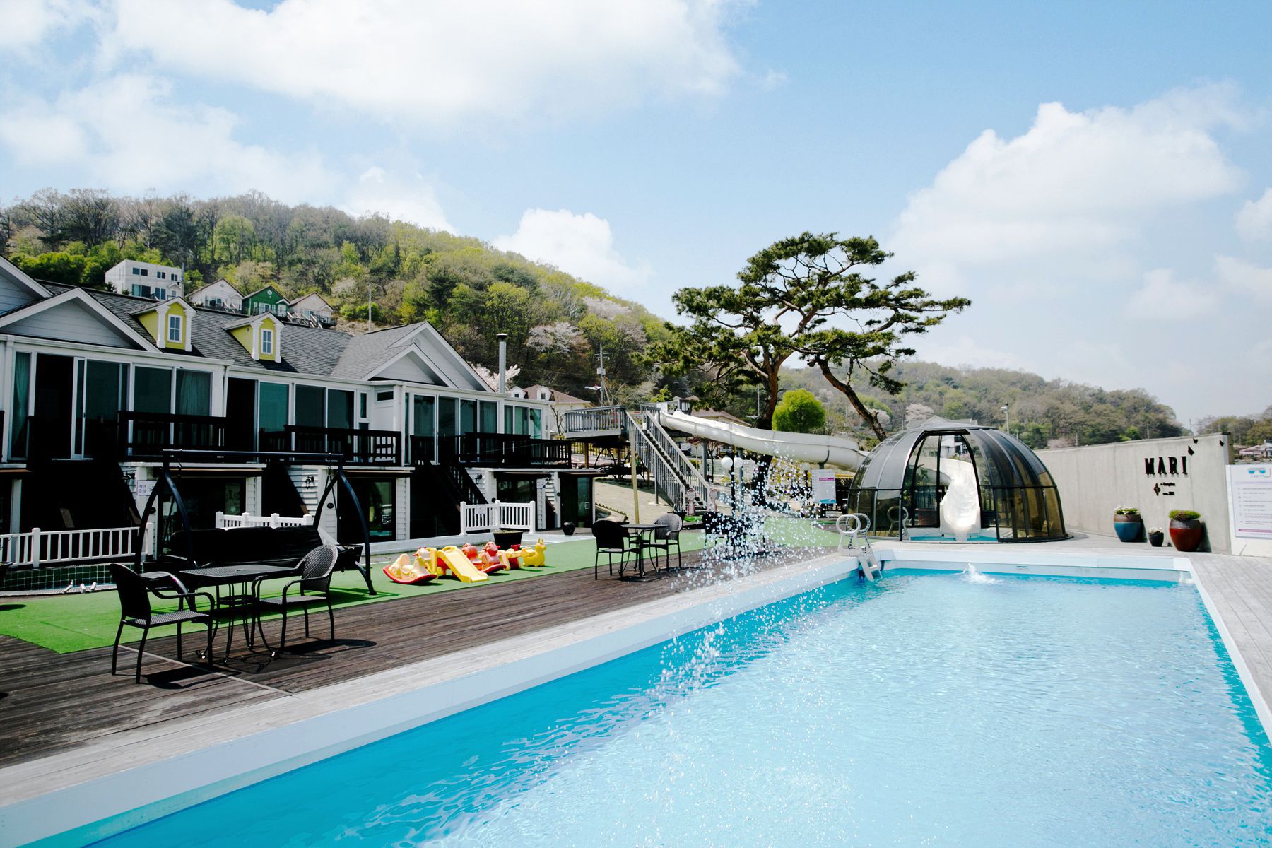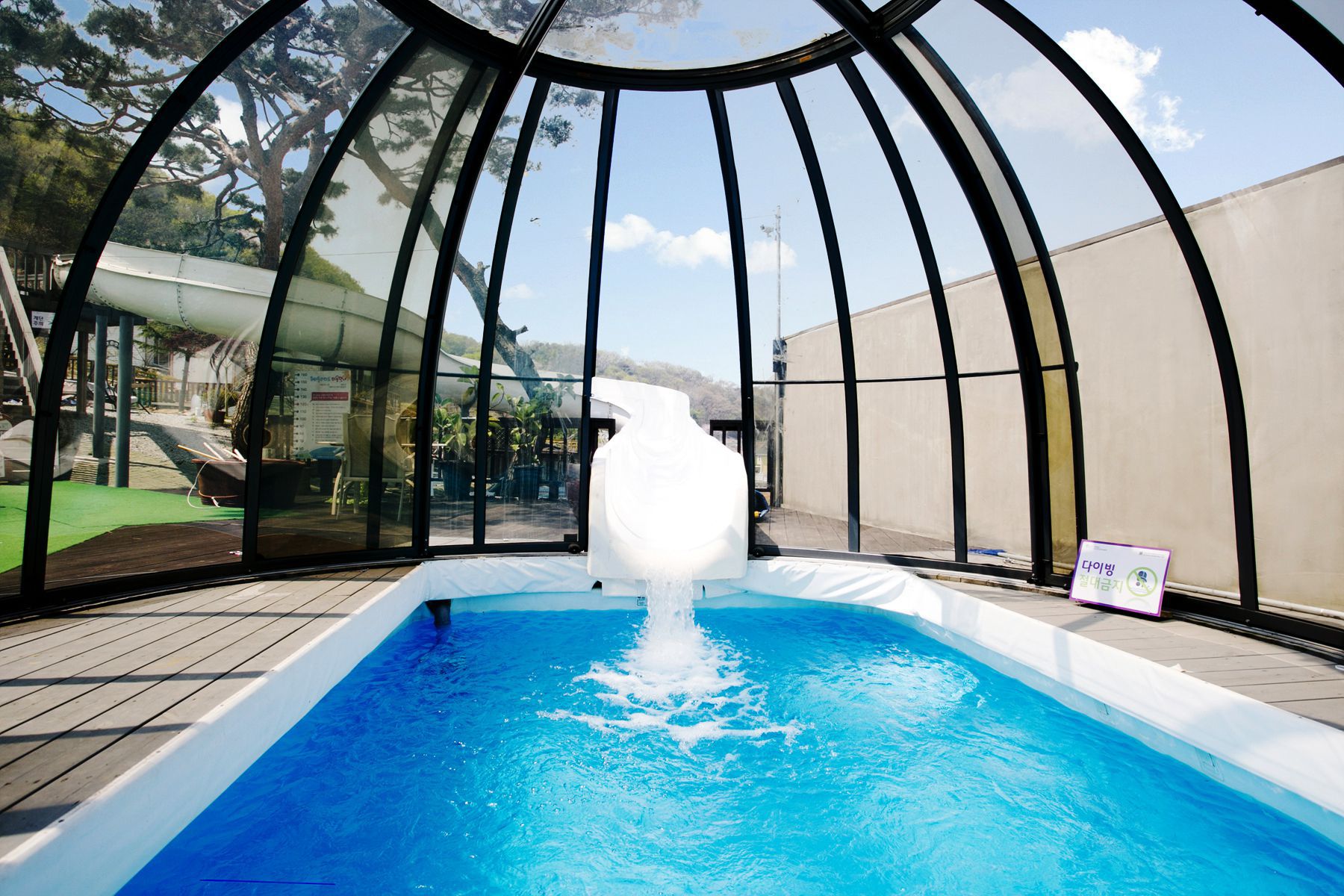 펜션 마당에는 보기만해도 시원한 바다를 보며 즐길 수 있는 온수 워터슬라이드와 수영장이 완비되어 있어 천상의 휴식을 즐기실 수 있으며