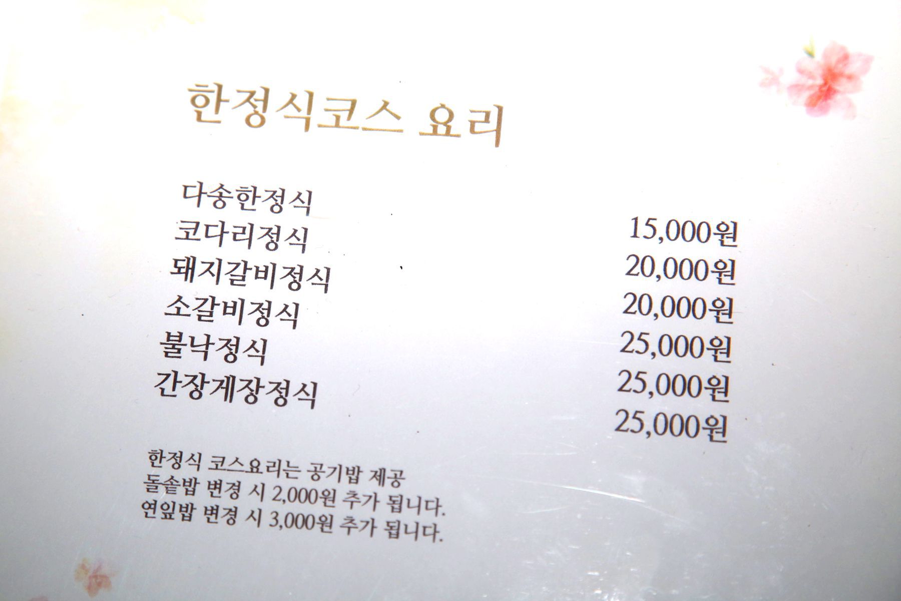 갈비찜정식, 게장정식, 갈치조림, 연잎밥등 다양한 식사류가 준비되어 있습니다.
