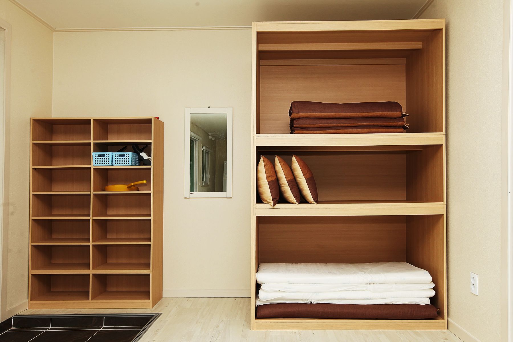 단체객들의 짐과 신발들을 가지런히 정리할 수 있도록 넉넉한 신발장과 수납장, 침구류또한 깨끗한상태로 넉넉하게 준비되어있습니다.