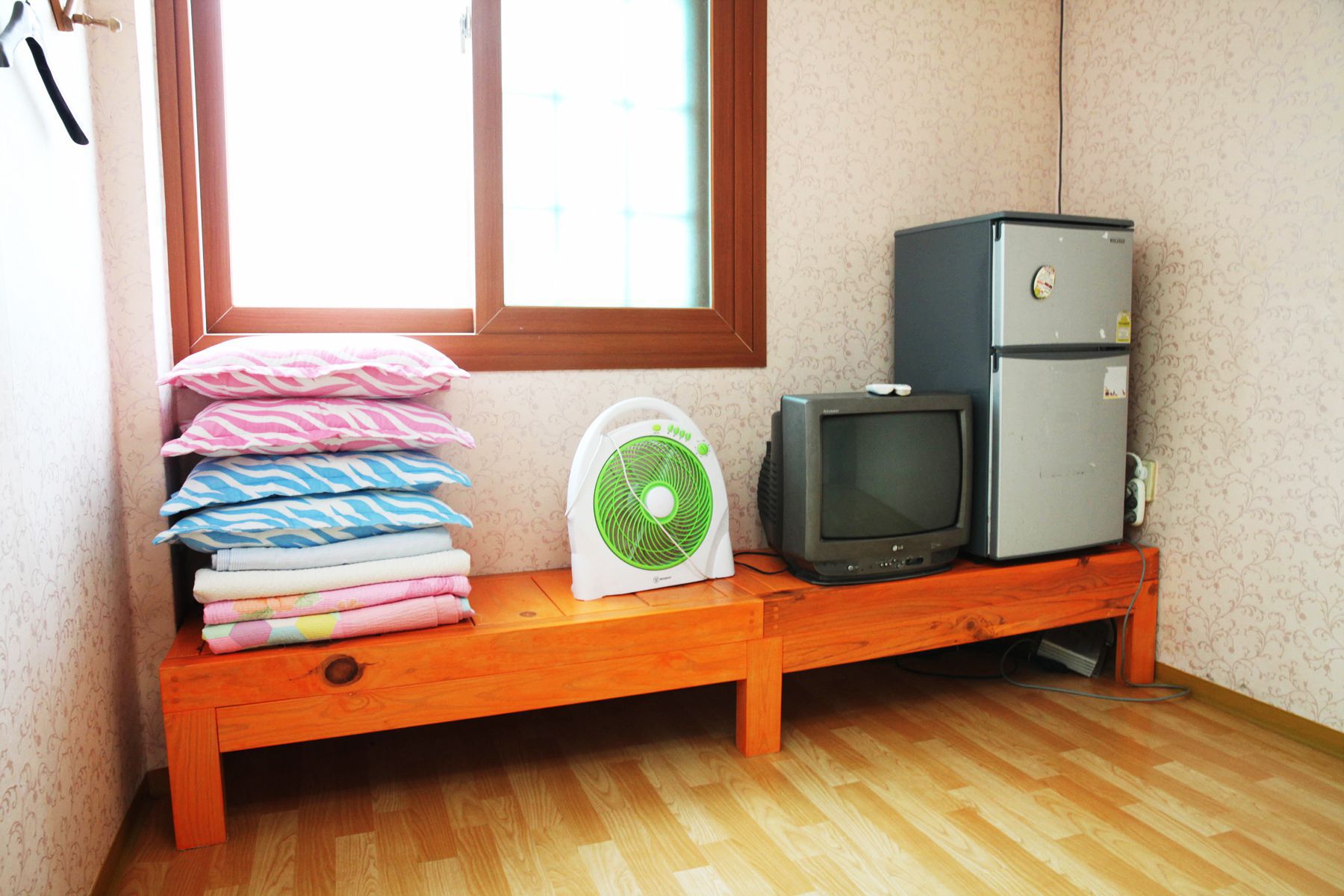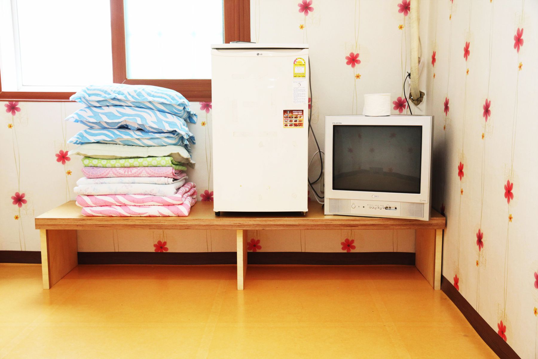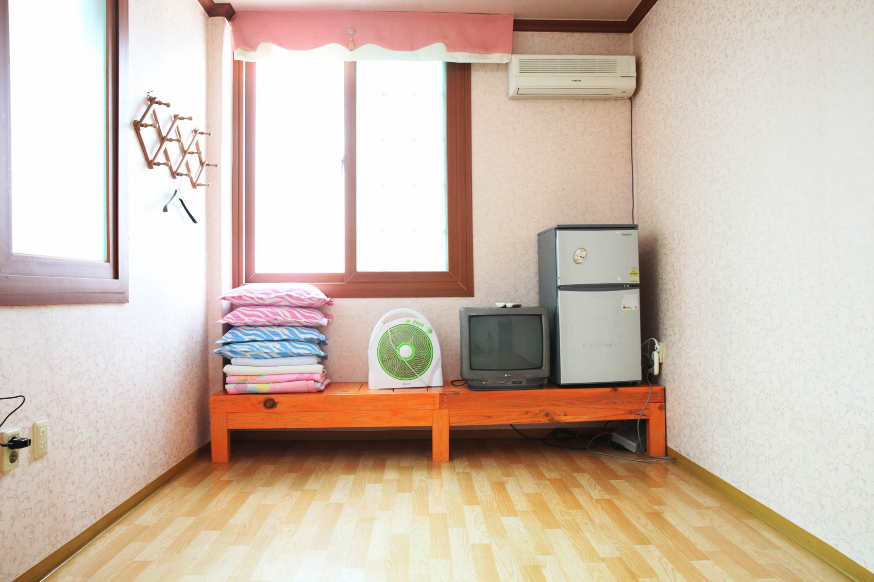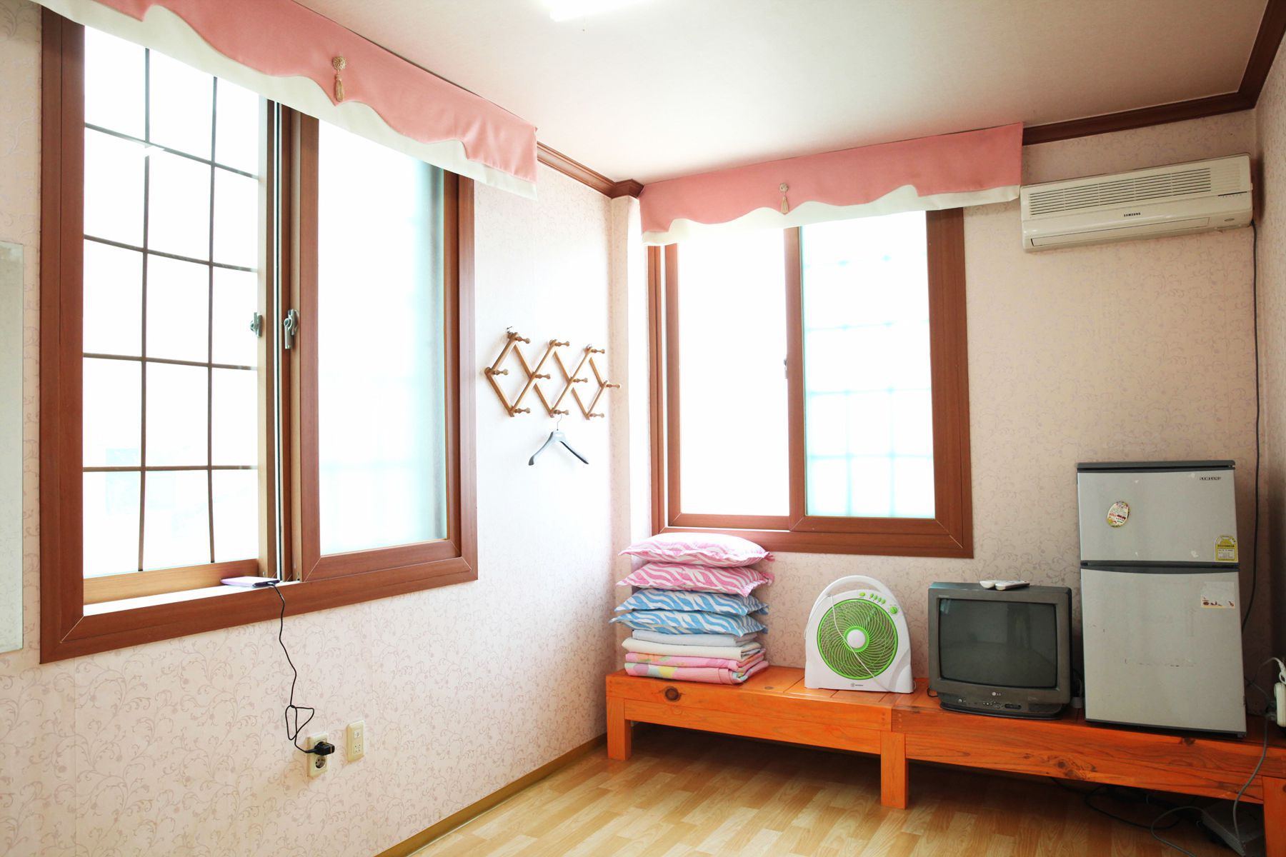 객실 또한 깨끗하게 청소가 되어 있고 에어컨, TV, 냉장고 등 이용에 편리한 물품과 가전이 구비되어 있으며