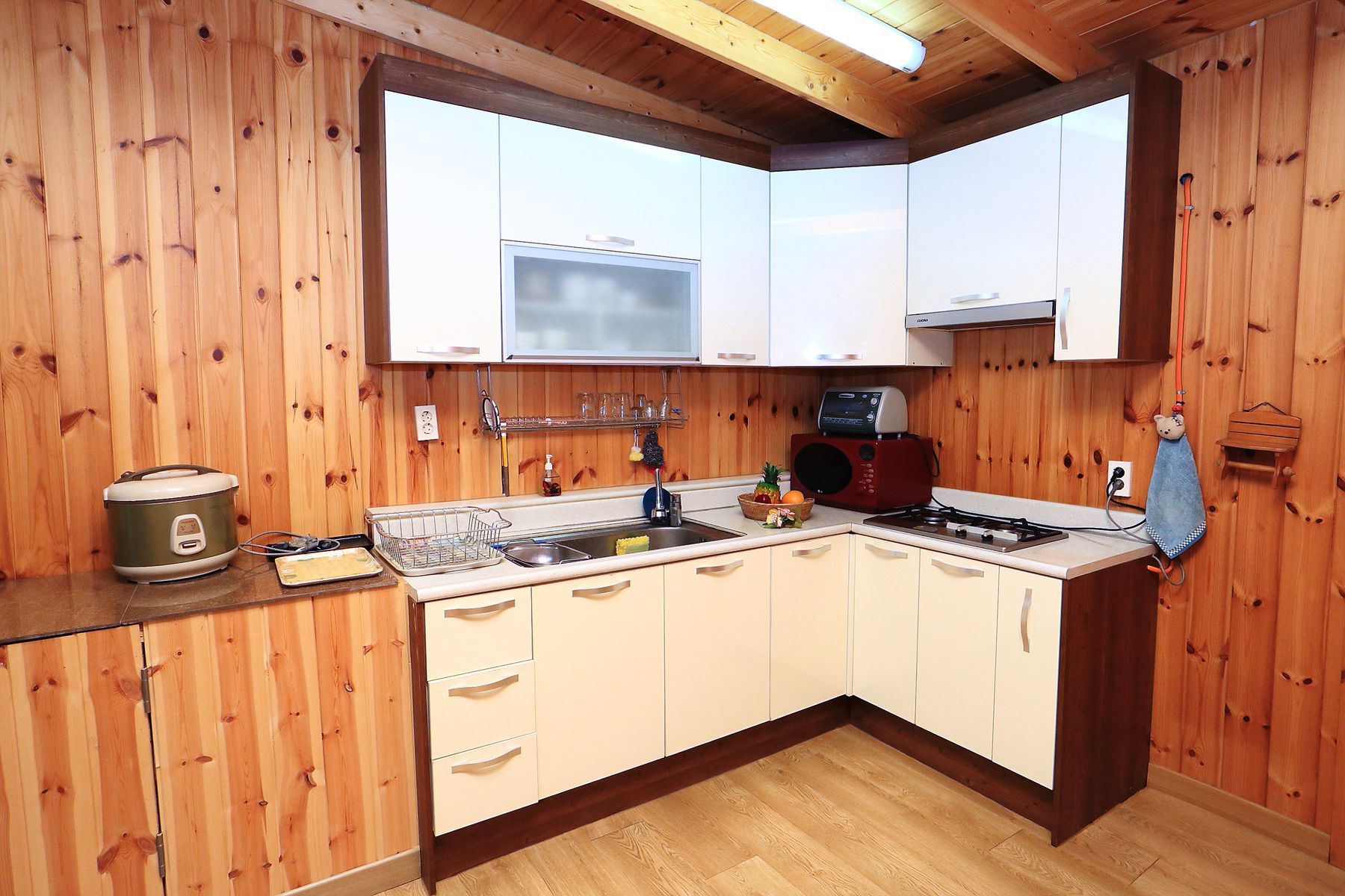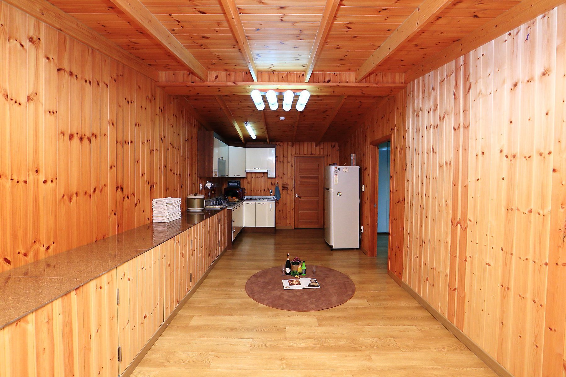유럽 형식의 건물인 '하얀펜션'은 취사를 할 수 있는 공간에 원목테이블을 갖춰 놓았으며