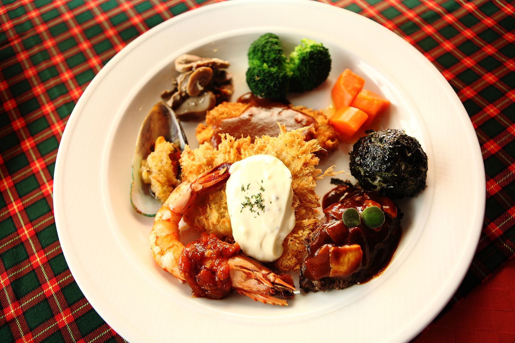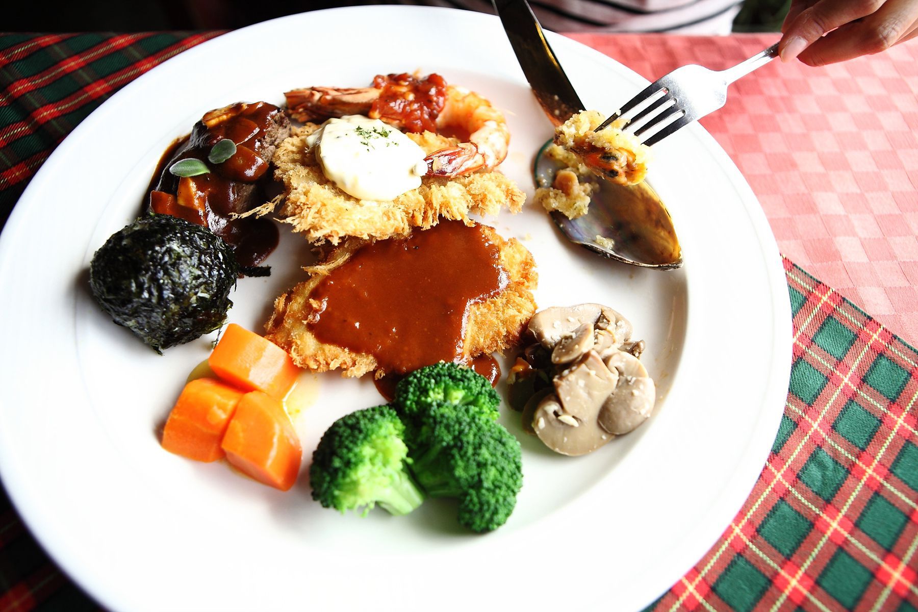 예전정식에는 돈까스, 생선까스, 스테이크, 새우, 그린홍합 등 여러가지 요리가 한 접시에 담깁니다.