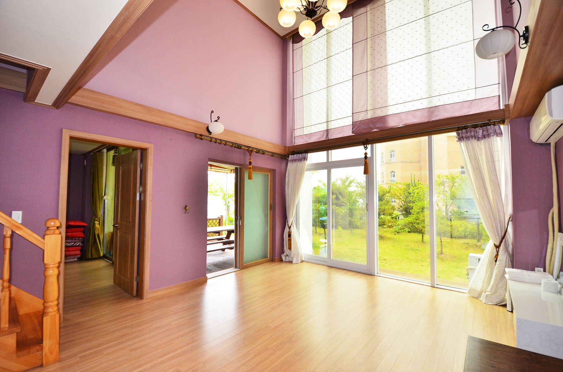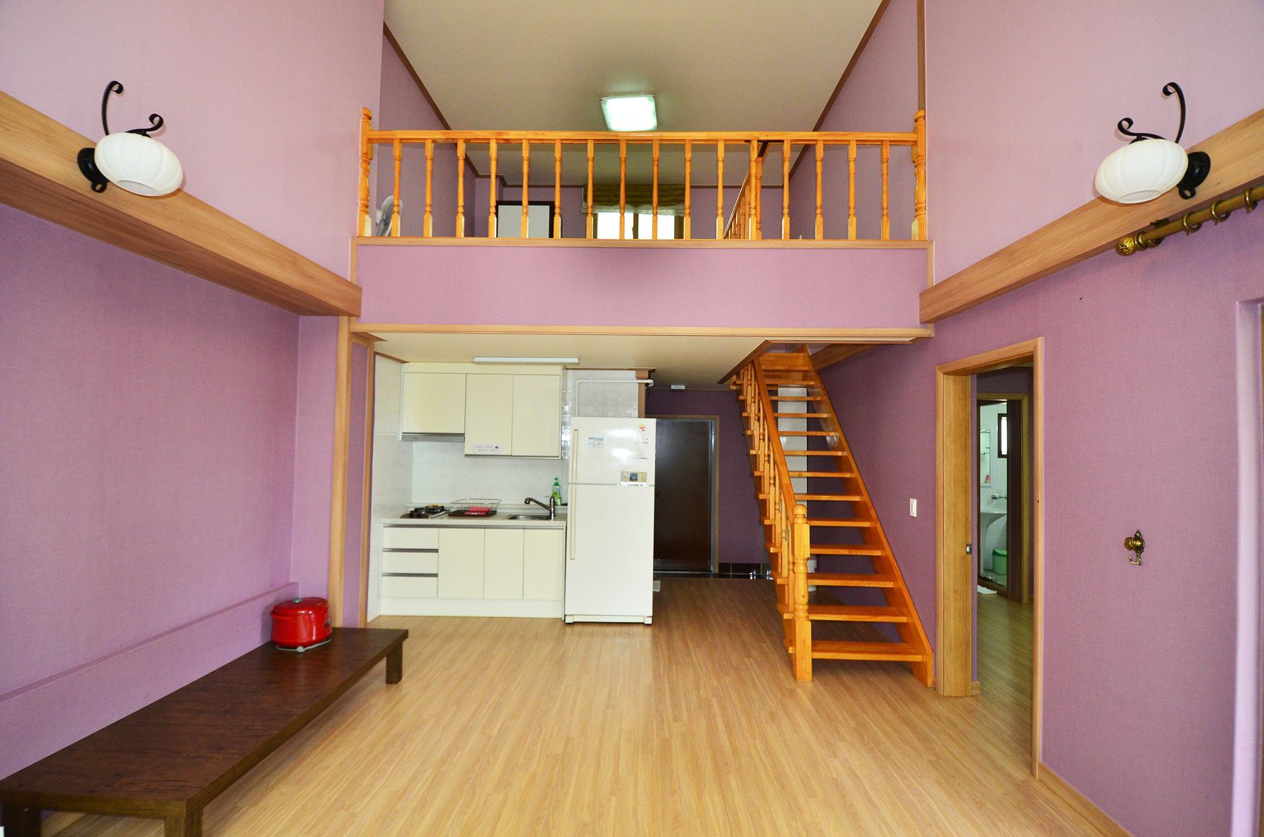 침대가 있는 방과 거실, 윗층도 방으로 이용 가능해 많은 인원이 함께 사용하기에도 좋습니다.